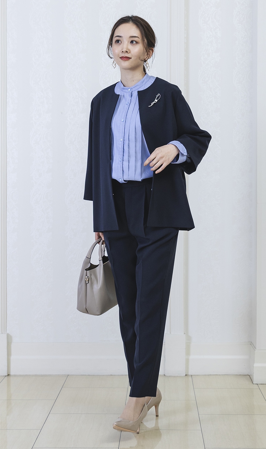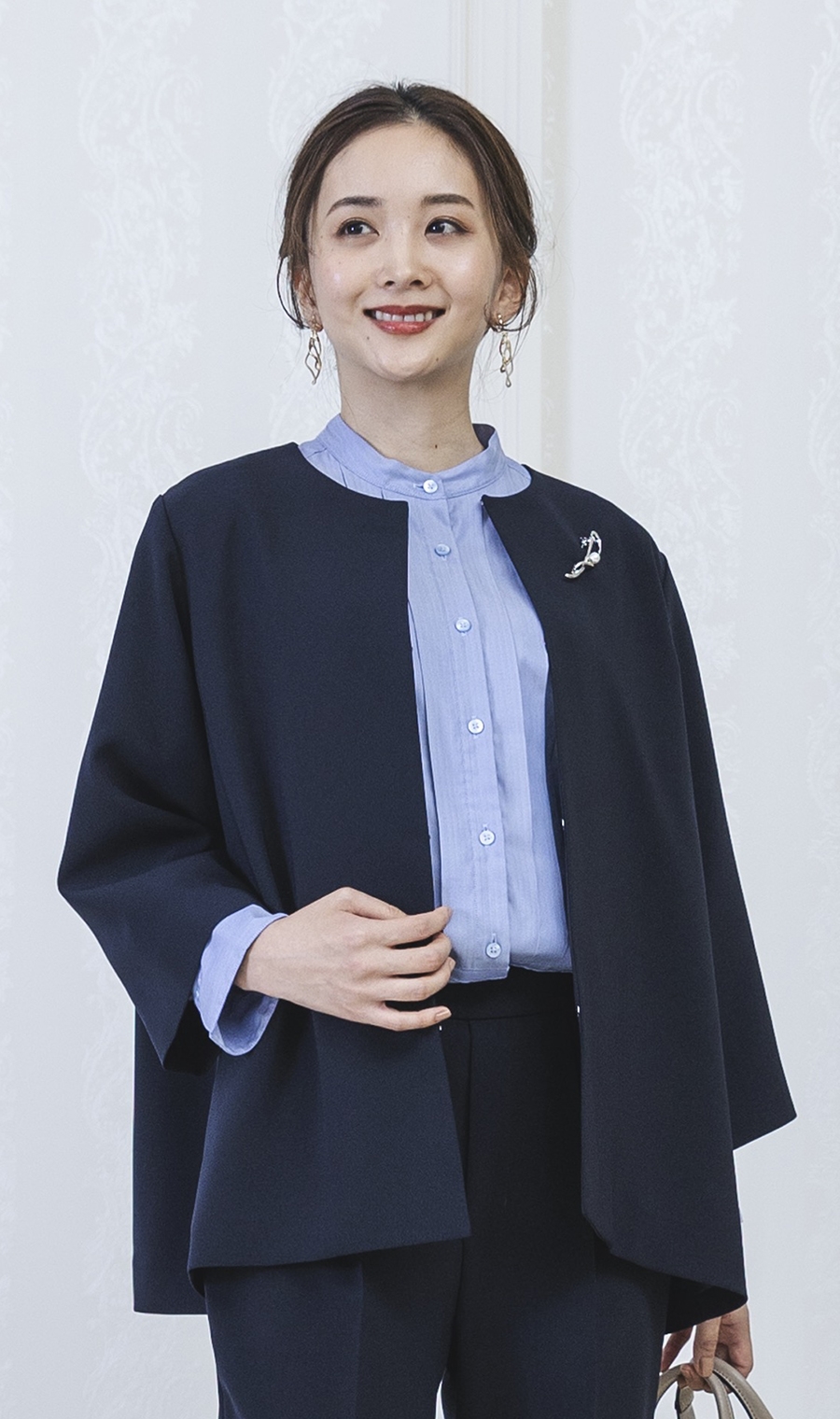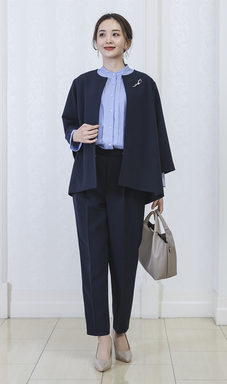 Aラインシルエットが特徴的なノーカラージャケットとテーパードパンツの
