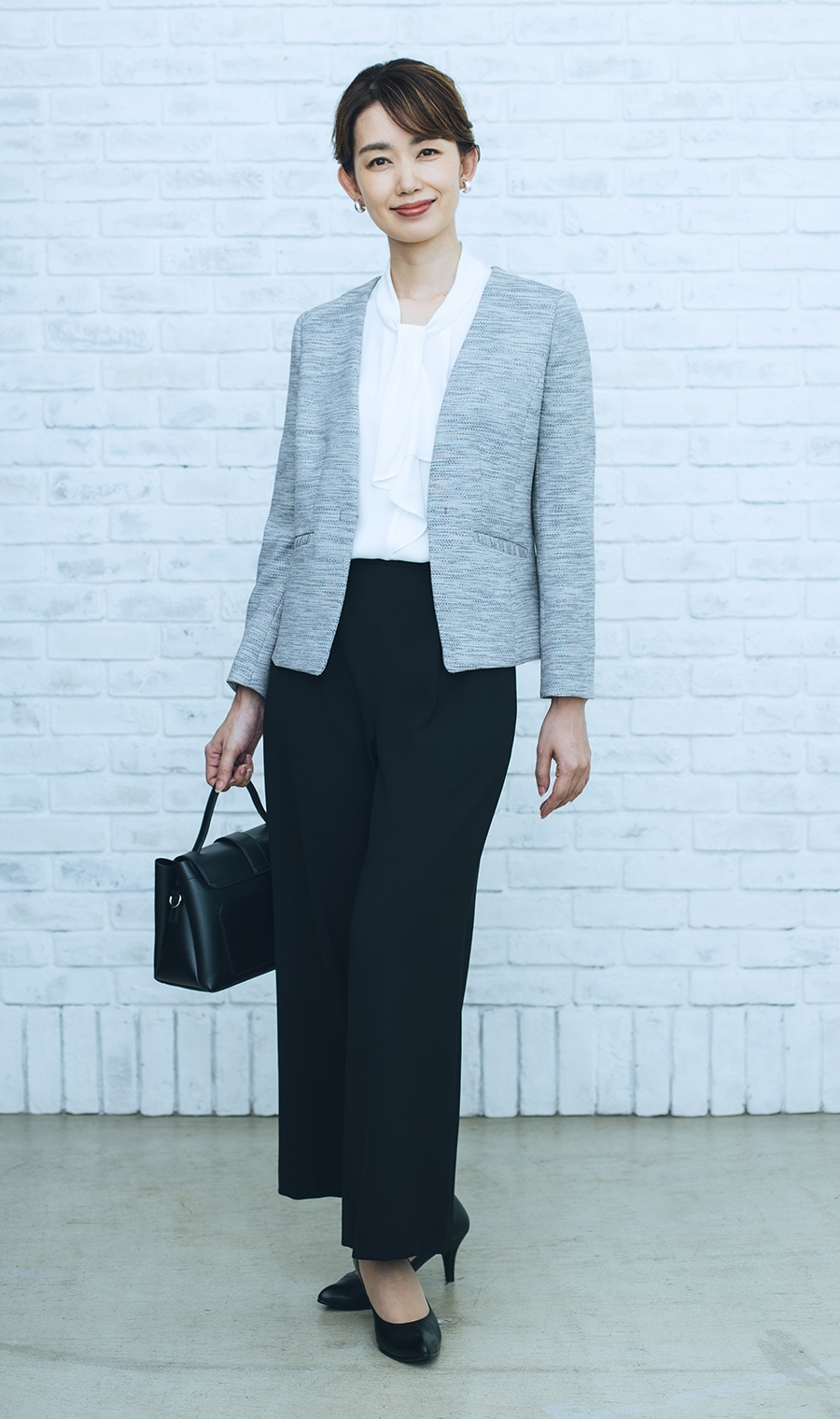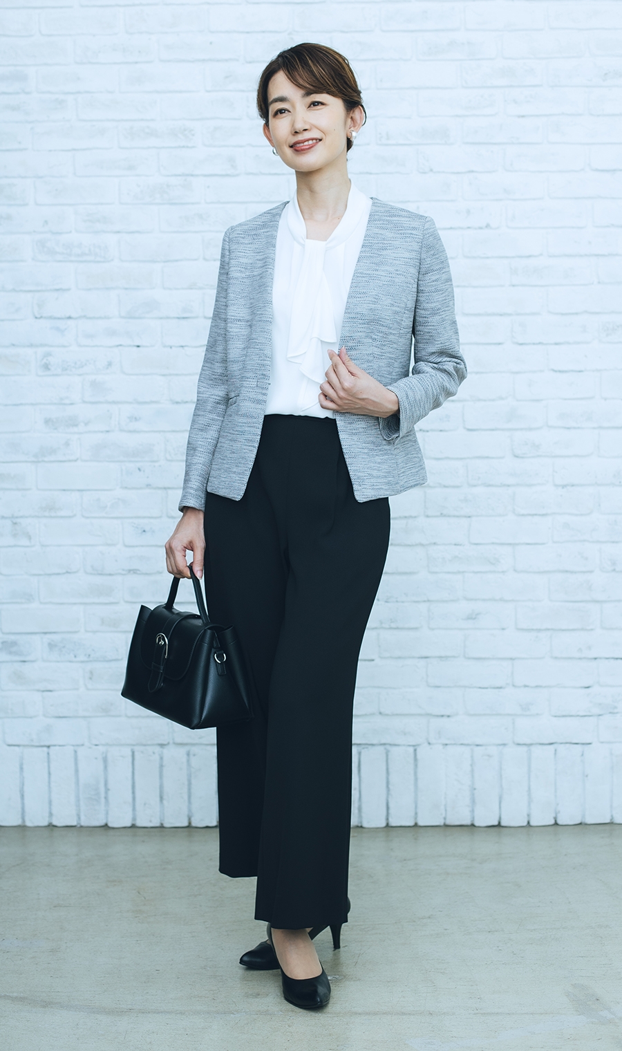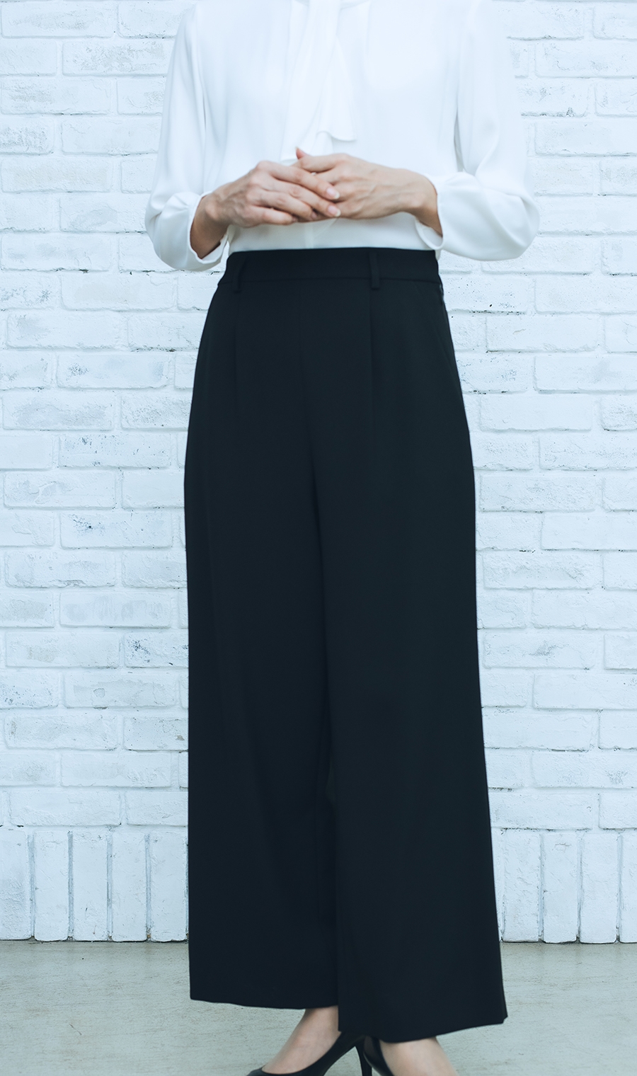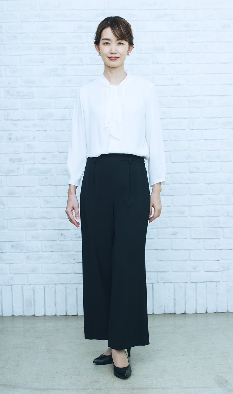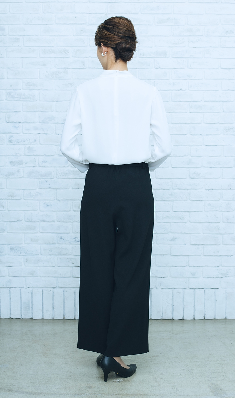 ボウタイ風ブラウスとワイドパンツの組み合わせのセレモニーフォーマルです。