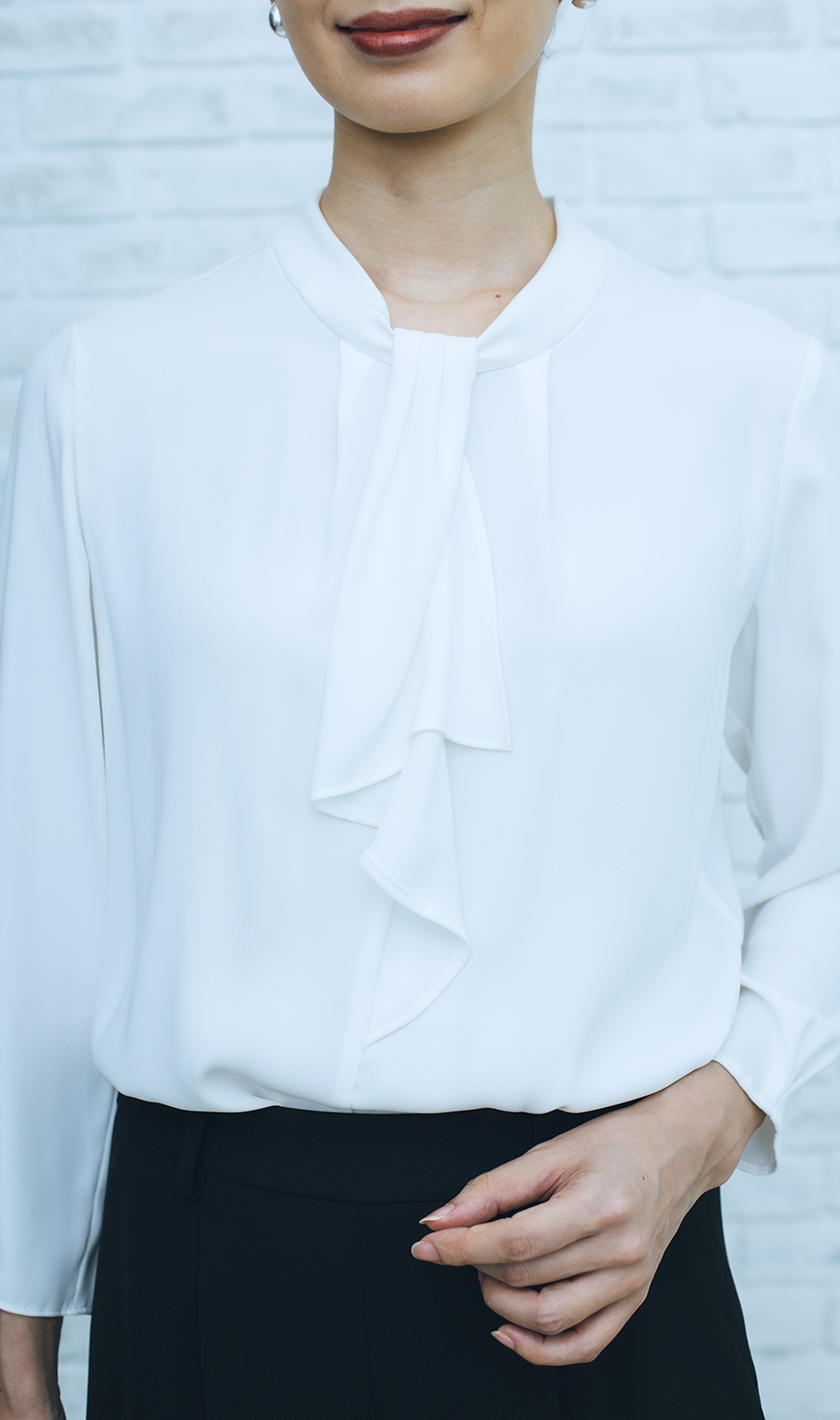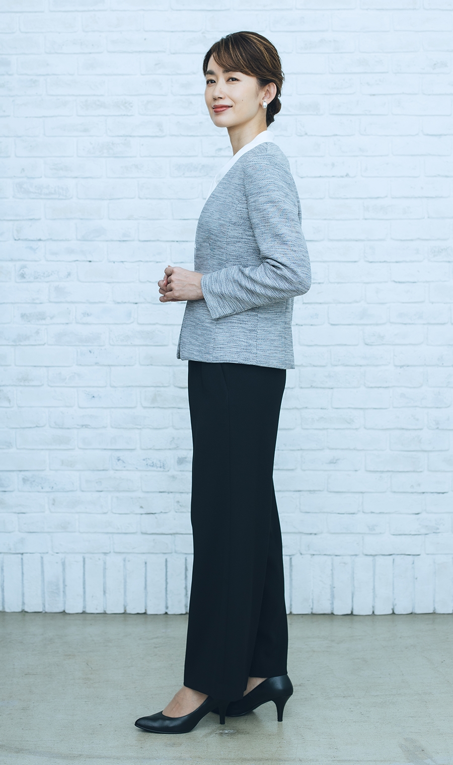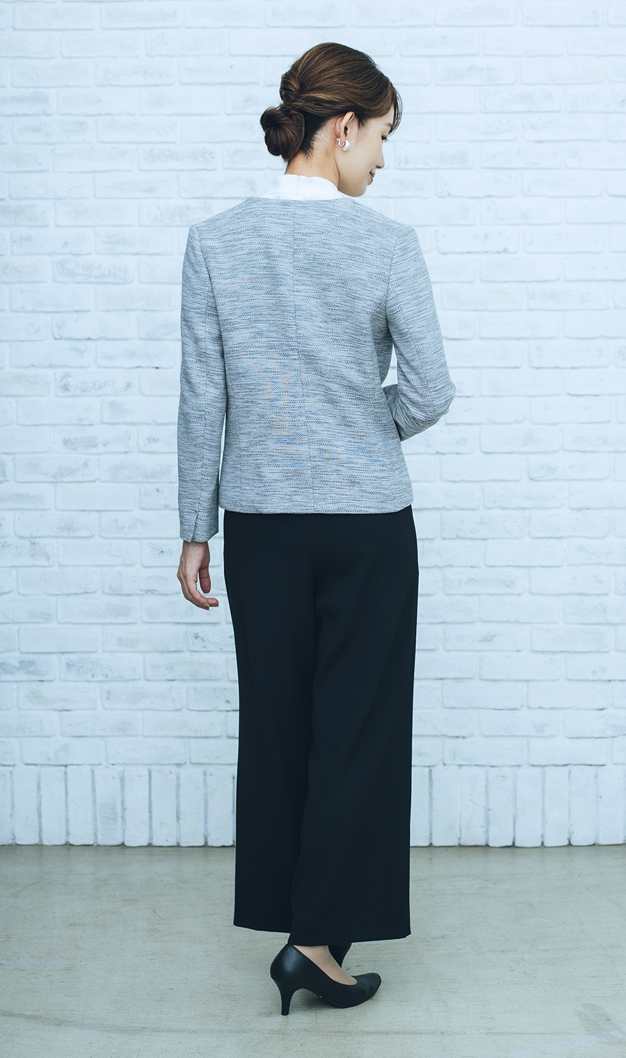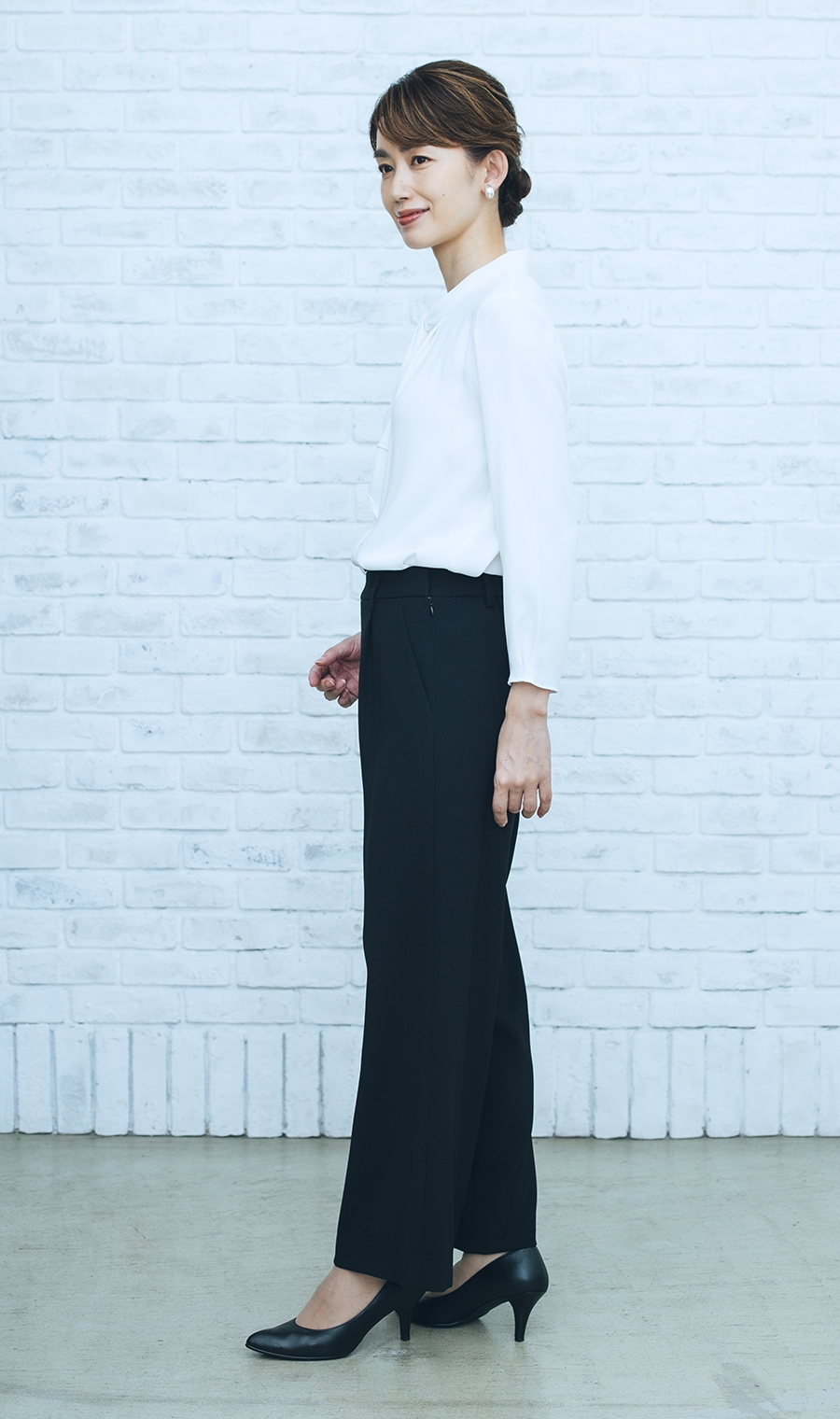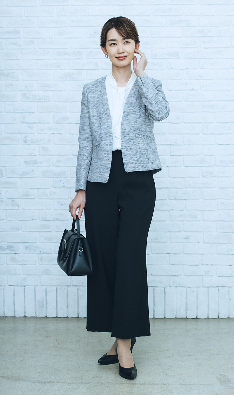ボウタイ風ブラウスとワイドパンツの組み合わせのセレモニーフォーマルです。