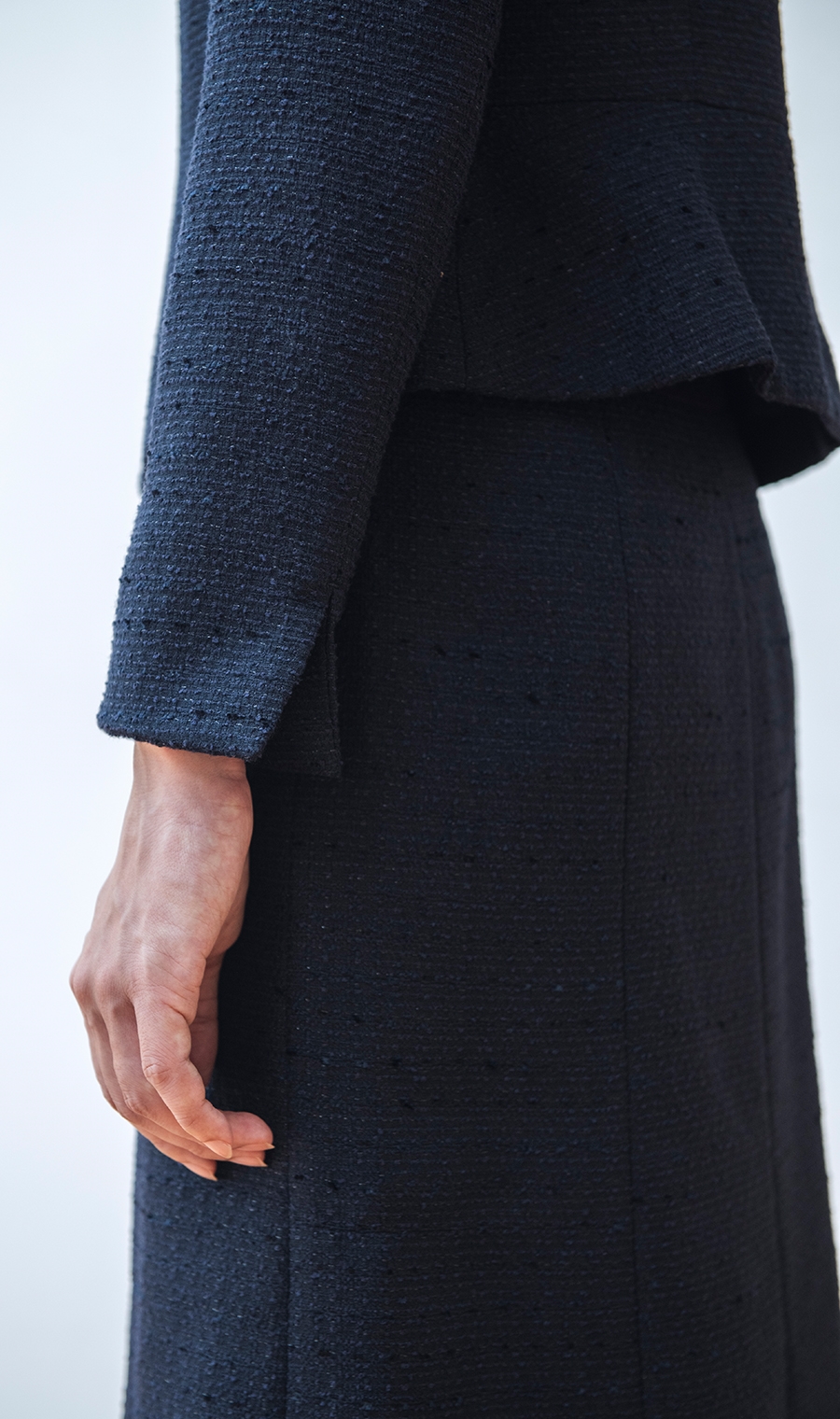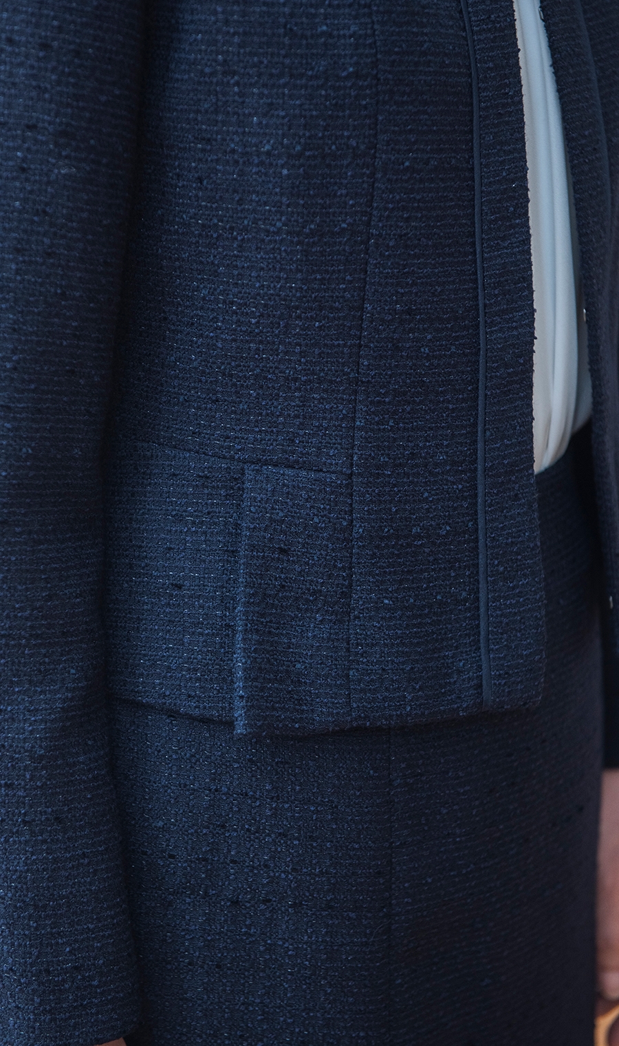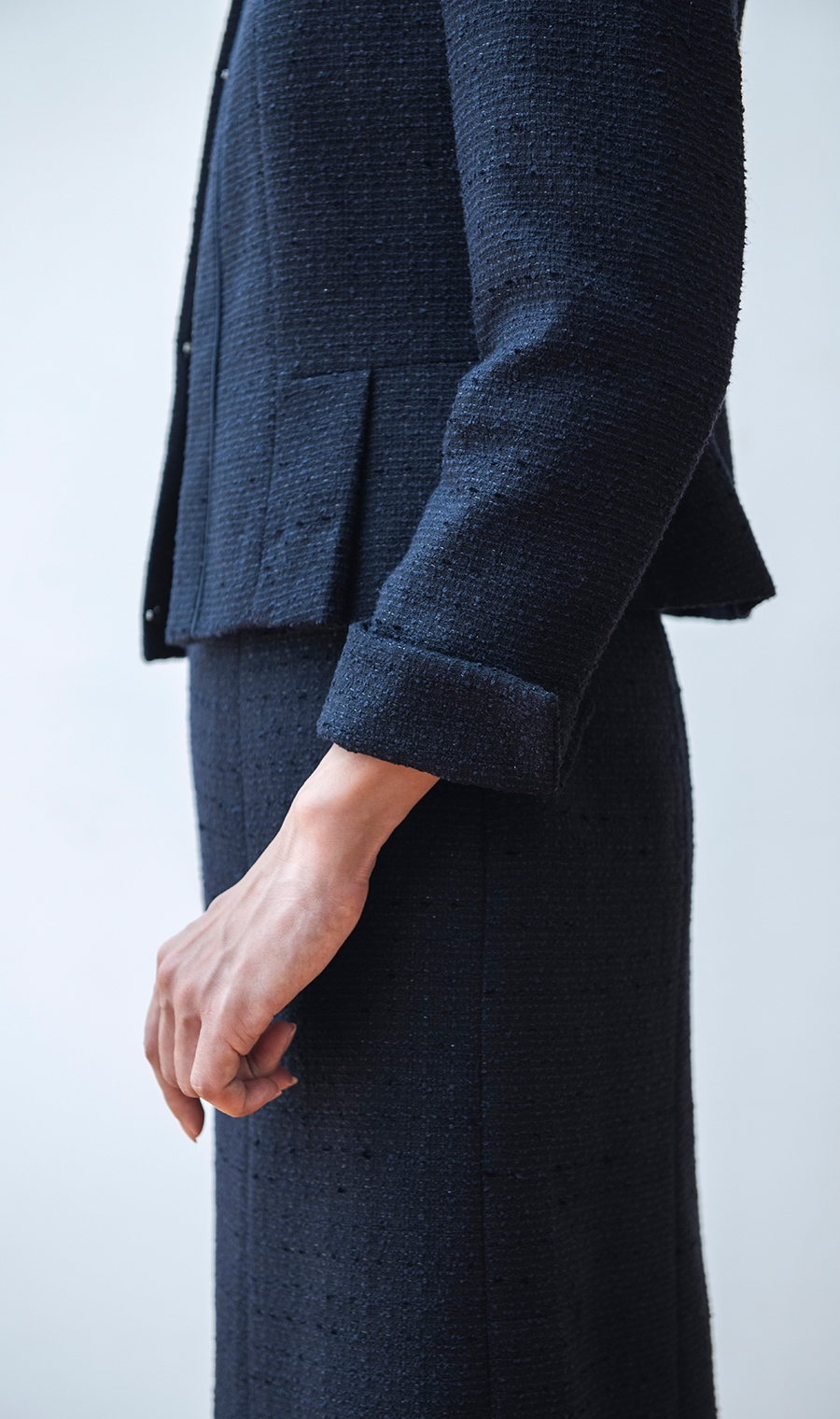ジャケットはフロントウエストラインにタックを施し、ウエスト位置を高く見せ、袖口はリターンカフス仕様でスッキリと軽快な印象に仕上げました。
