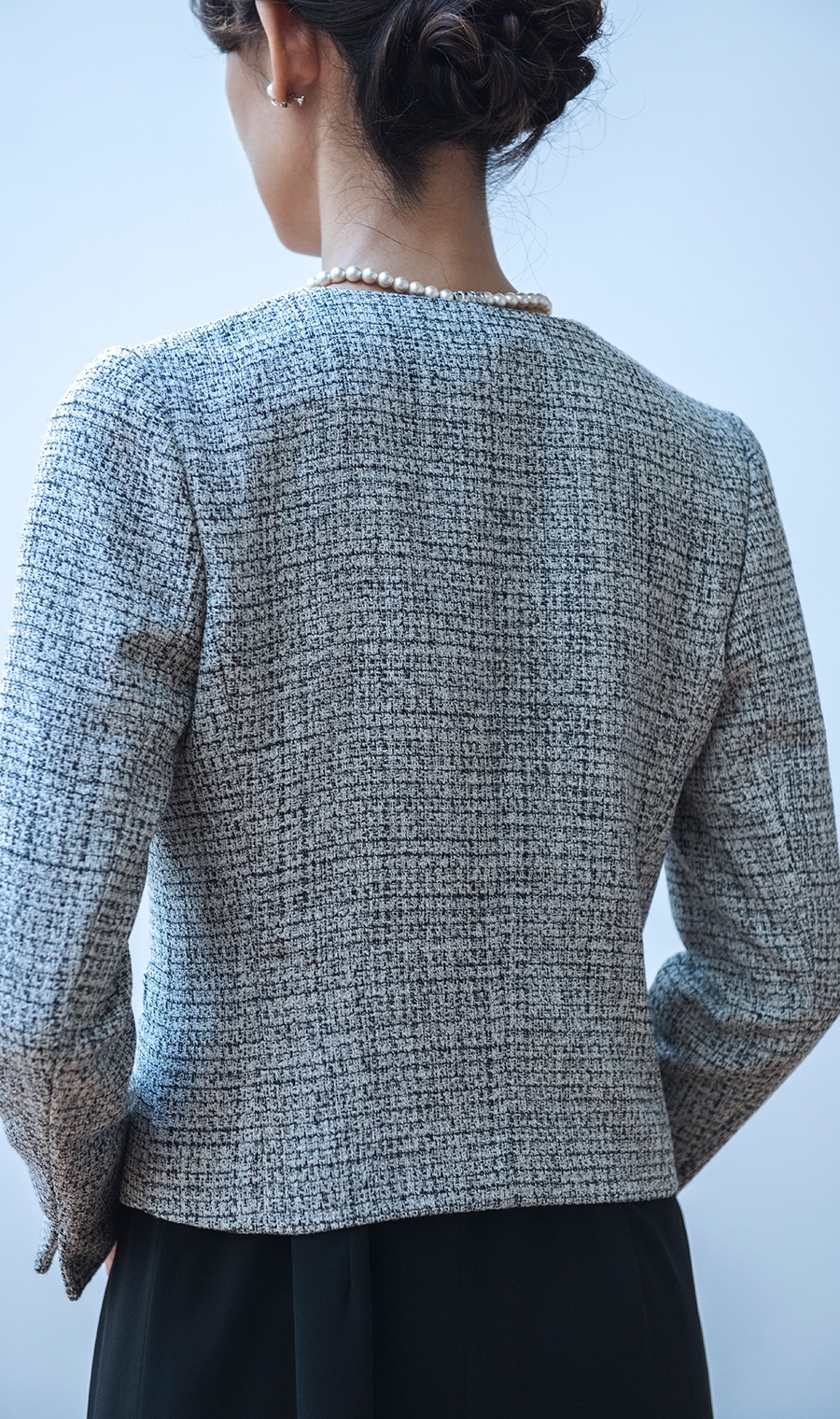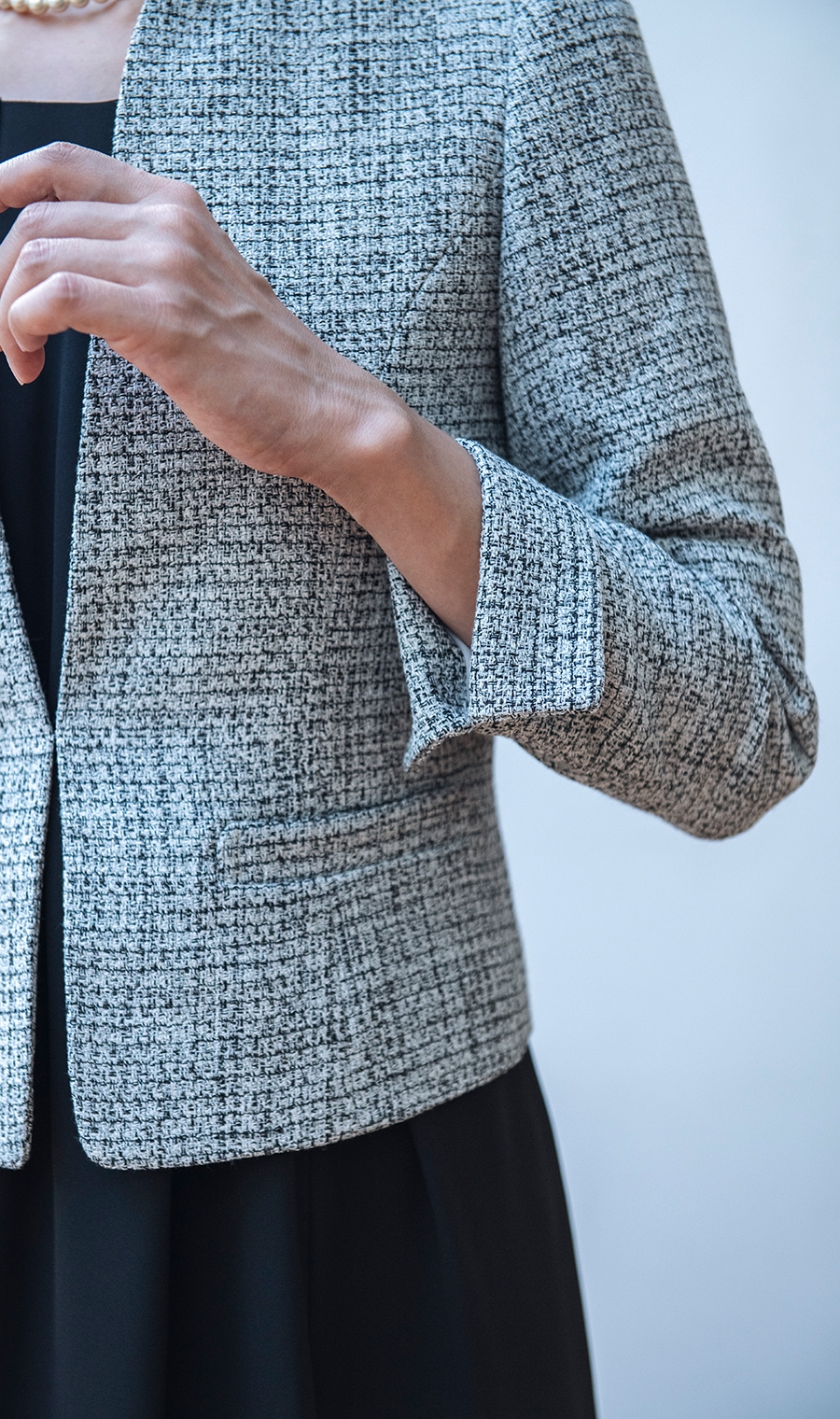 ジャケットはクールなシルエットでカラーレスがポイント。