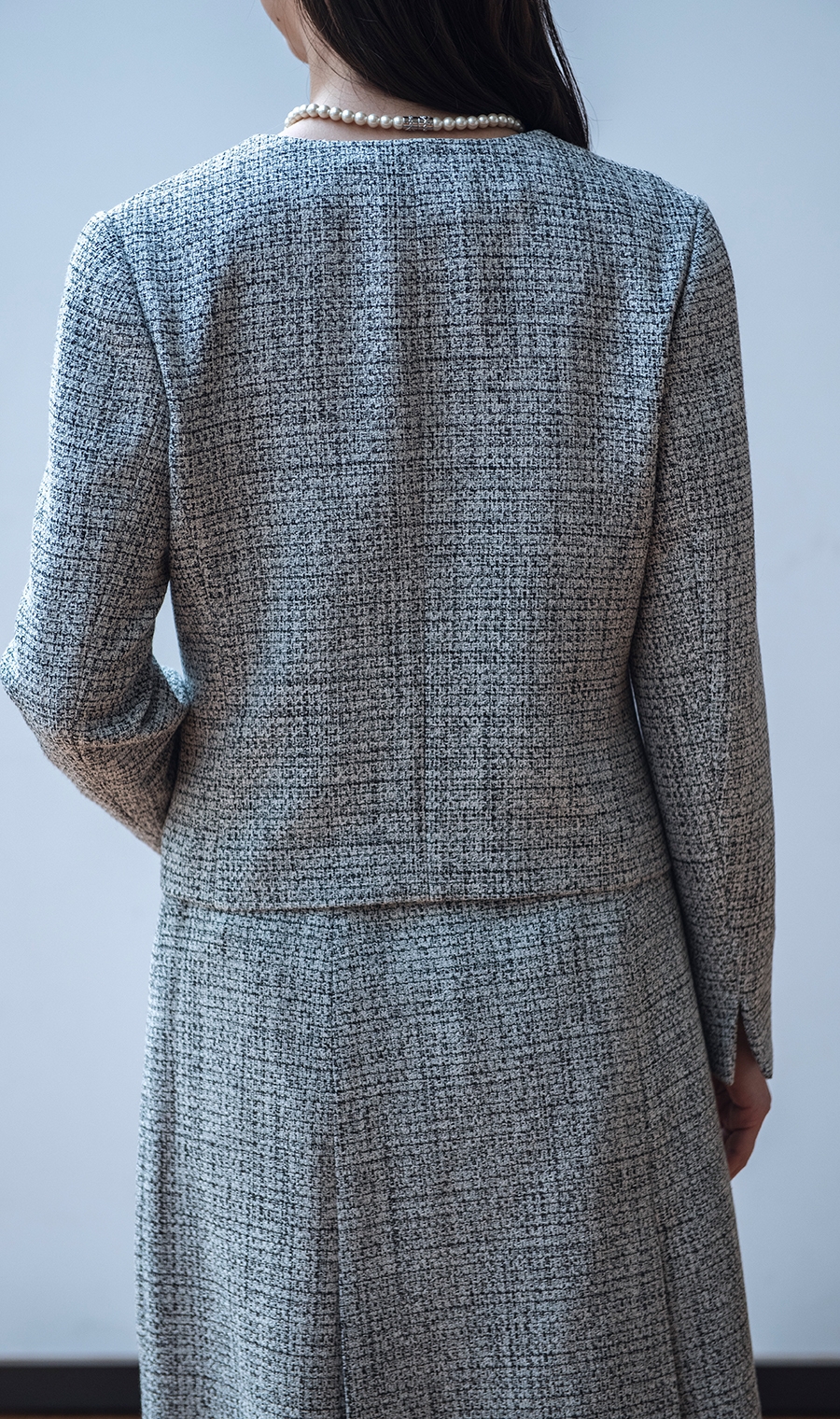 ミックスツイード調Vカラージャケット+ボックスプリーツスカートセット