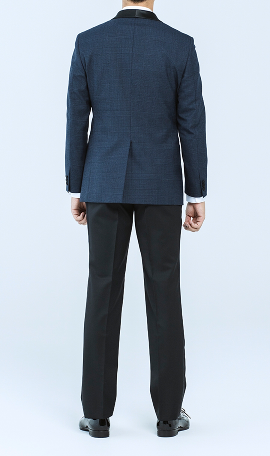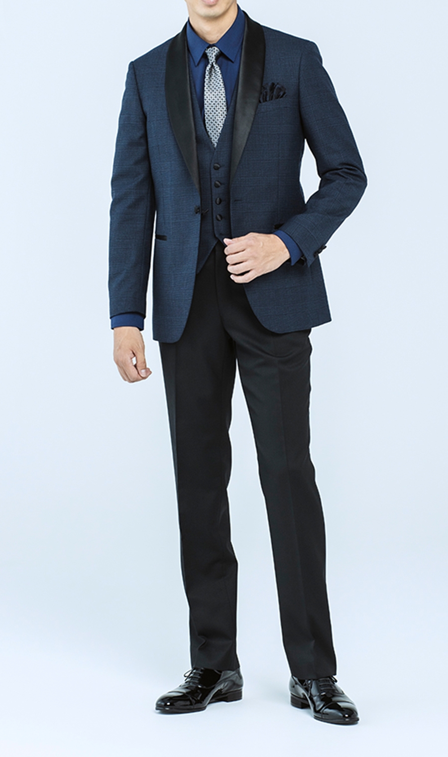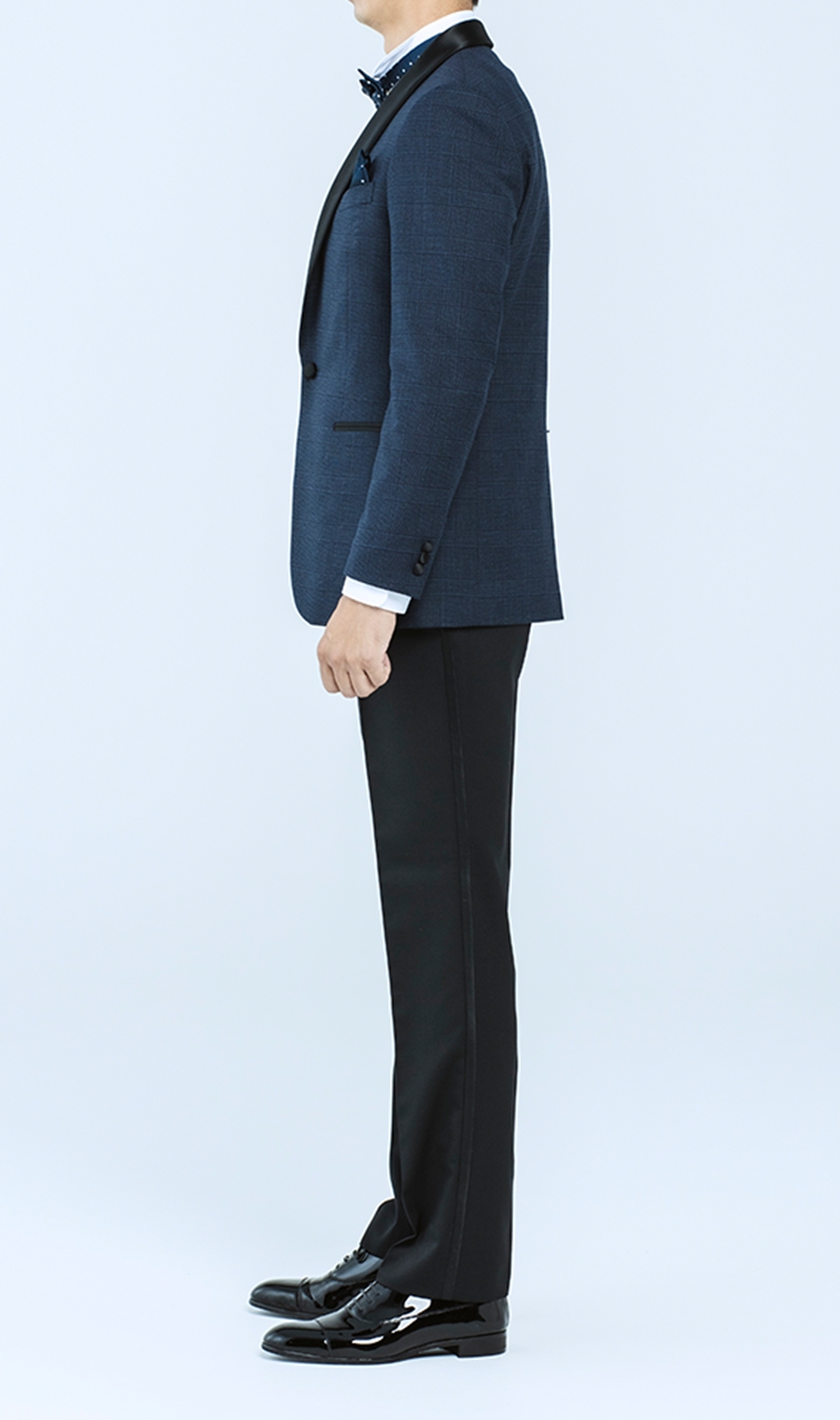 スーツの顔である襟は拝絹(はいけん)襟を採用したショールカラー。