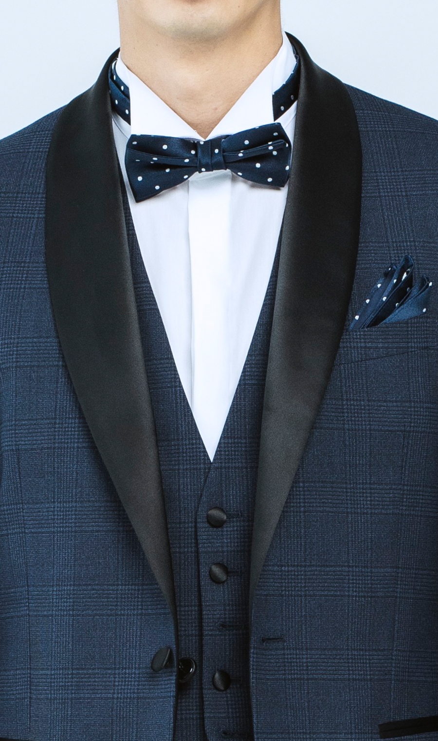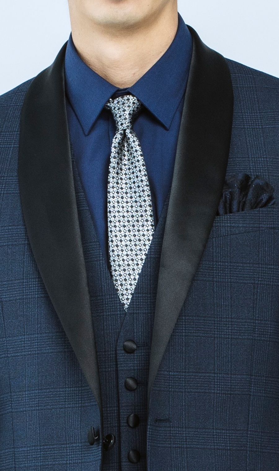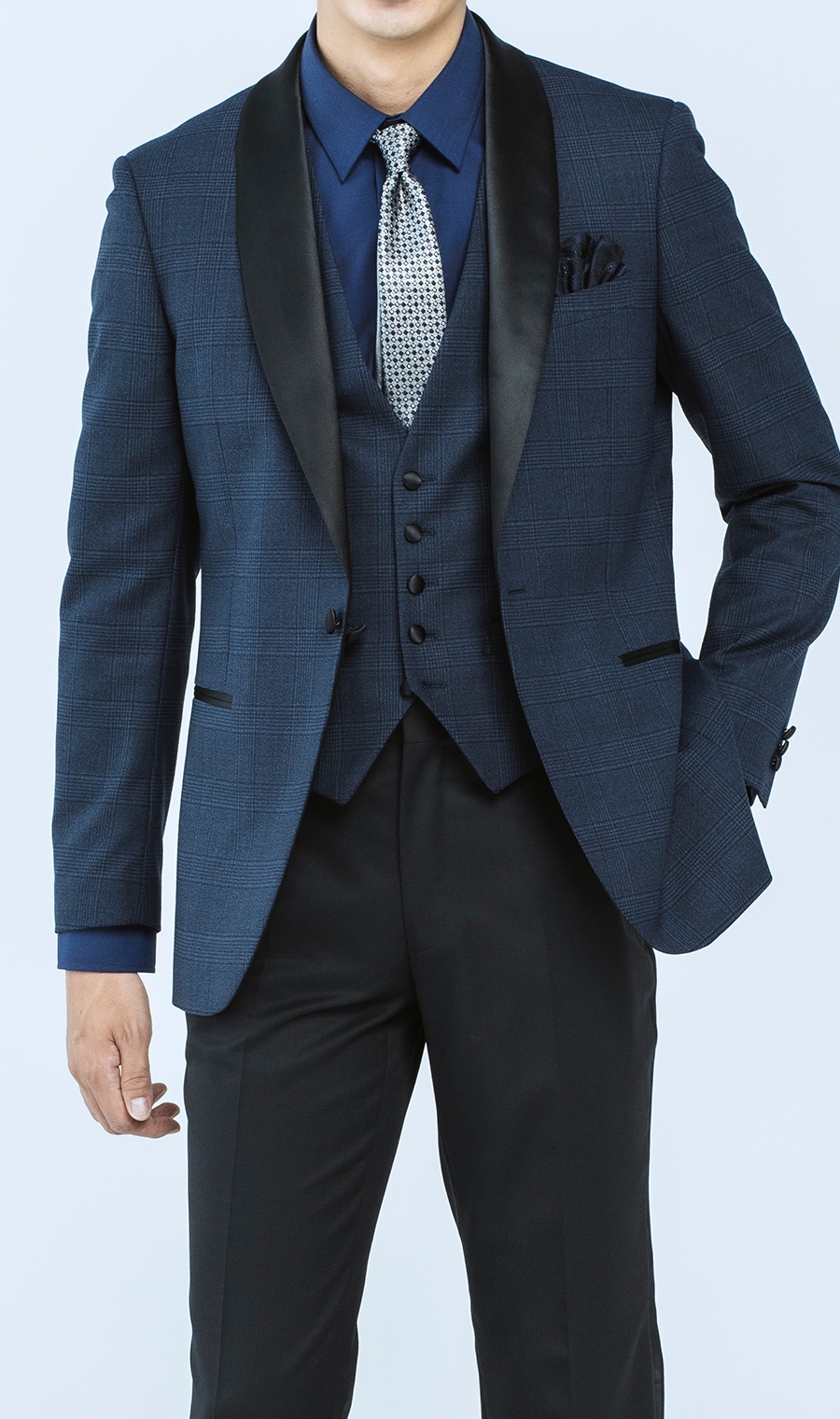 スーツの顔である襟は拝絹(はいけん)襟を採用したショールカラー。