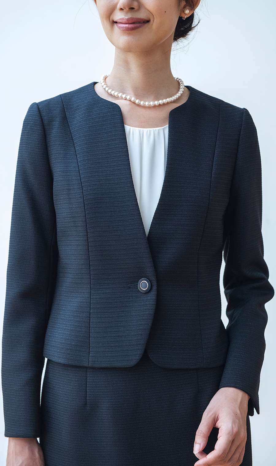 開きのある胸元に1ボタンでくびれのある綺麗なシルエットで上品さを演出。