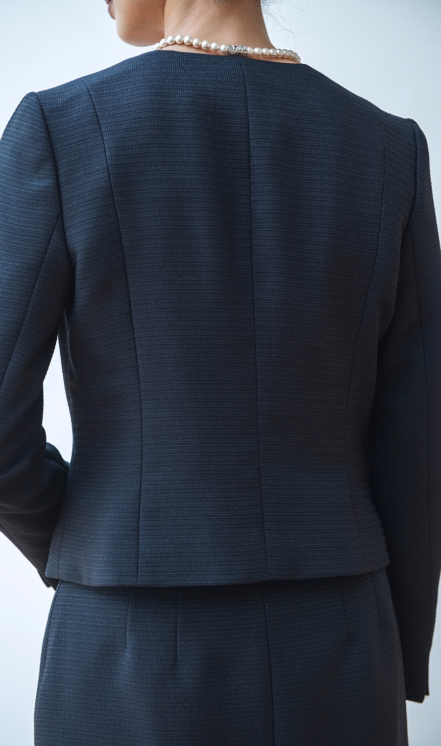 ジャケットの肩から裾にかけてのダーツがスタイルにアクセントを与えてくれます。