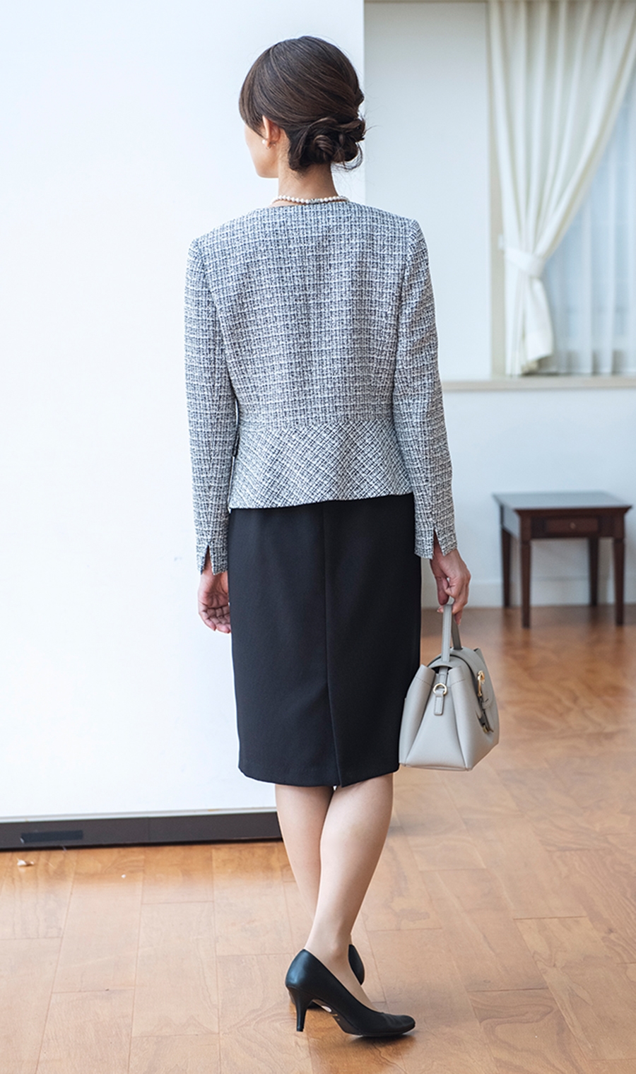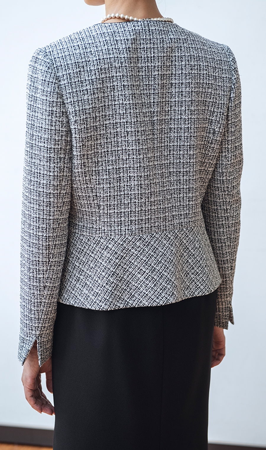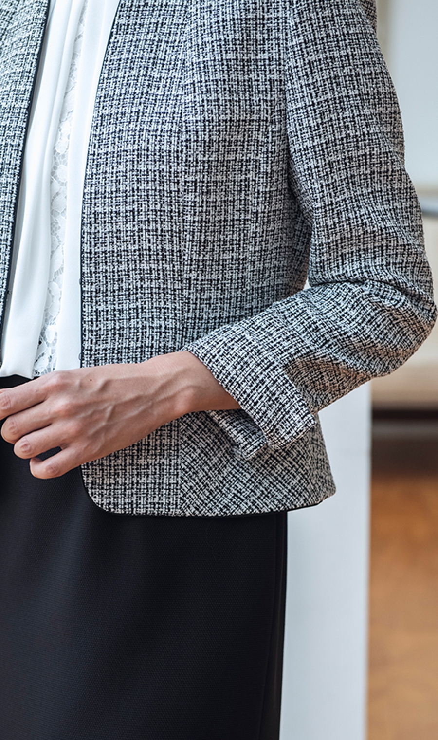 ジャケットはサテンのブラックトリミングがエレガントさを演出。