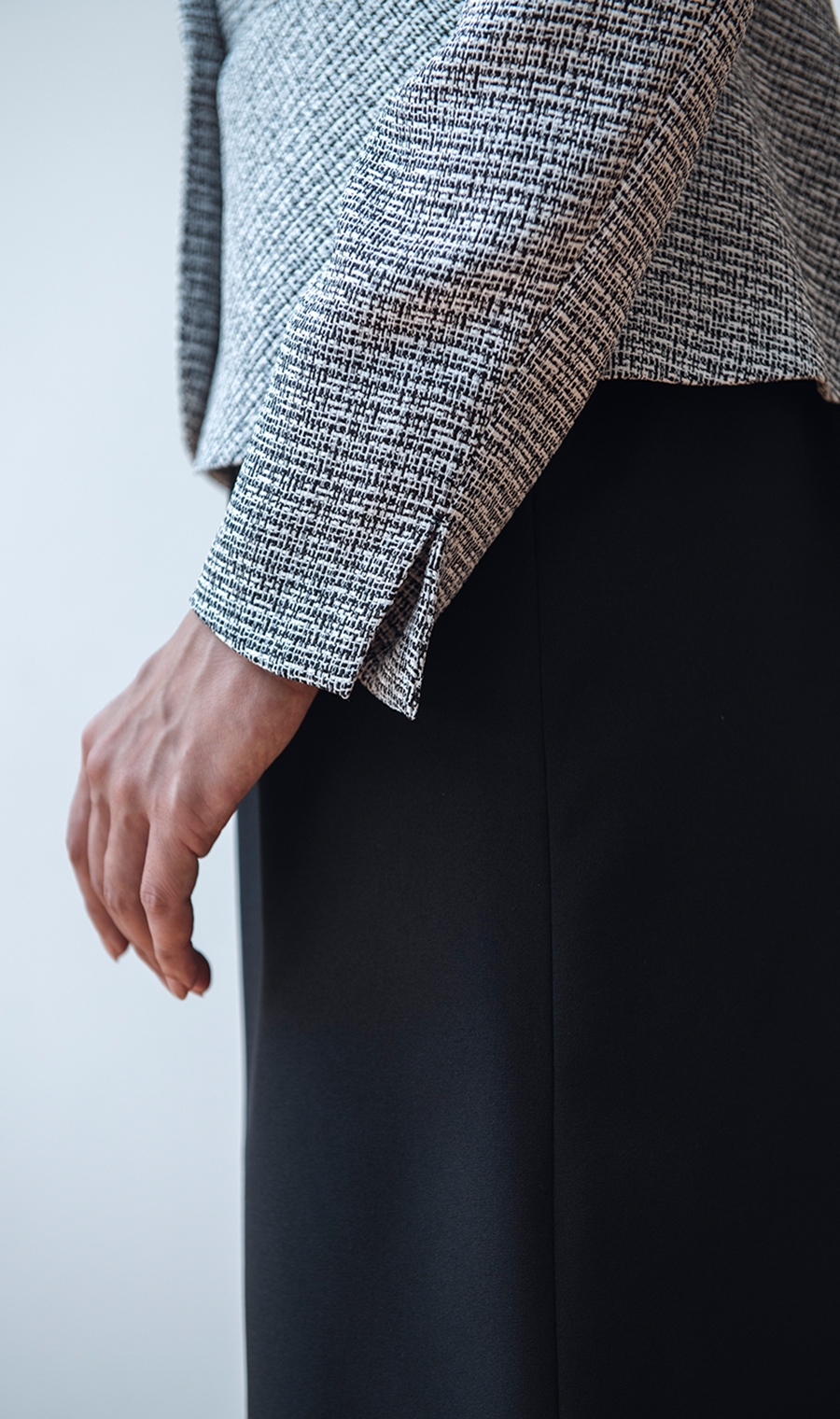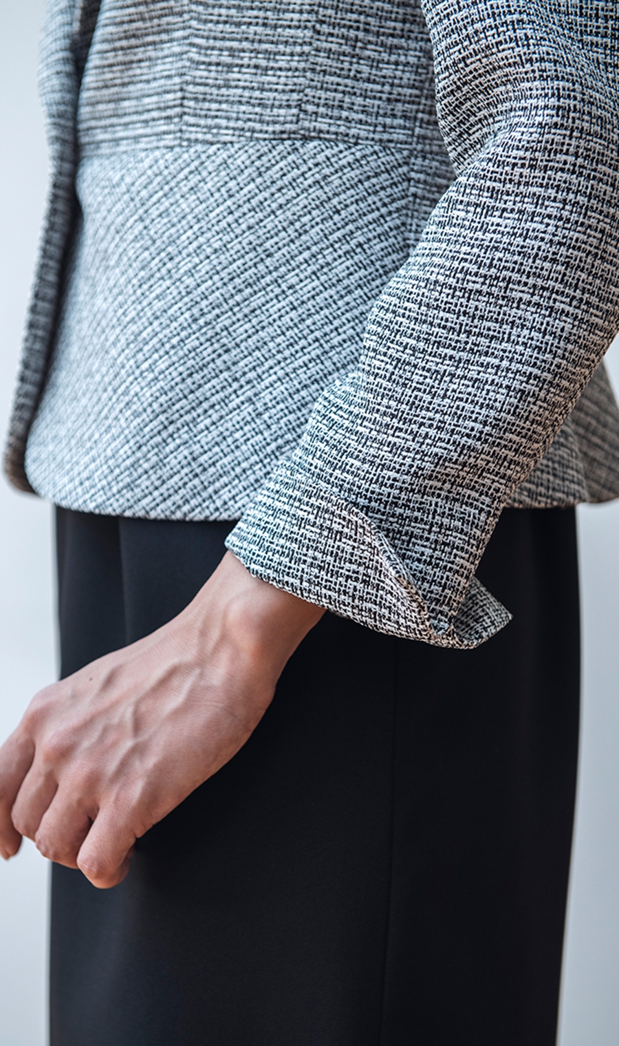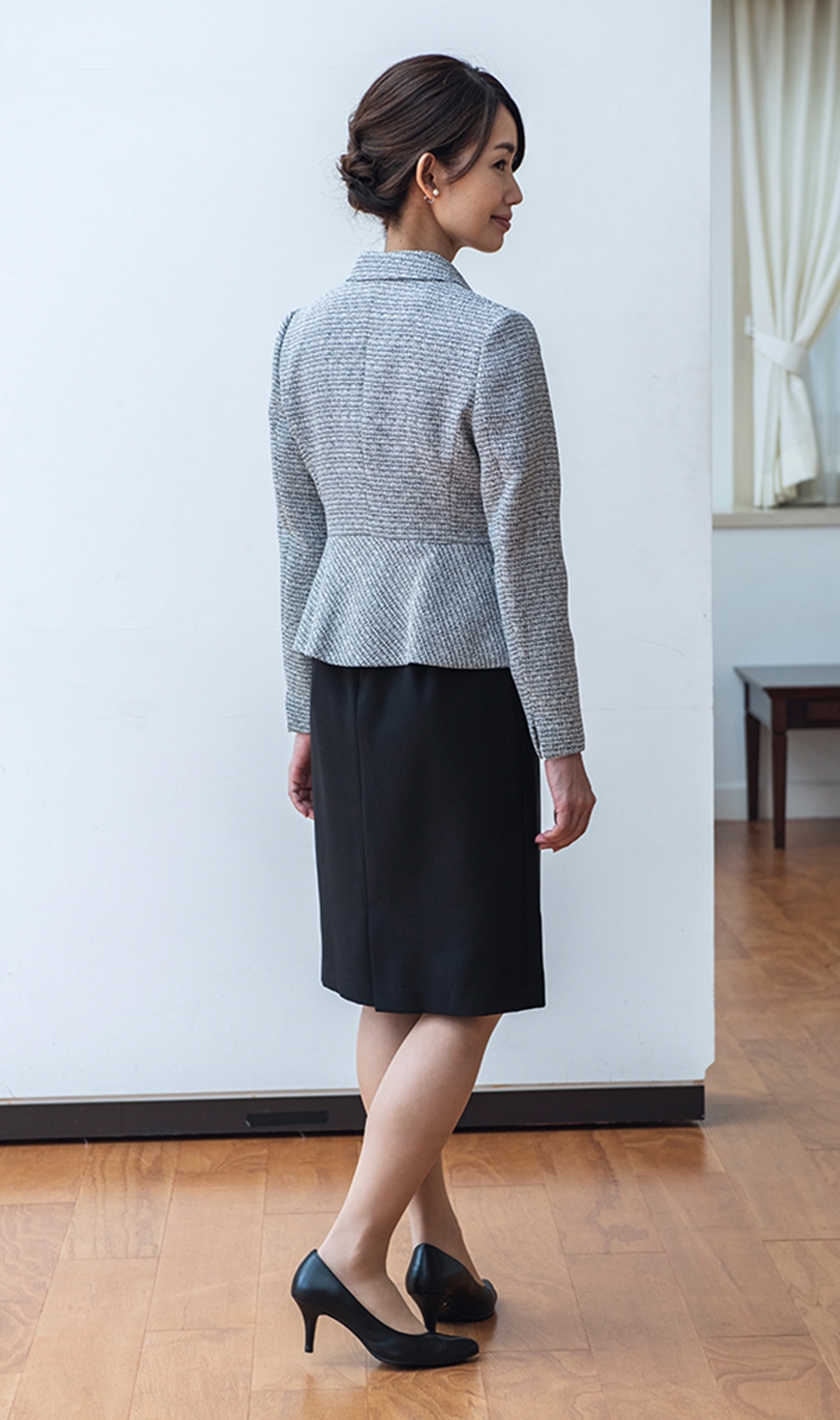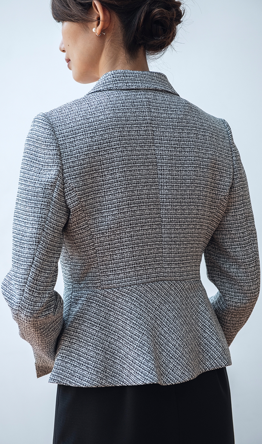ジャケットはウエスト位置を高く見せるようフロントウエストラインに切り替えを入れています。