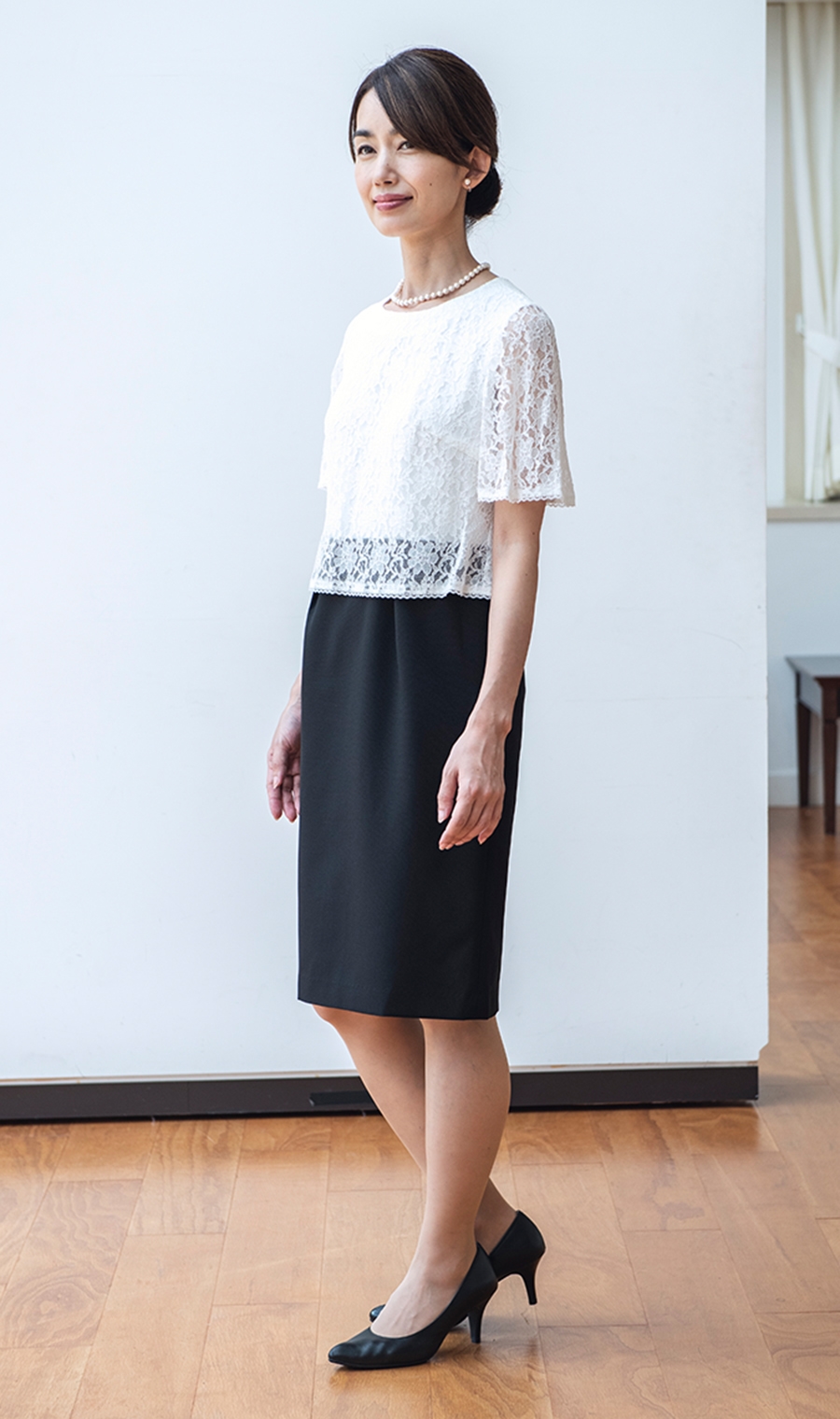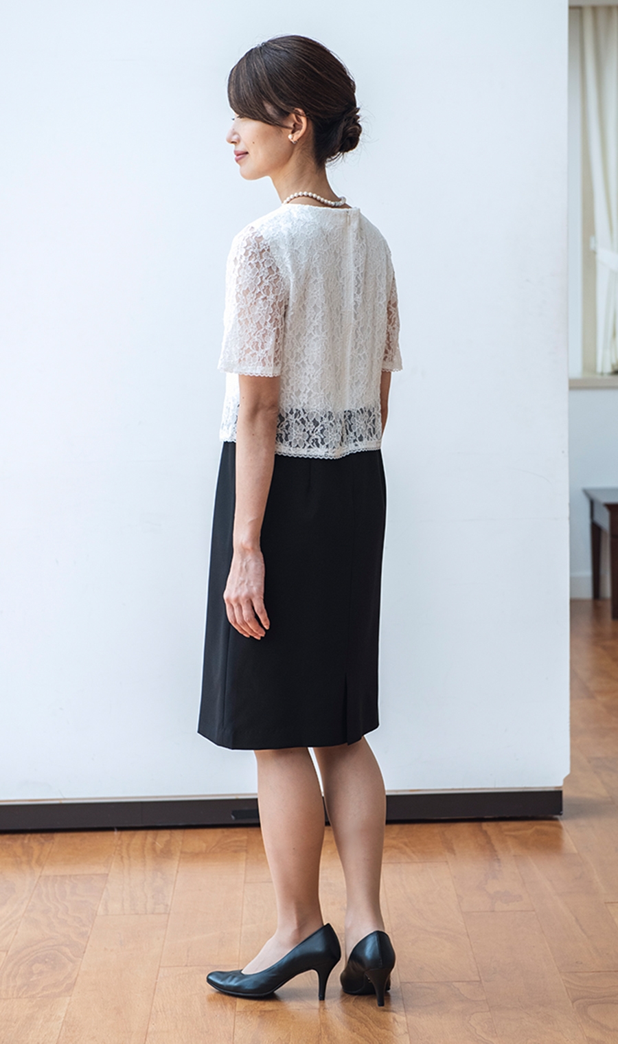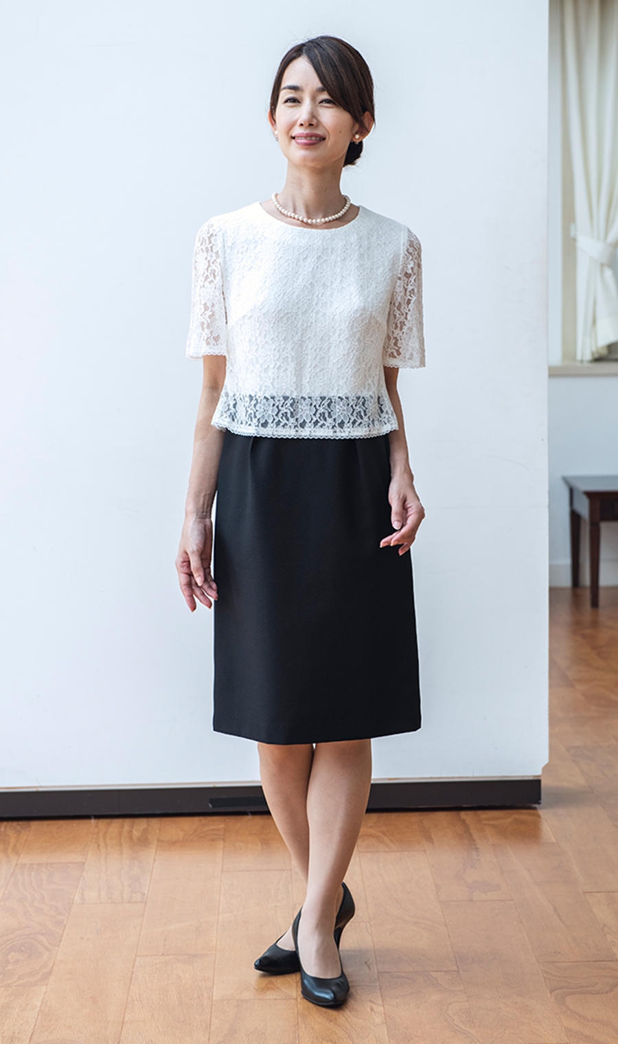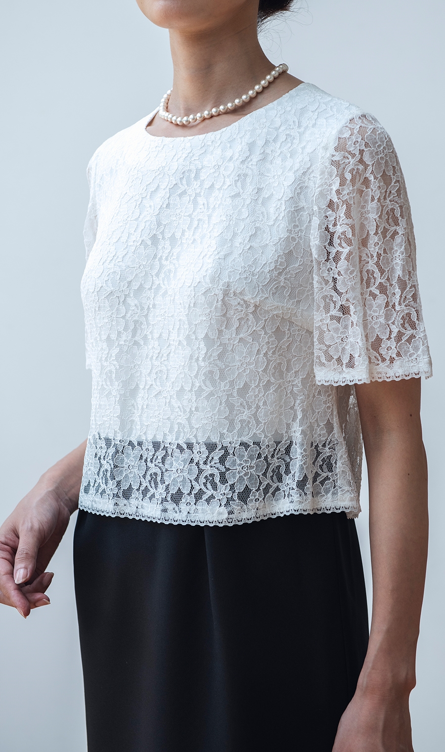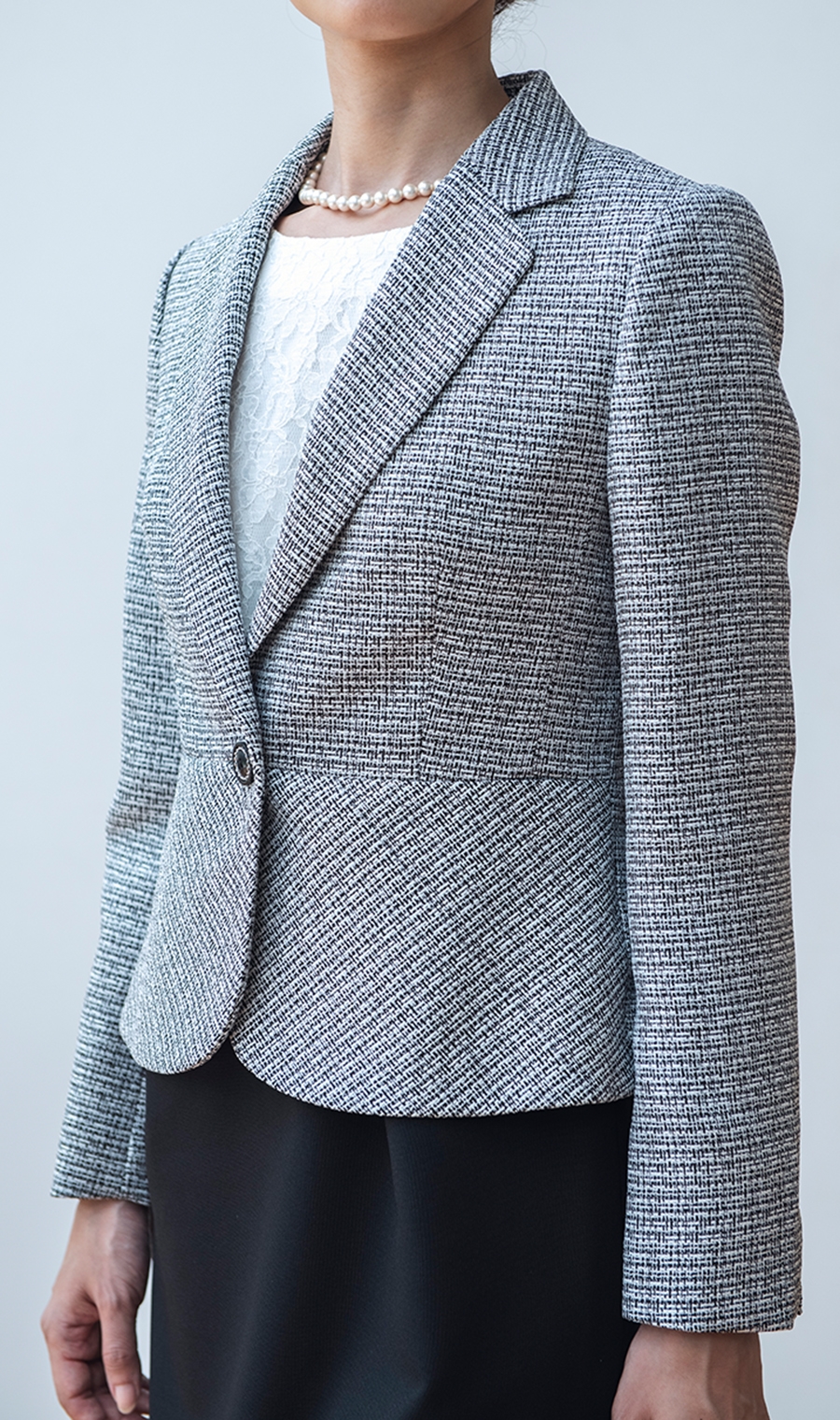 ワンピースは総レースデザインがジャケットとの相性が良くエレガントな雰囲気に。