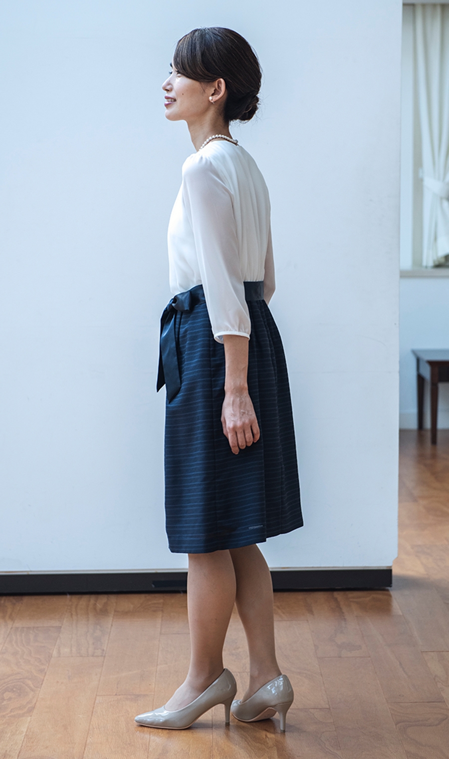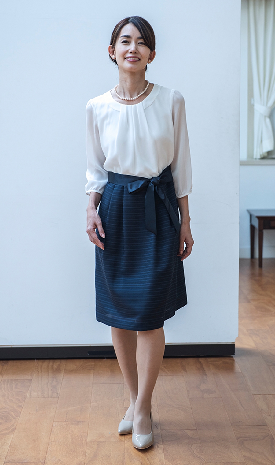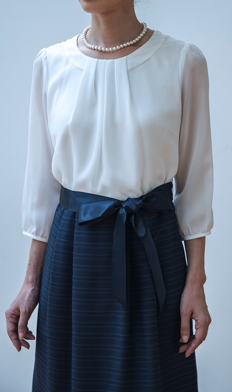ワンピースはブラウス部分のふんわりとしたシフォンが女性らしさを演出。