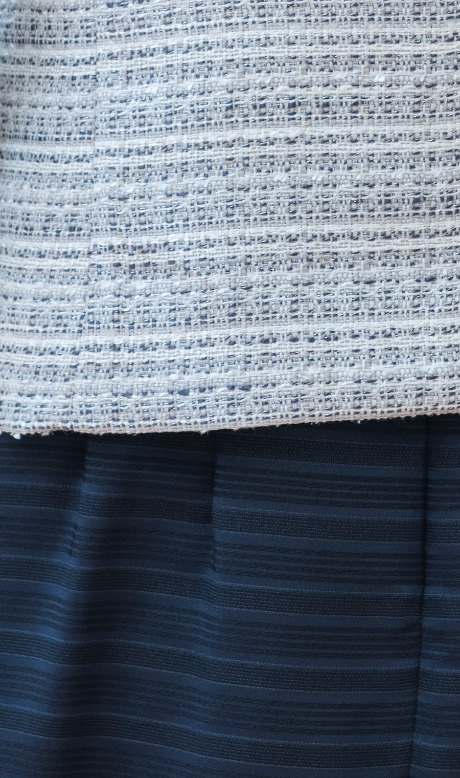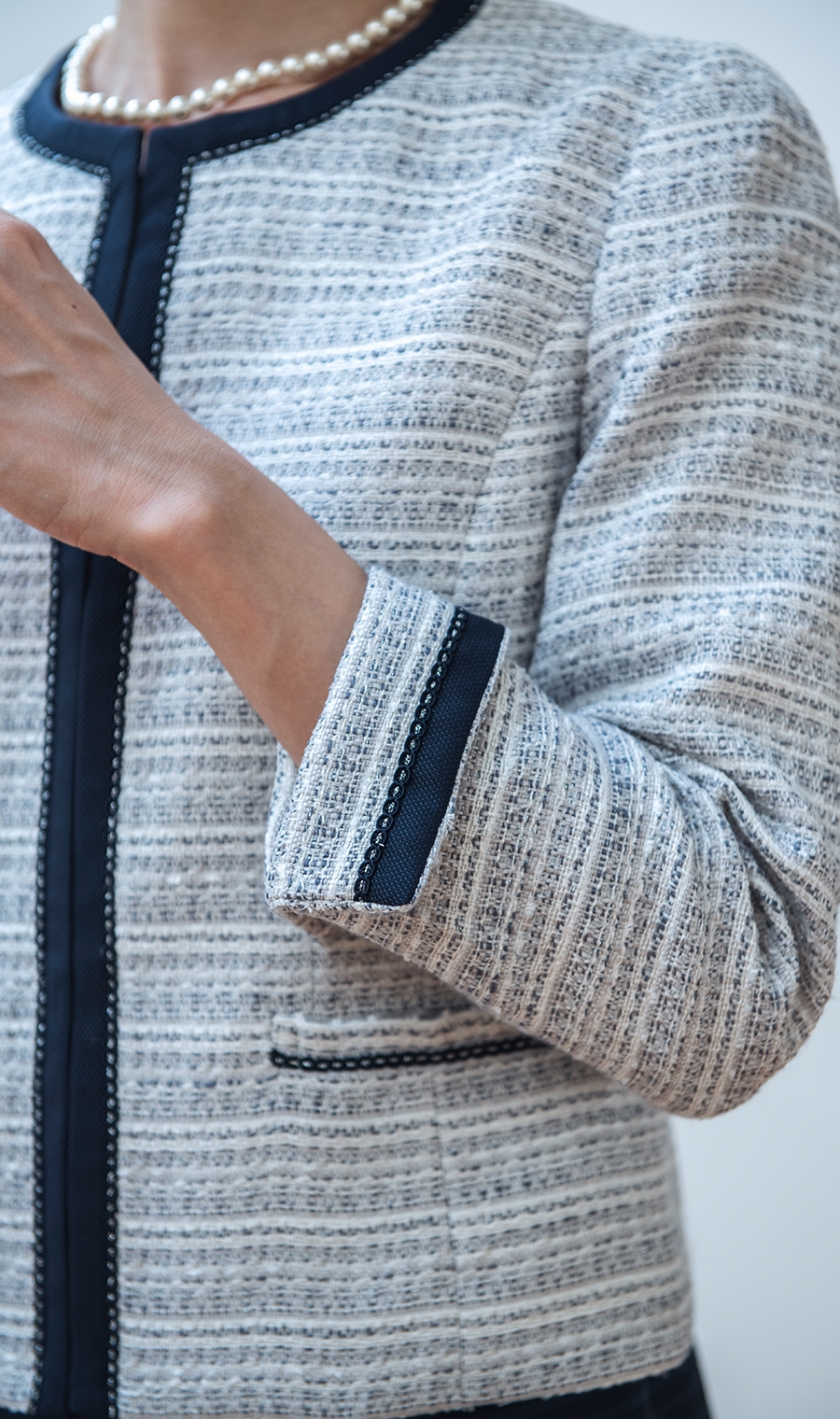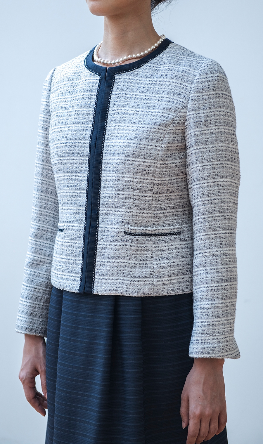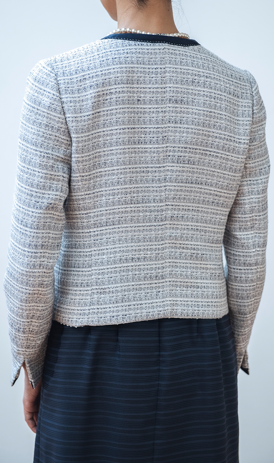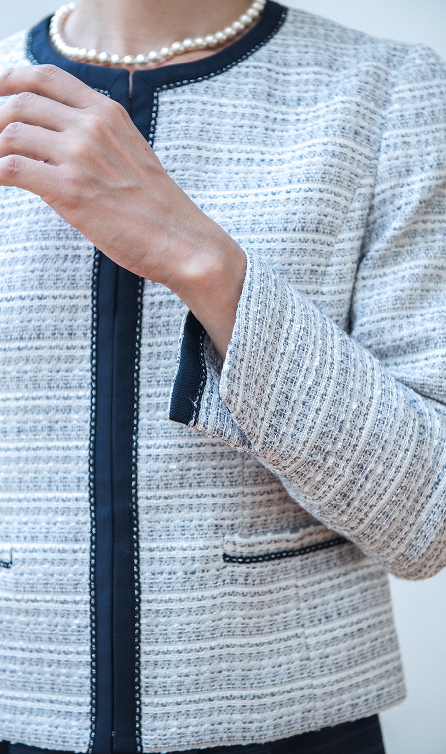 ジャケットは織柄からさりげなく見えるラメとフロントのラインテープがポイント。