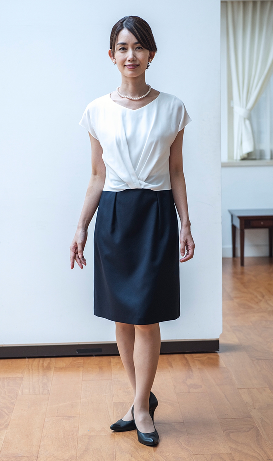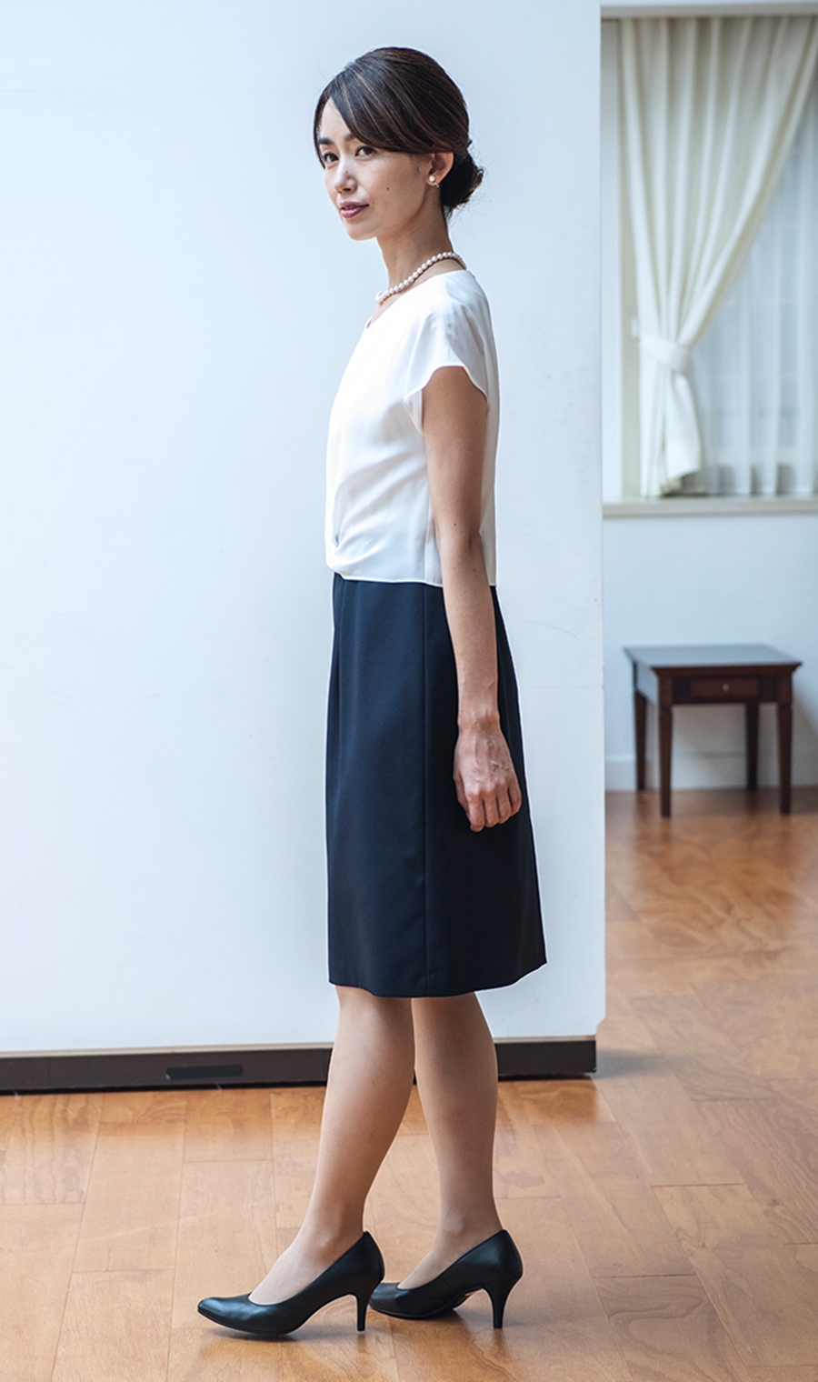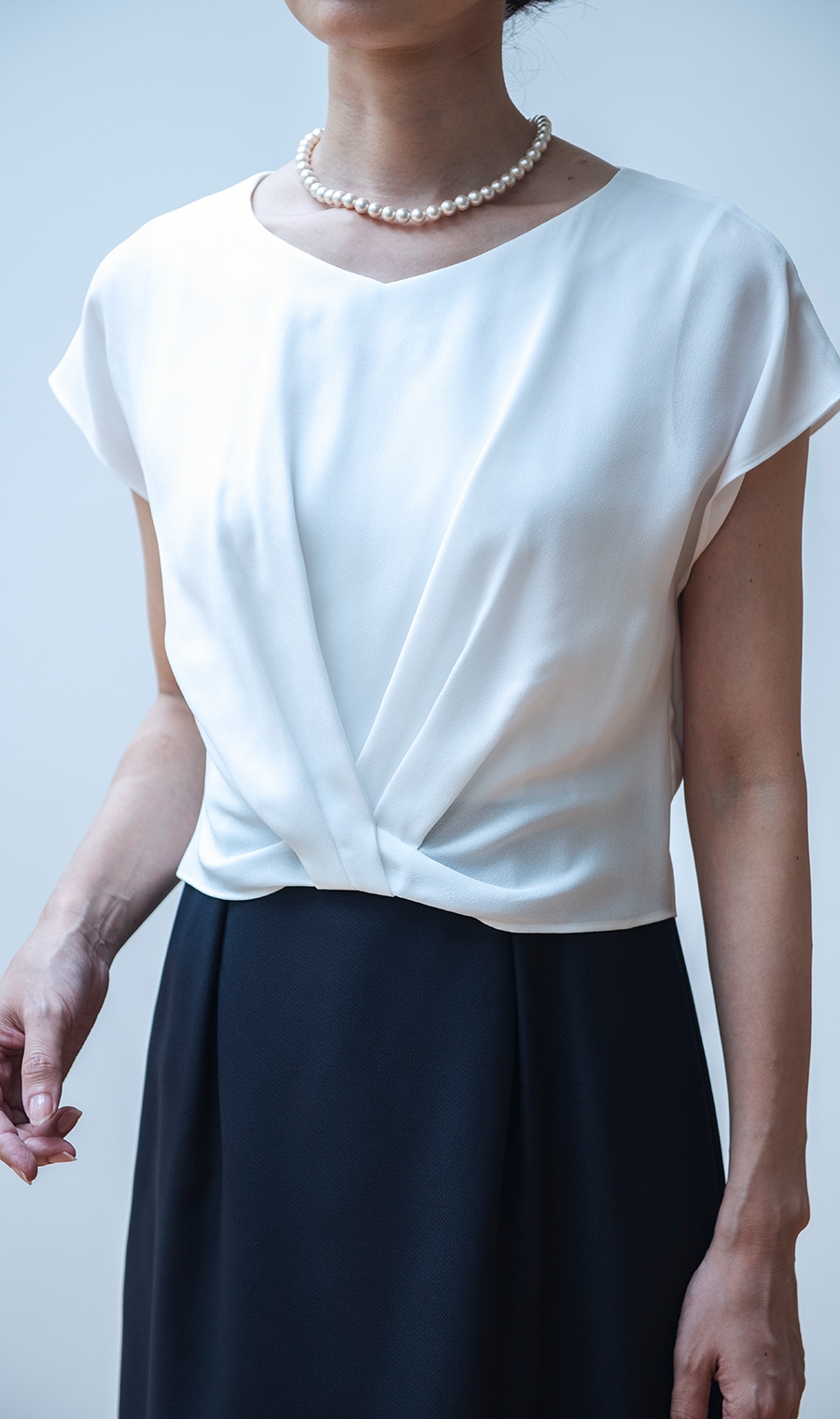 ワンピースはフロント身頃のドレープテクニックが女性らしい印象を与えてくれます。