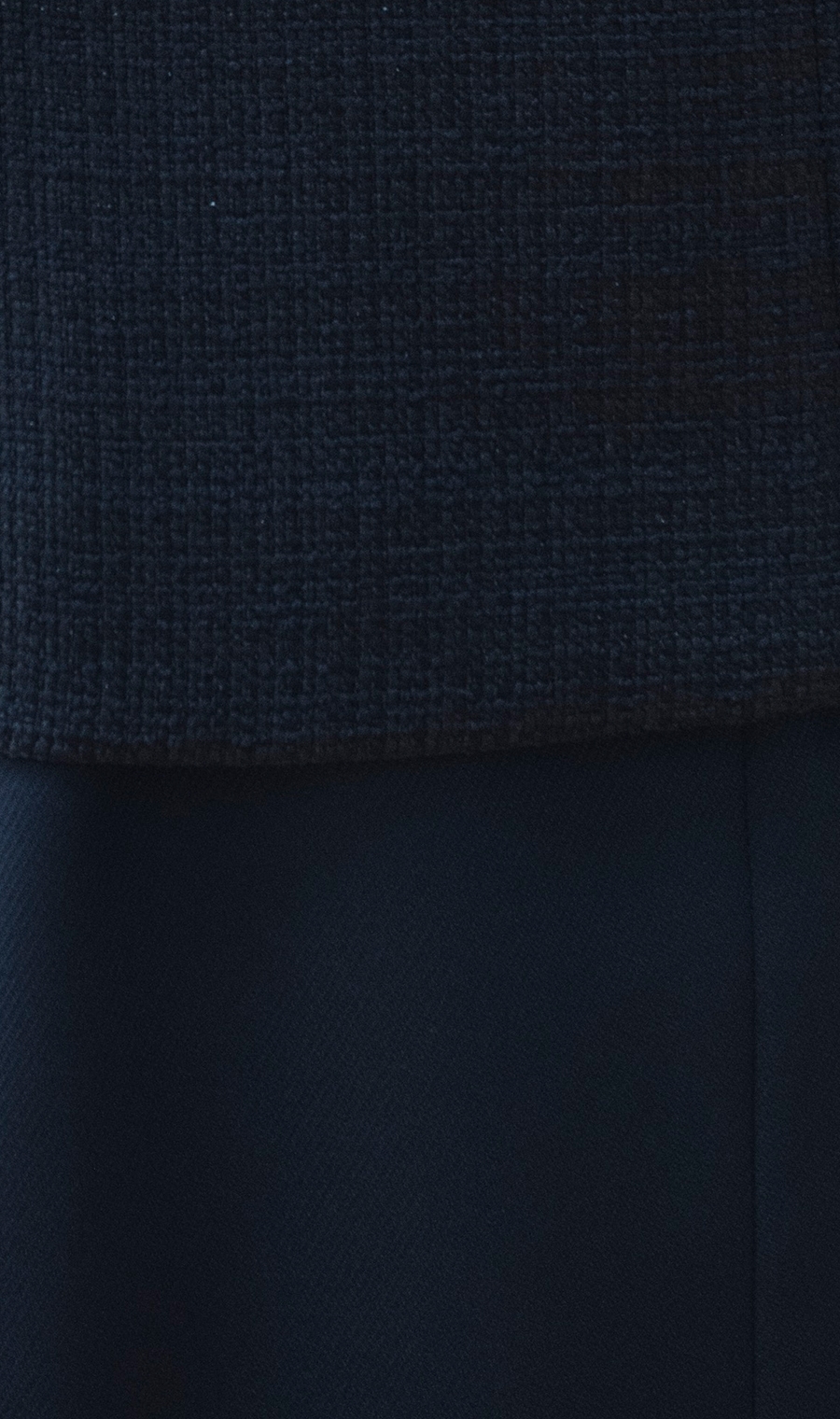 ジャケットは程よいミックス感のあるツイード素材で品がありリッチな表情を演出。