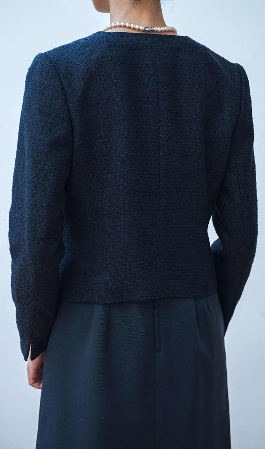 ジャケットは織柄からさりげなく見えるラメとフロントのラインテープがポイント。