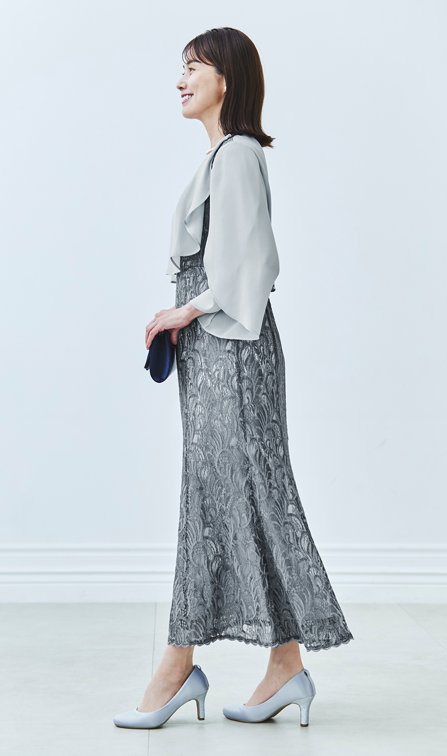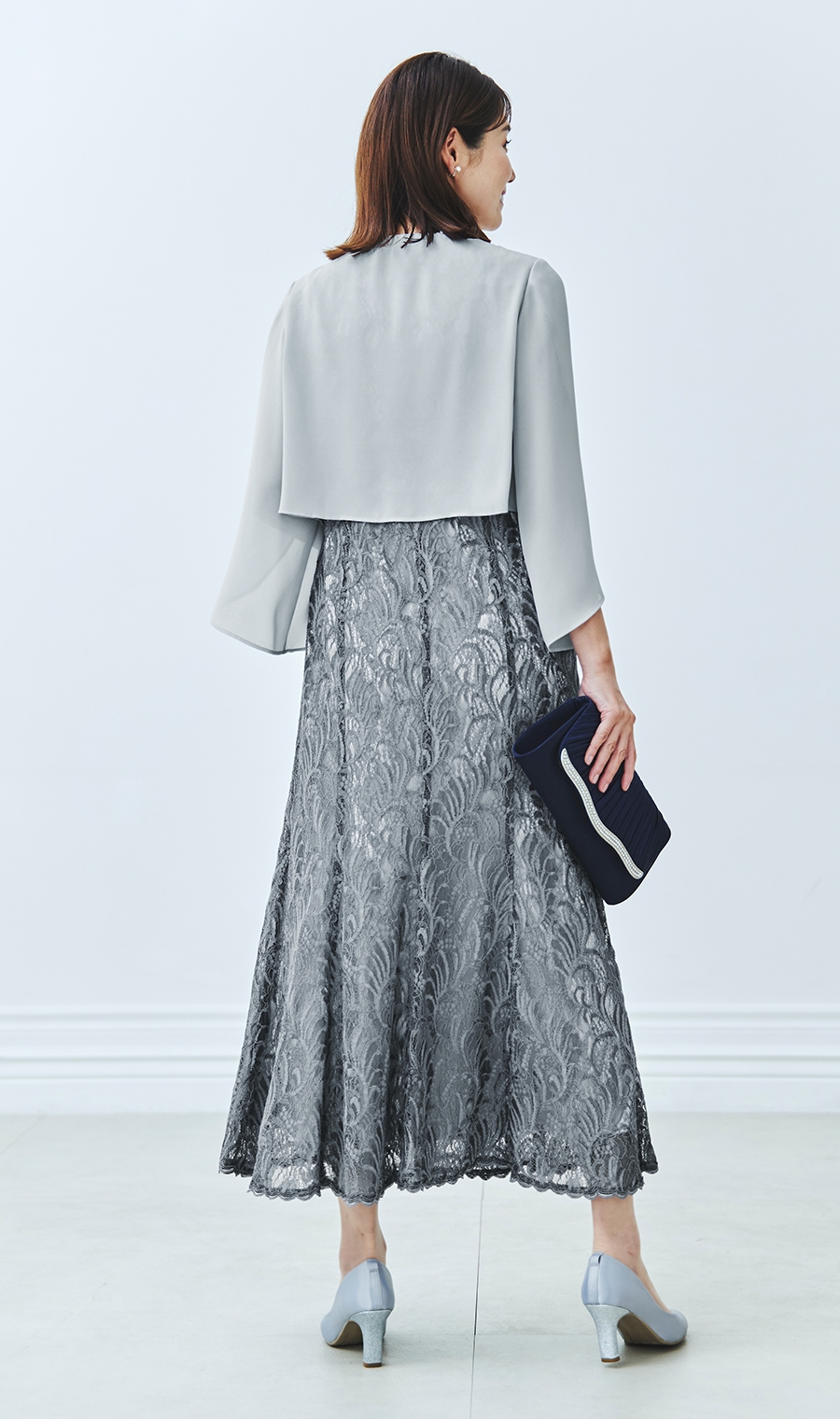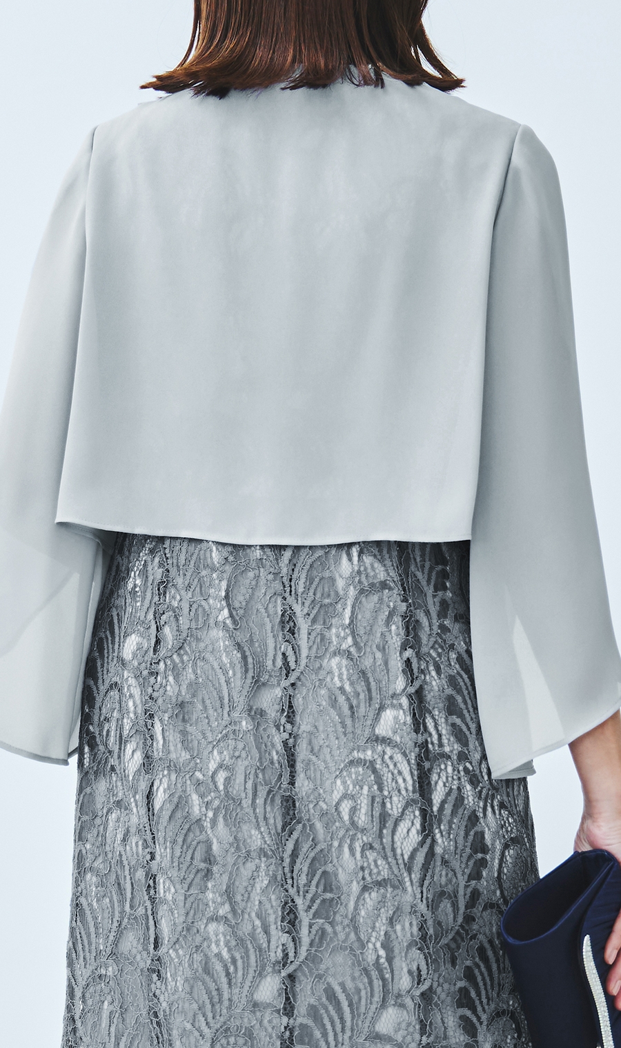 優雅なシルエットで、結婚式や式典など、フォーマルシーンにふさわしい上品な一着です。