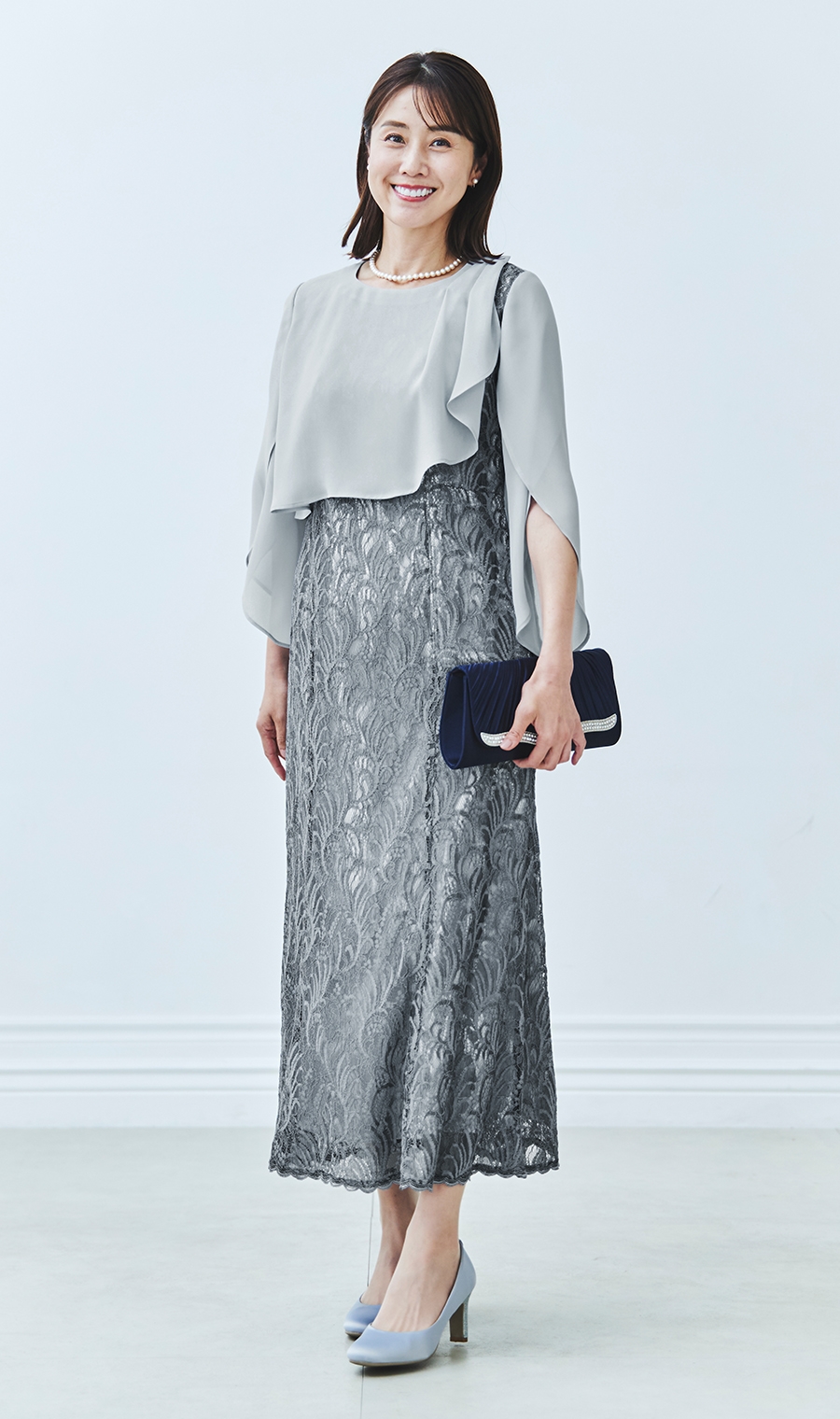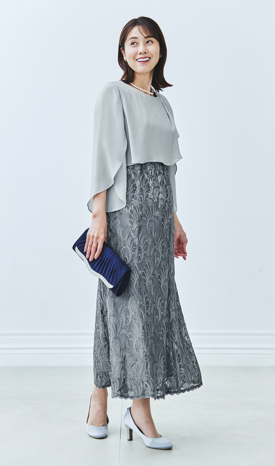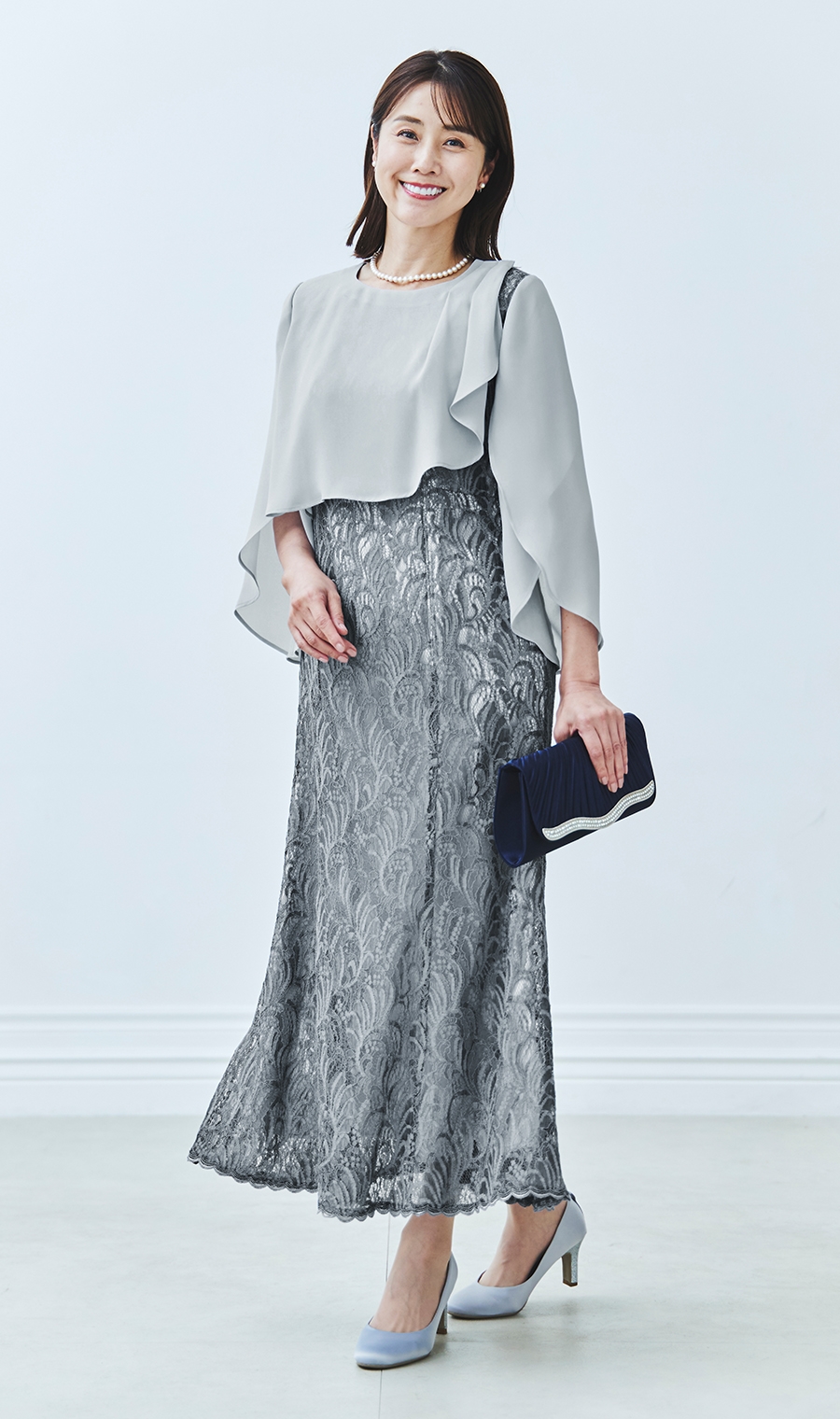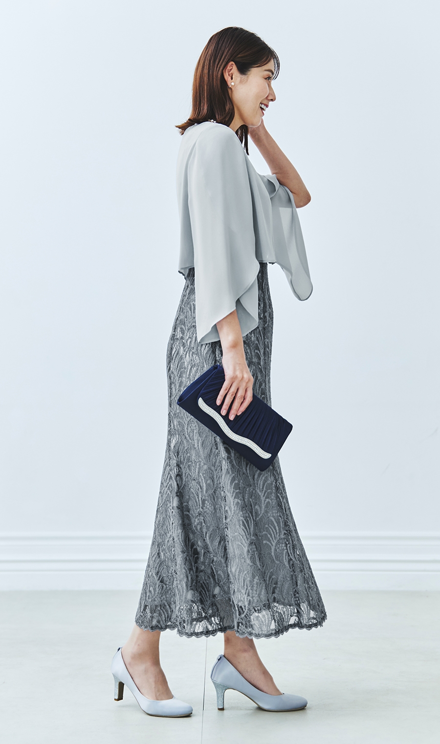 優雅なシルエットで、結婚式や式典など、フォーマルシーンにふさわしい上品な一着です。