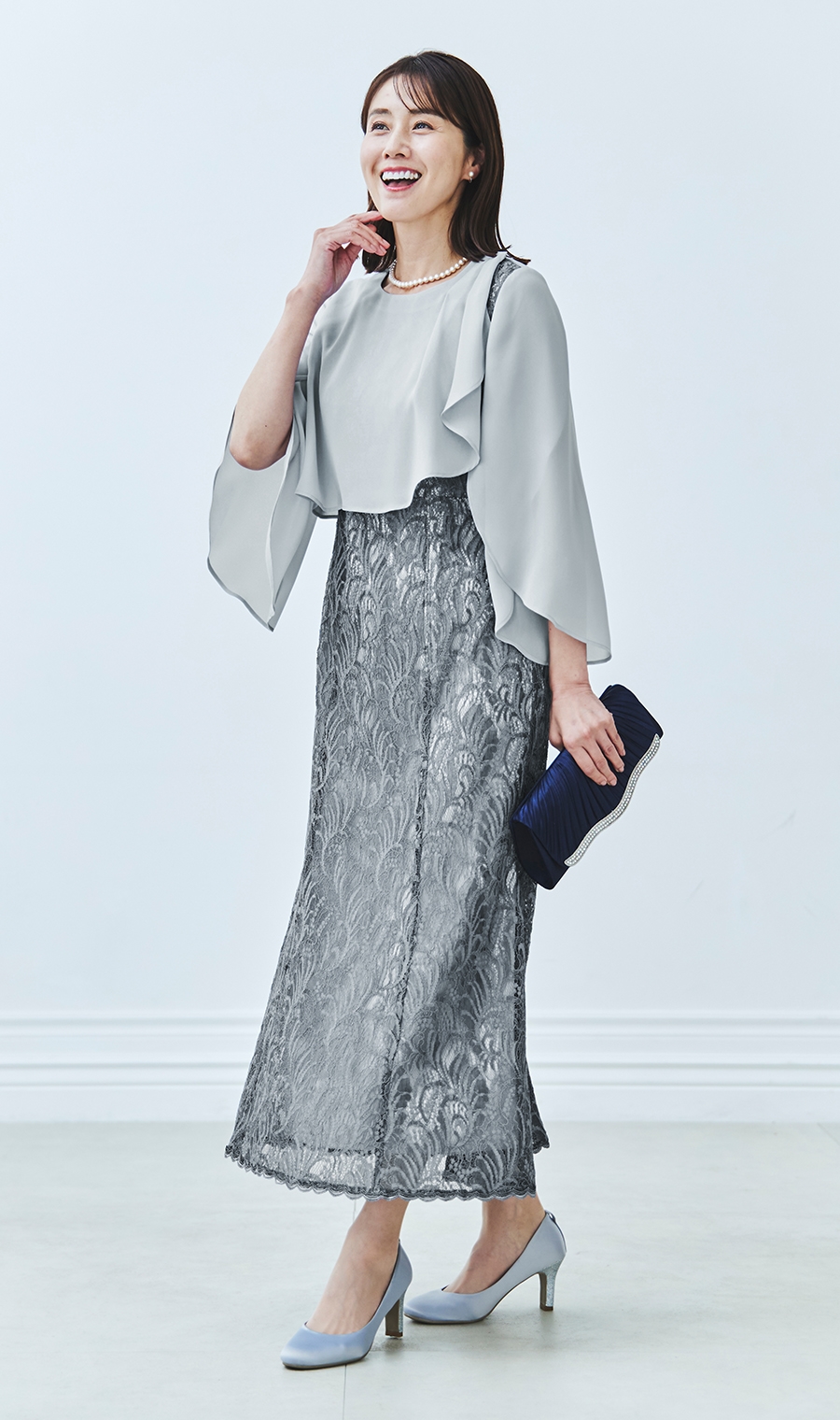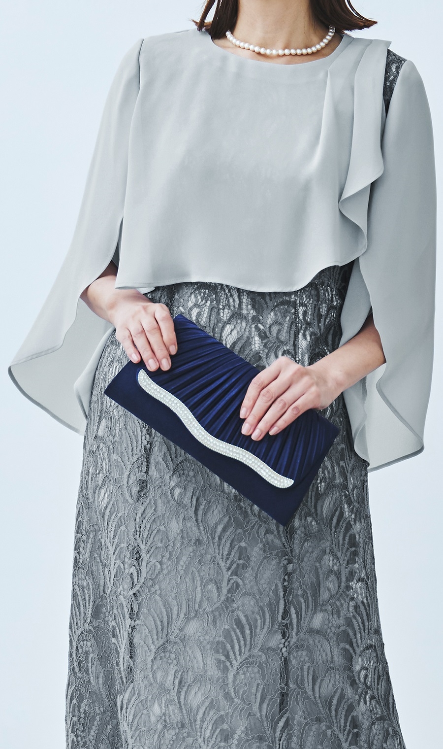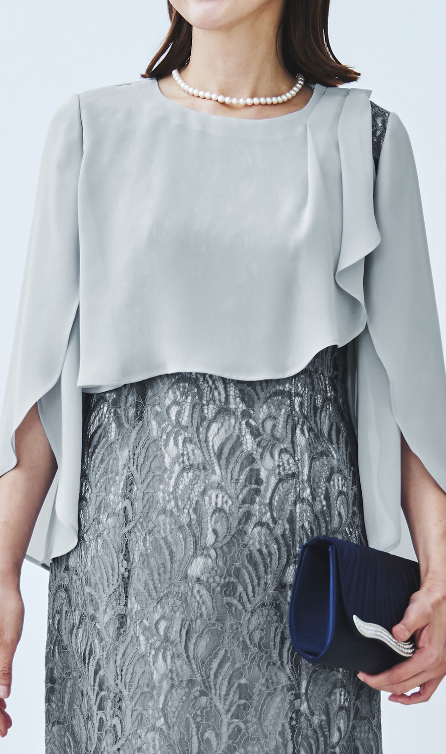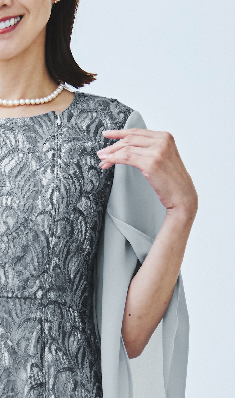 胸元のドレープと、揺れるラップ袖が二の腕カバー&華やかさを演出します。