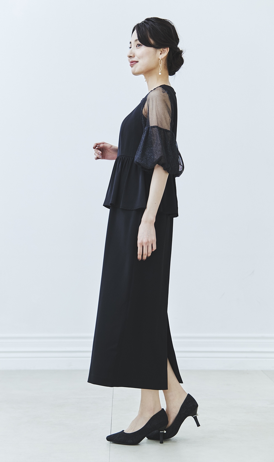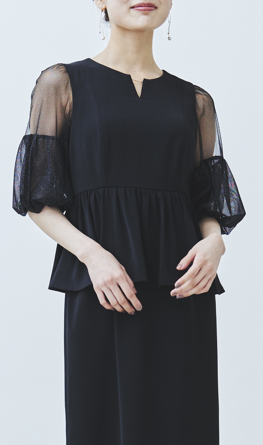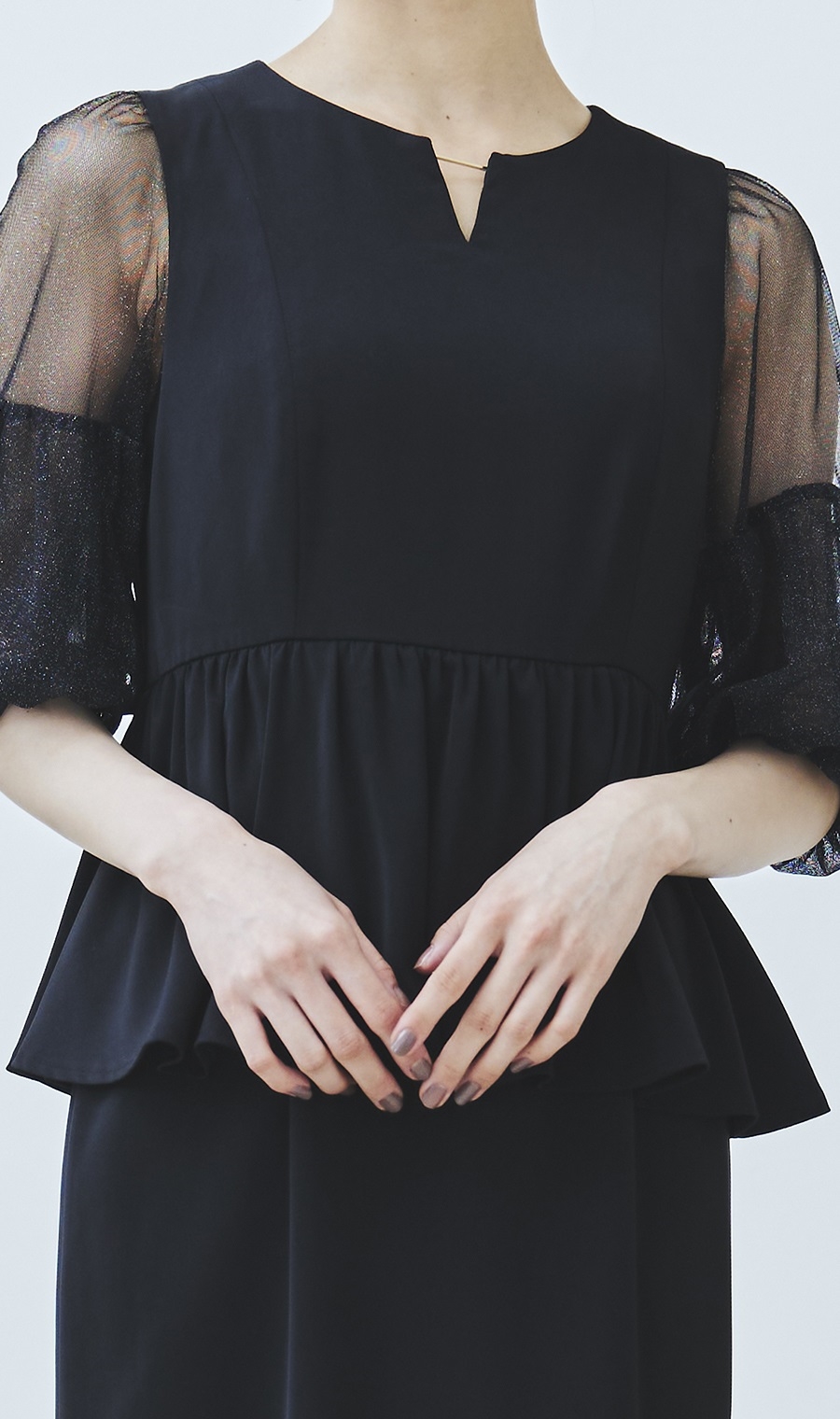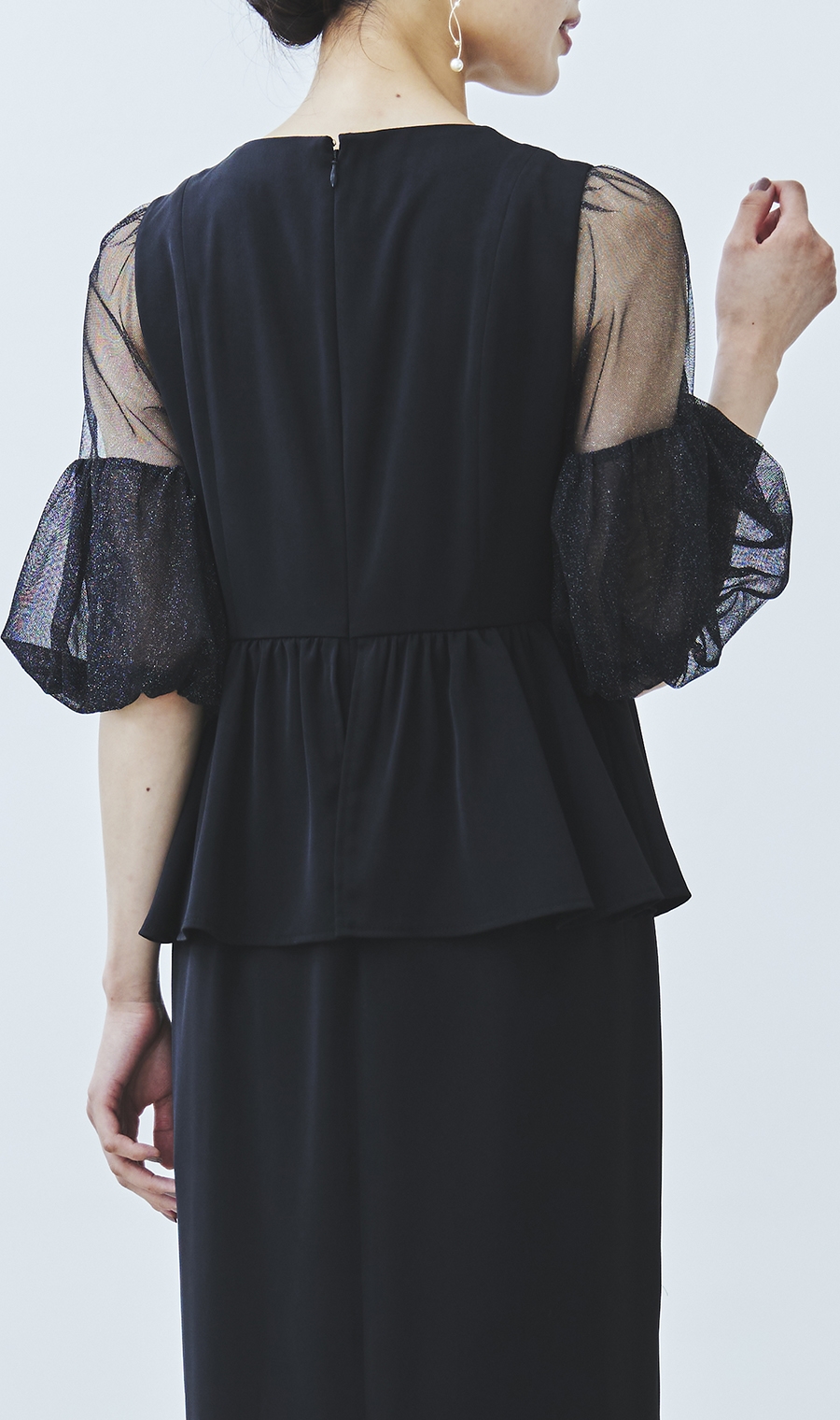 昨今のトレンドディテールである袖ボリュームを程良く取り入れ、ウエスト部分のペプラムデザインとの相性もばっちりです。