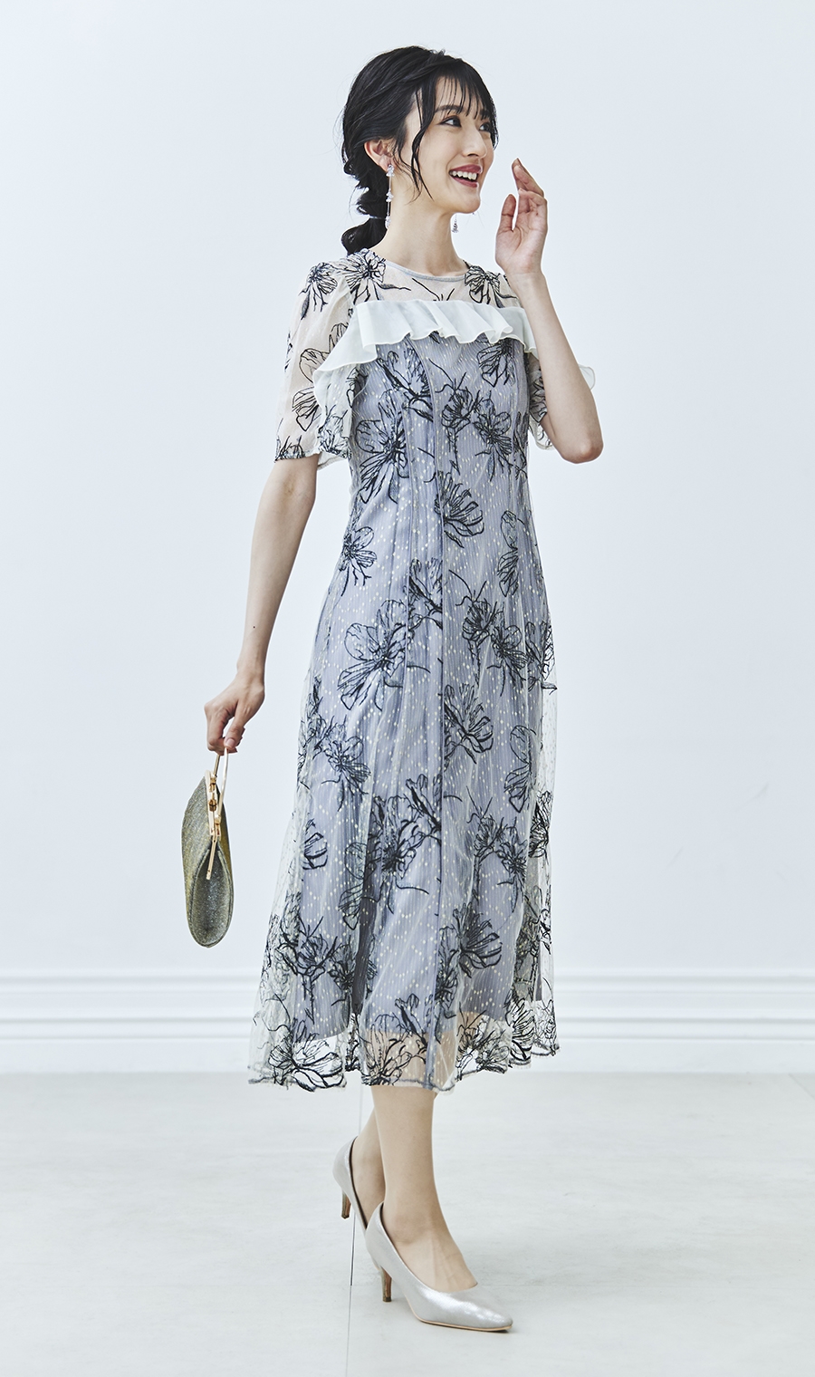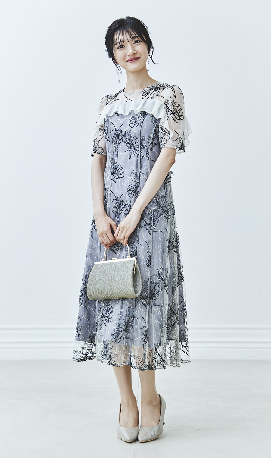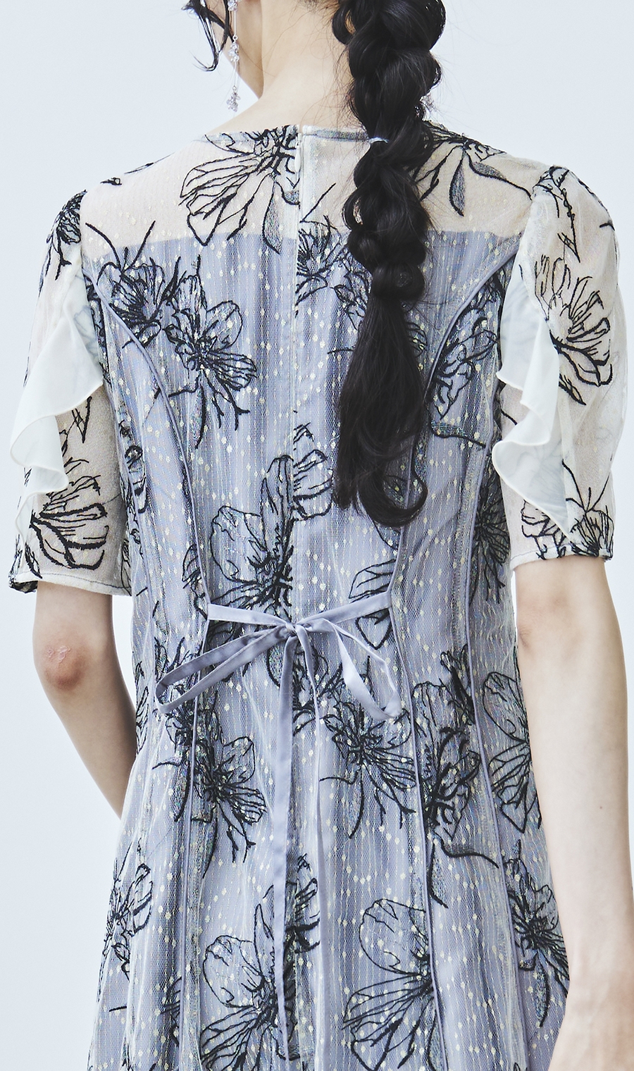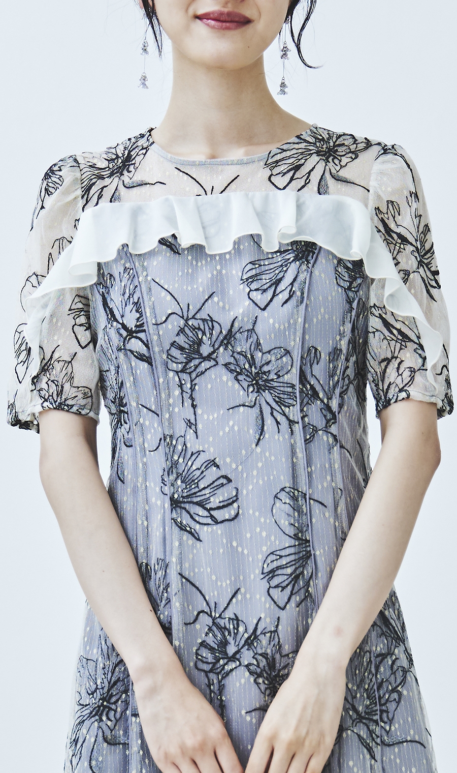 ラメを織り込んだフラワー刺繍の生地を贅沢にあしらった華やかなドレス。