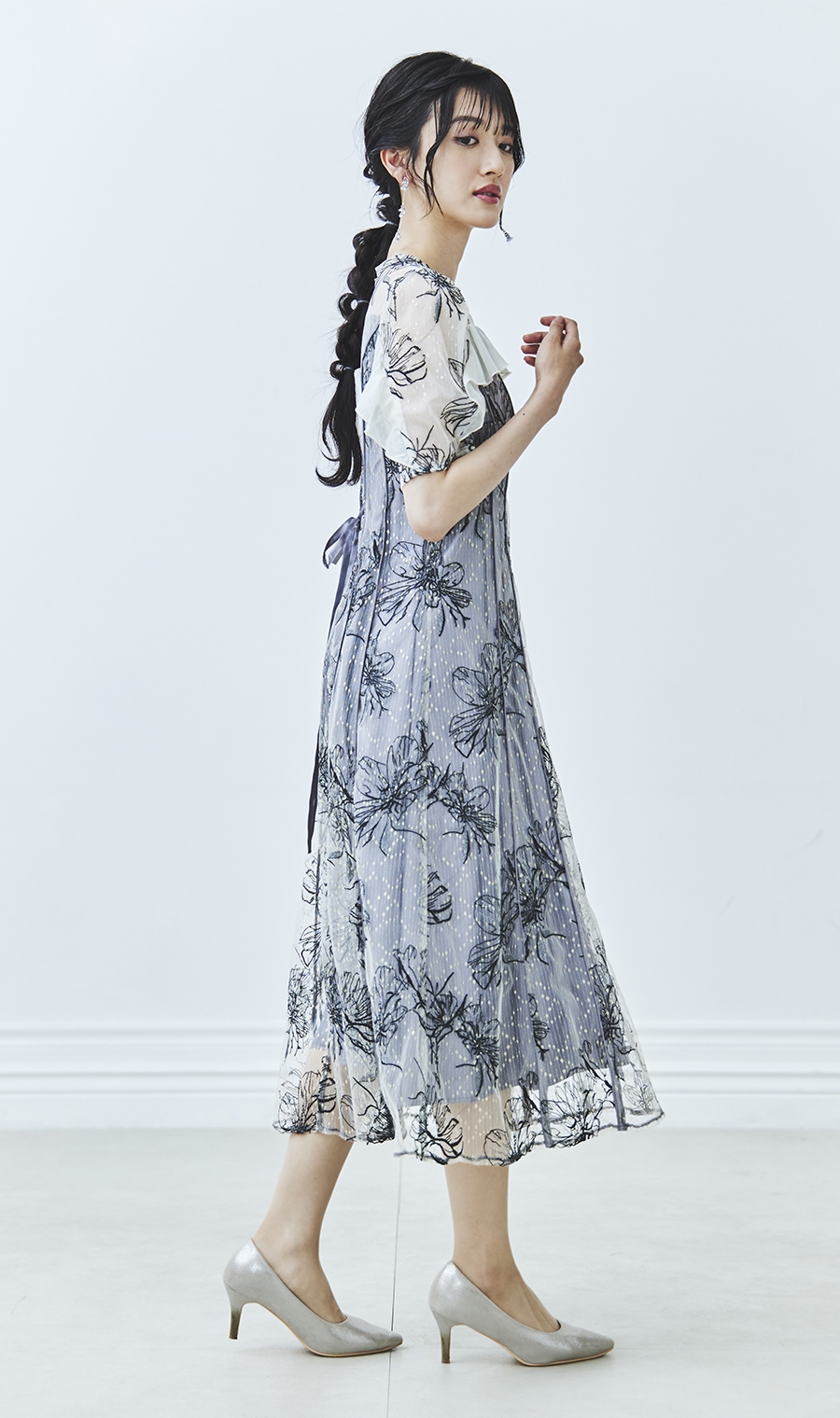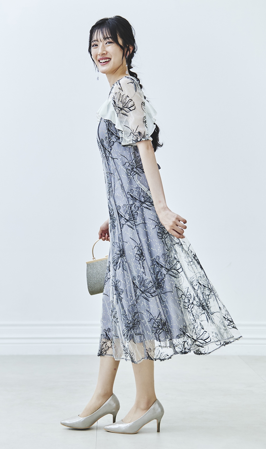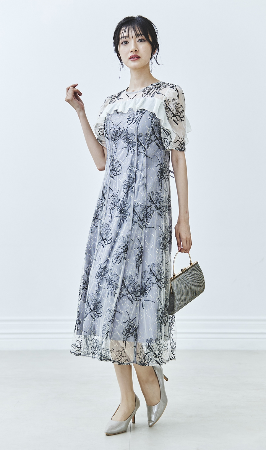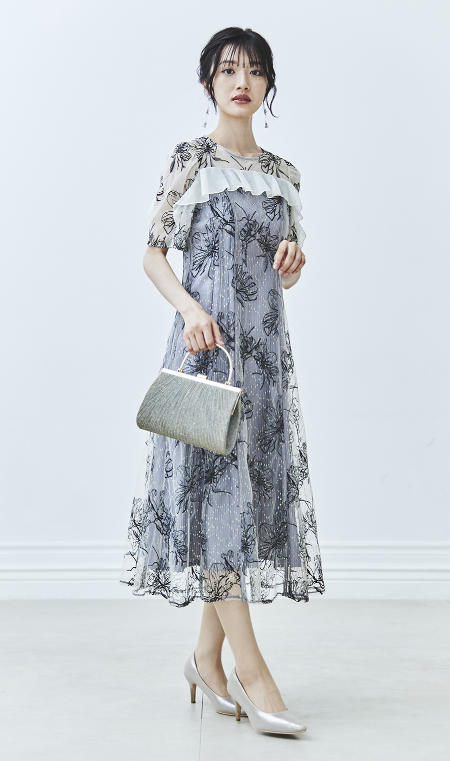 ラメを織り込んだフラワー刺繍の生地を贅沢にあしらった華やかなドレス。