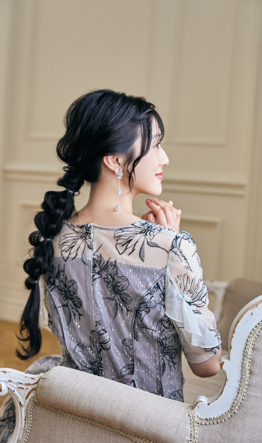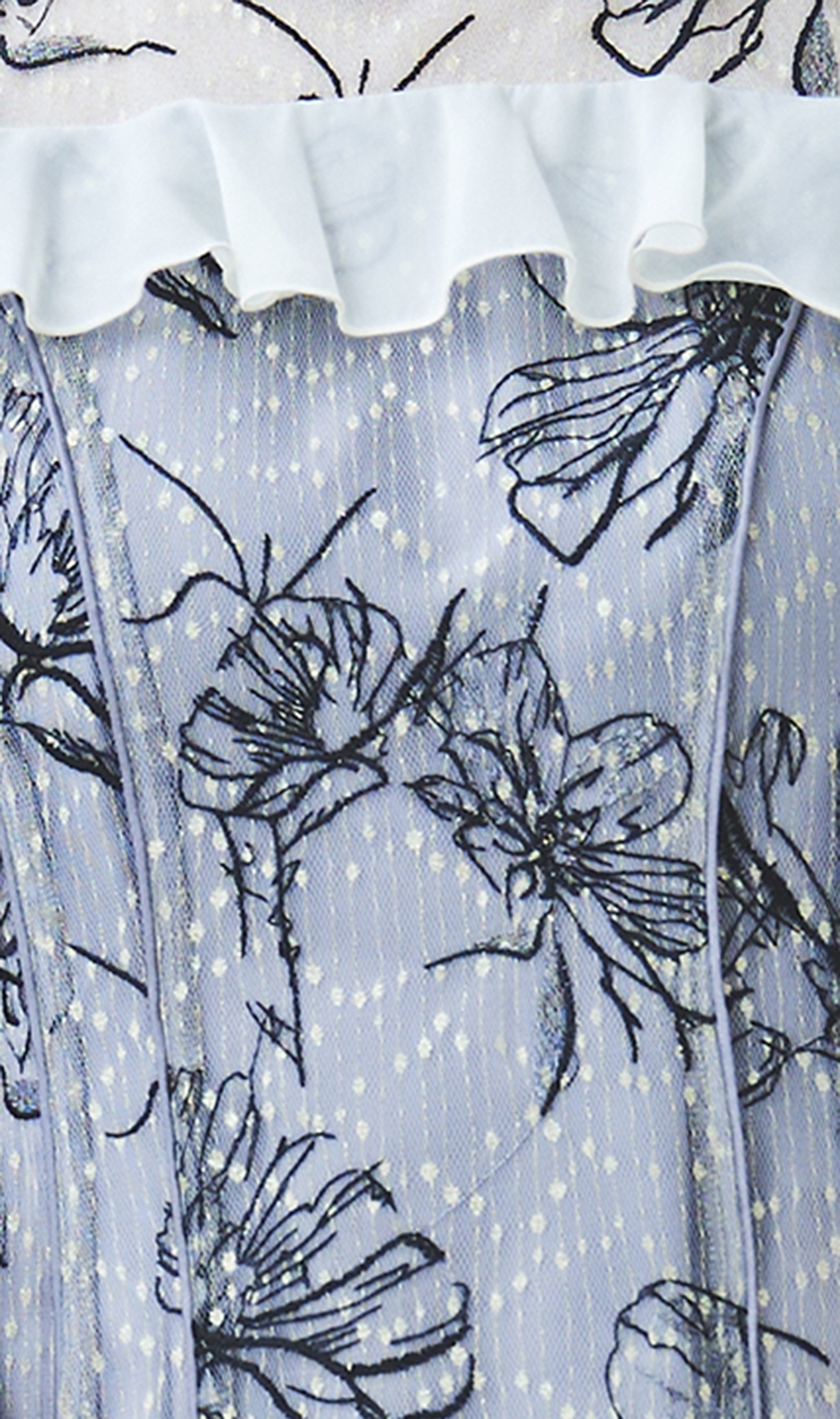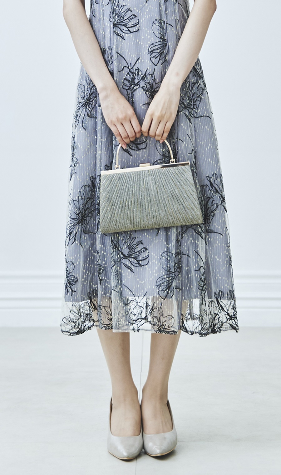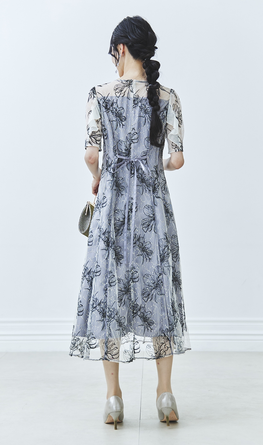 ラメを織り込んだフラワー刺繍の生地を贅沢にあしらった華やかなドレス。