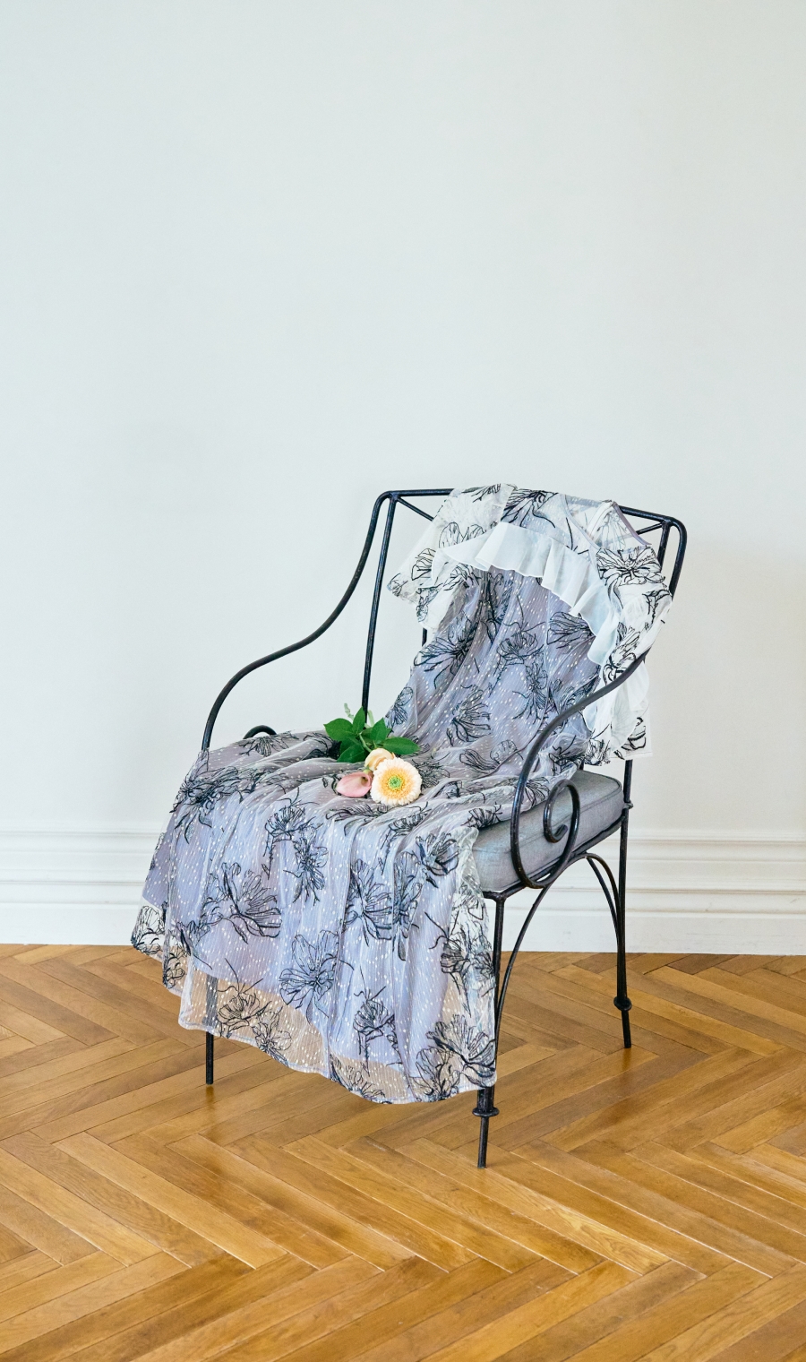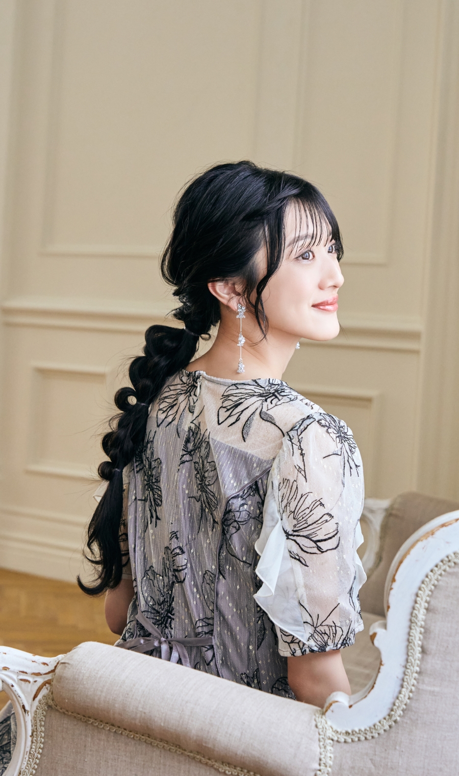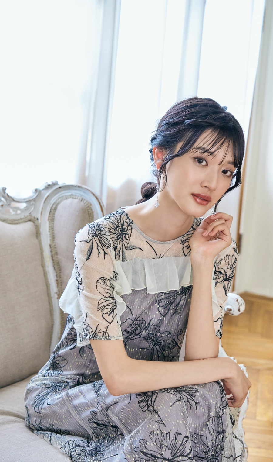 さらに、バストまわりに軽やかなシフォン素材を取り入れることで、今季らしいトレンド感を添えています。