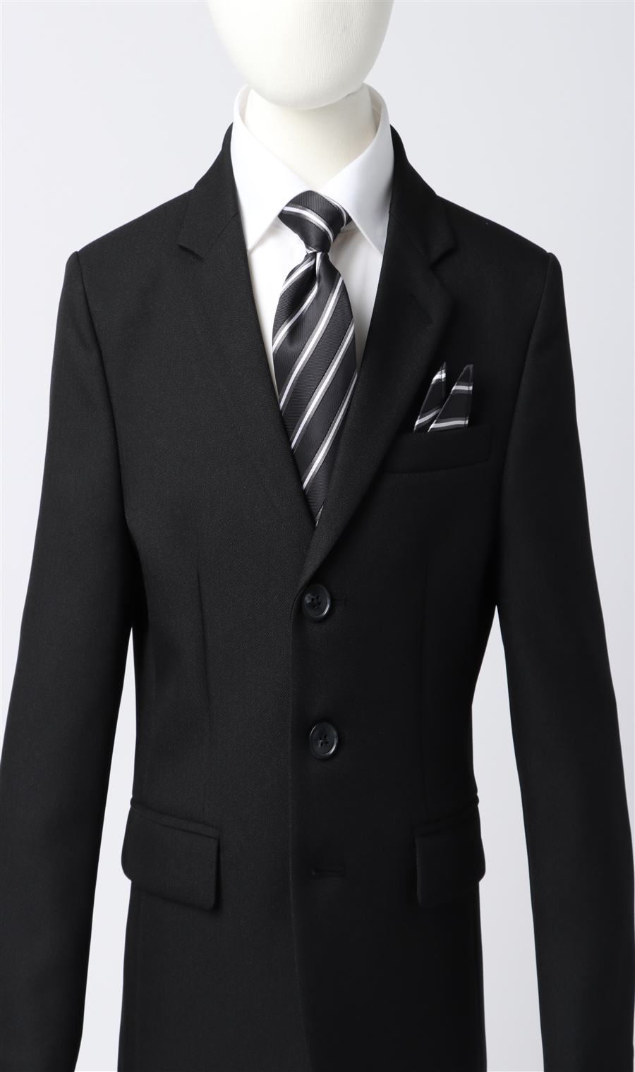 【キッズスーツ / セットアップ】ヘリンボーン柄 ブラックスーツ 白シャツ×レジメンタルタイセット(140〜150cm)