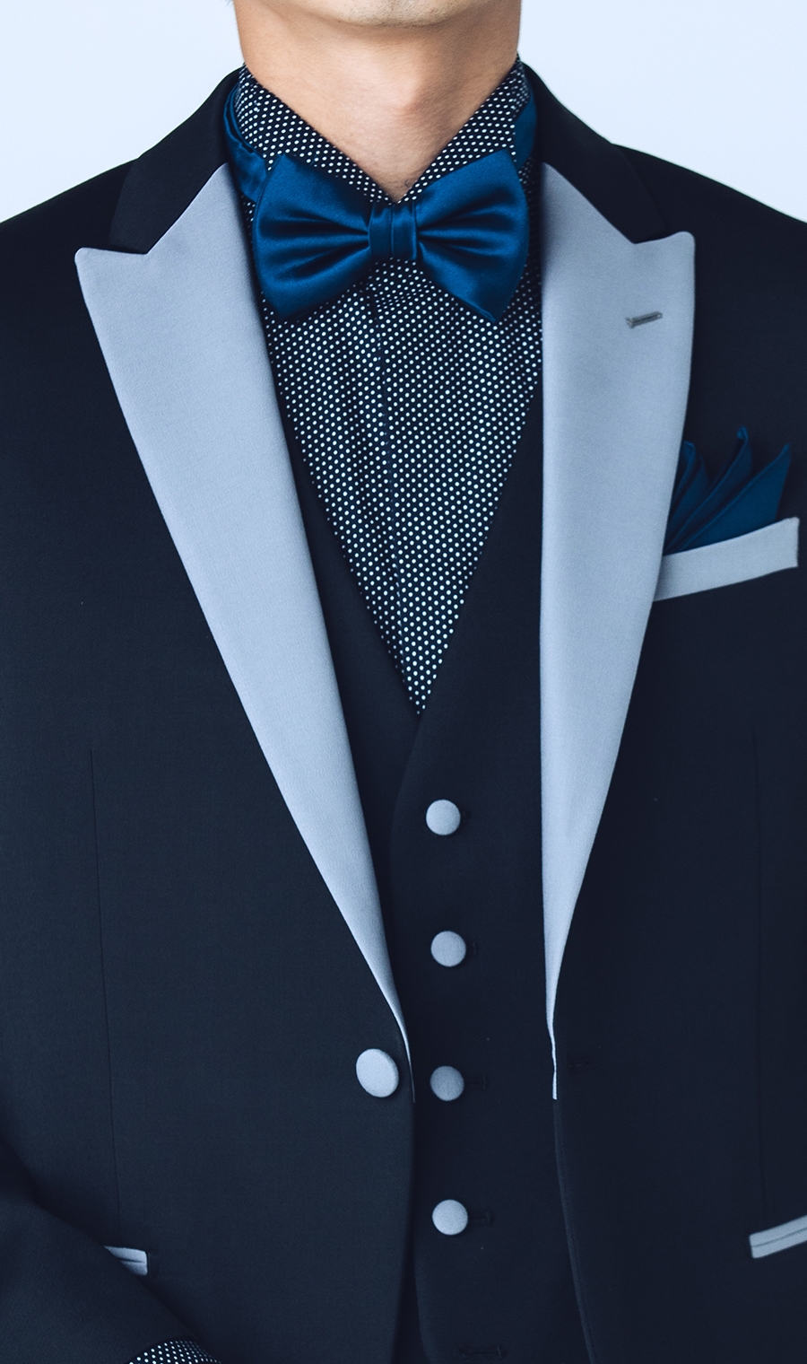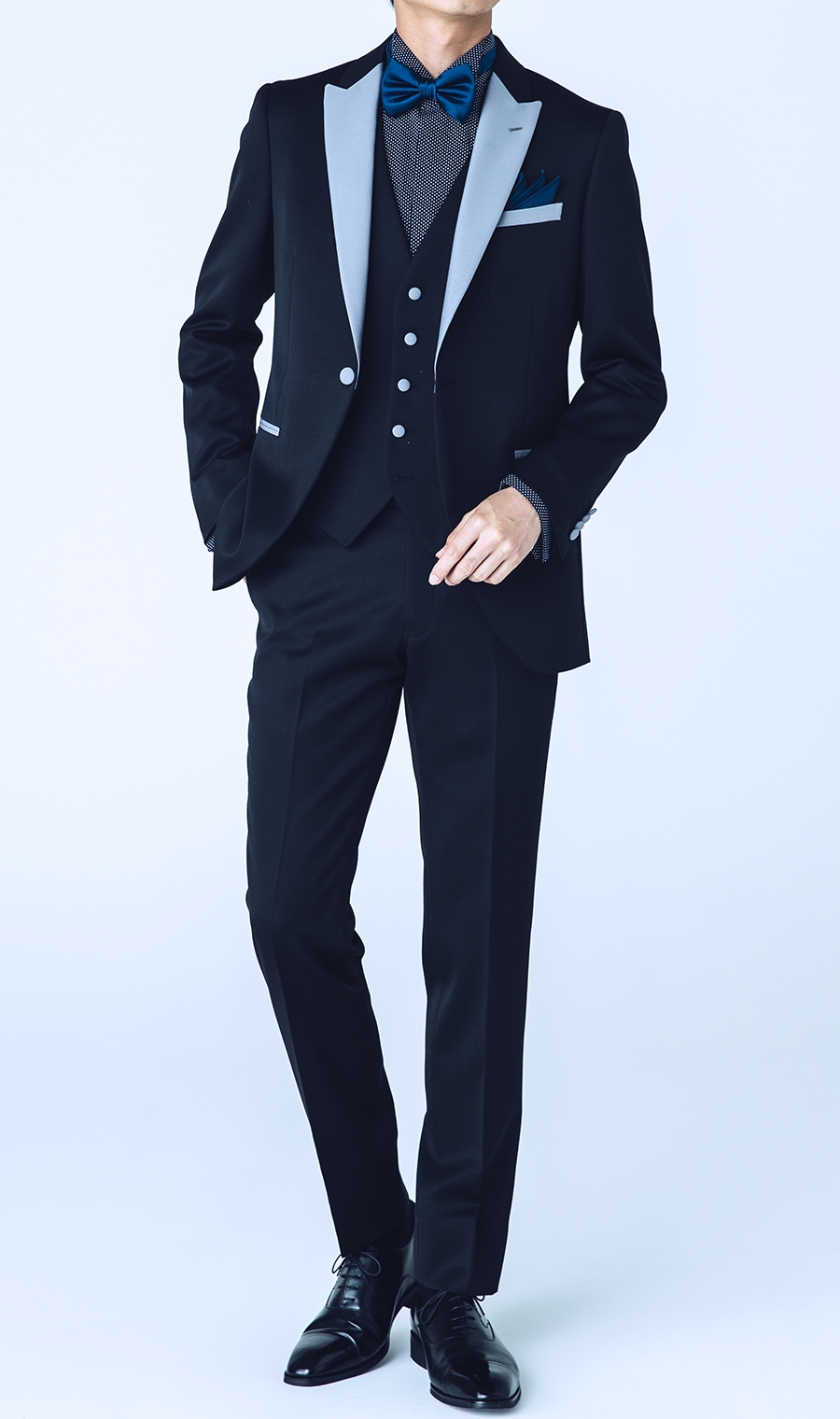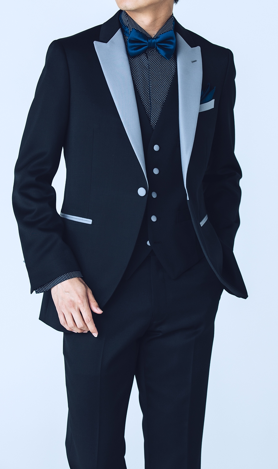 生地の光沢、デザイン共に華やかさを演出してくれるパーティスーツ。