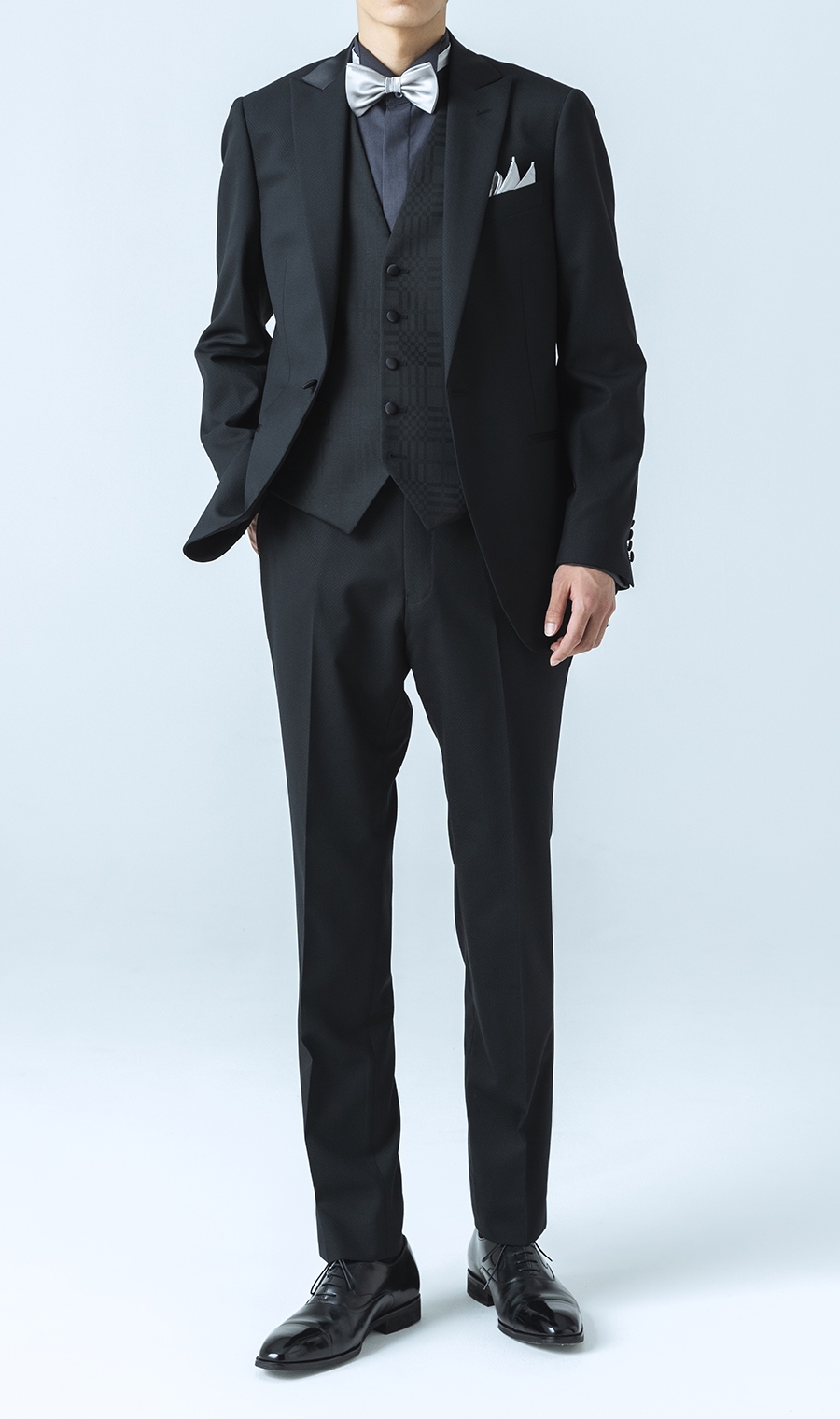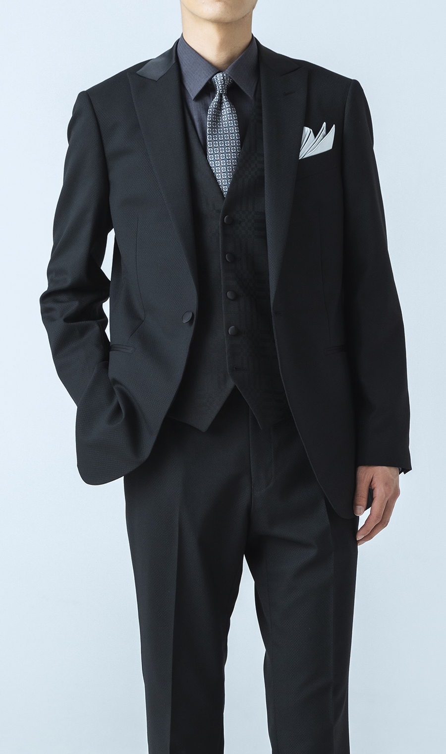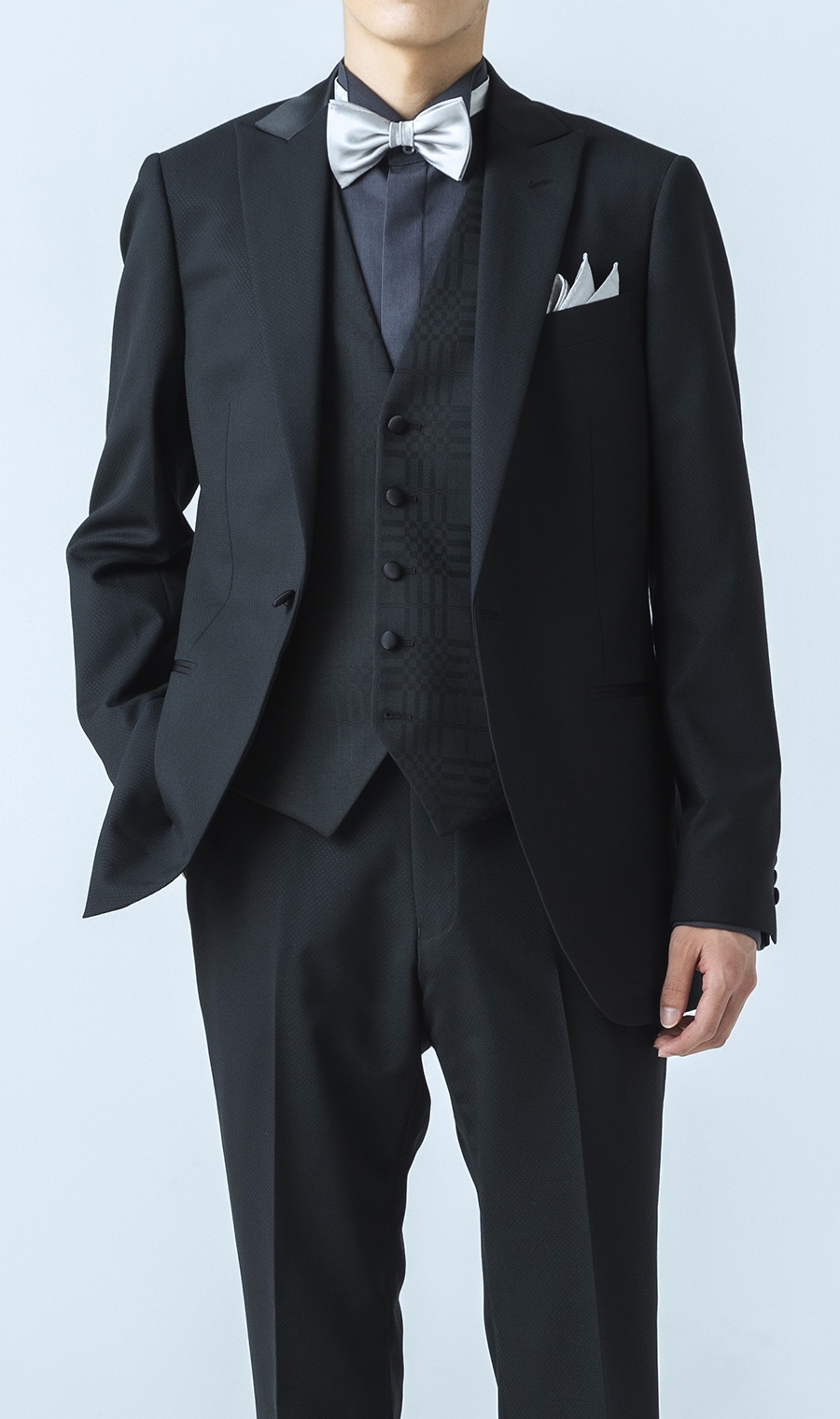 VEST生地はスーツの柄と違ったシャードー柄を用いる事でアクセントを加え、艶やかさと華やかさを備えた全てのセレモニーシーンの味方となるパーティーフォーマル スーツ。
