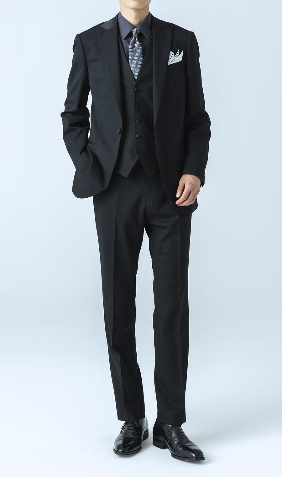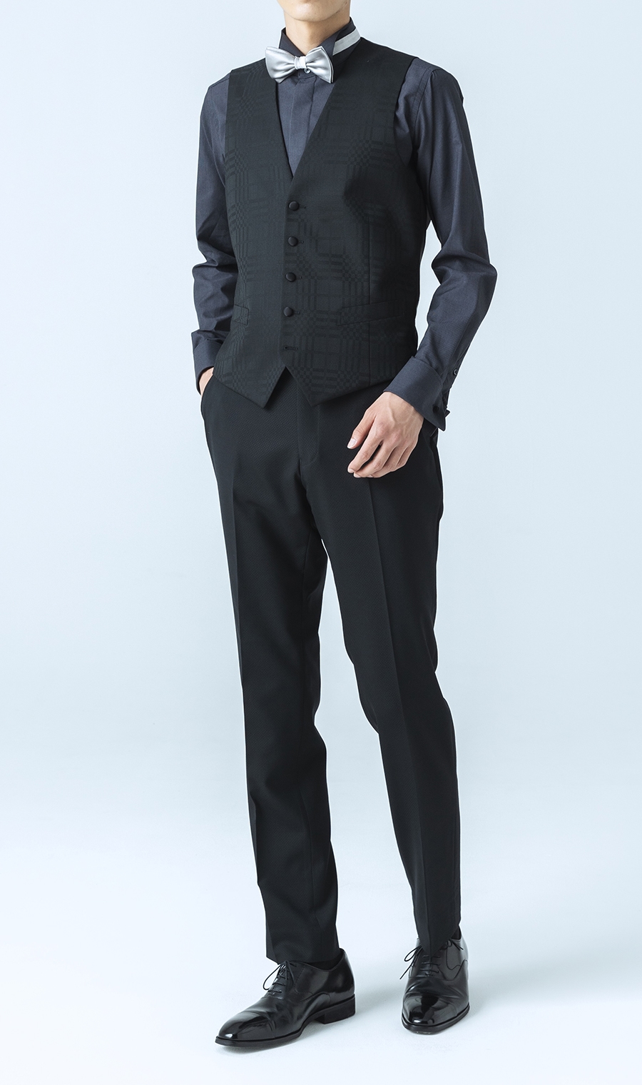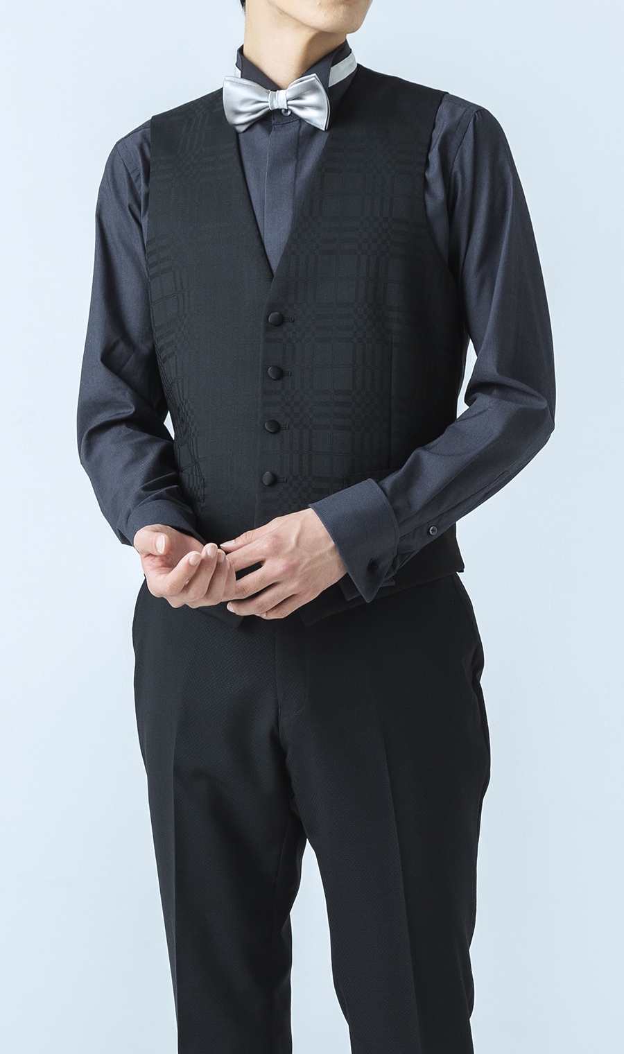 VEST生地はスーツの柄と違ったシャードー柄を用いる事でアクセントを加え、艶やかさと華やかさを備えた全てのセレモニーシーンの味方となるパーティーフォーマル スーツ。