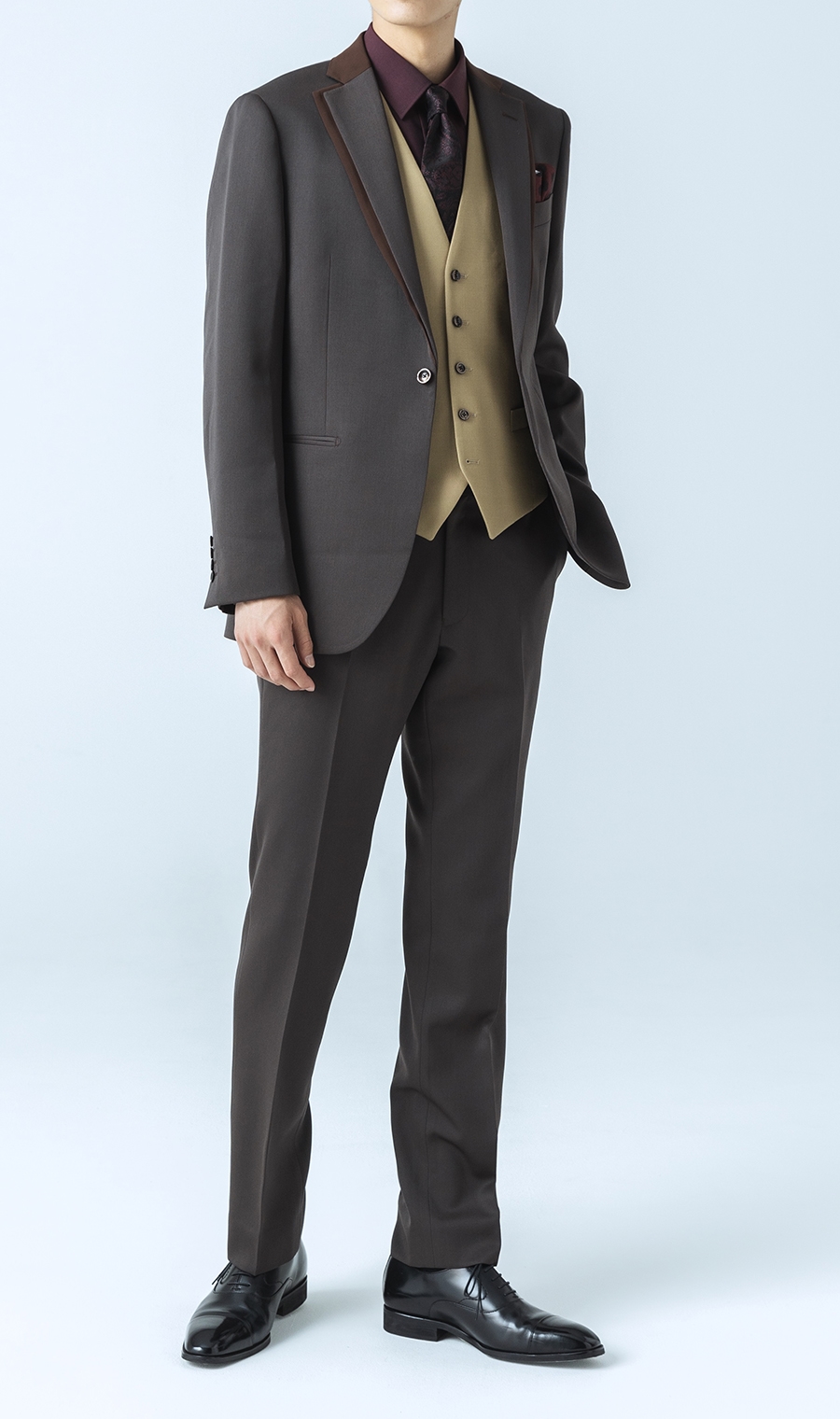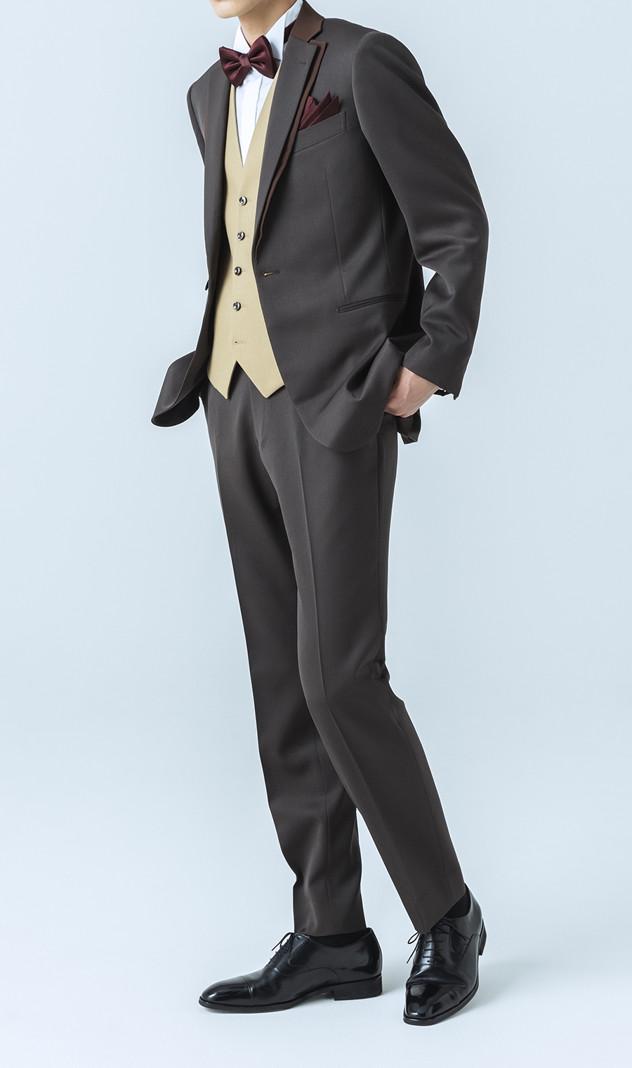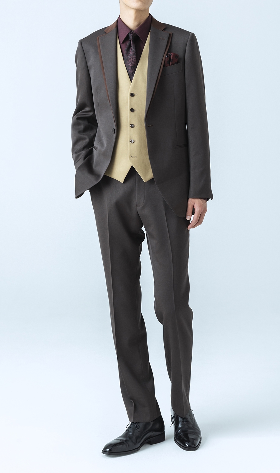 落ち着きのあるブラウン素材にウールの上品さをMIXし、華やかなセレモニーの場を上品に演出するパーティーフォーマル スーツ。