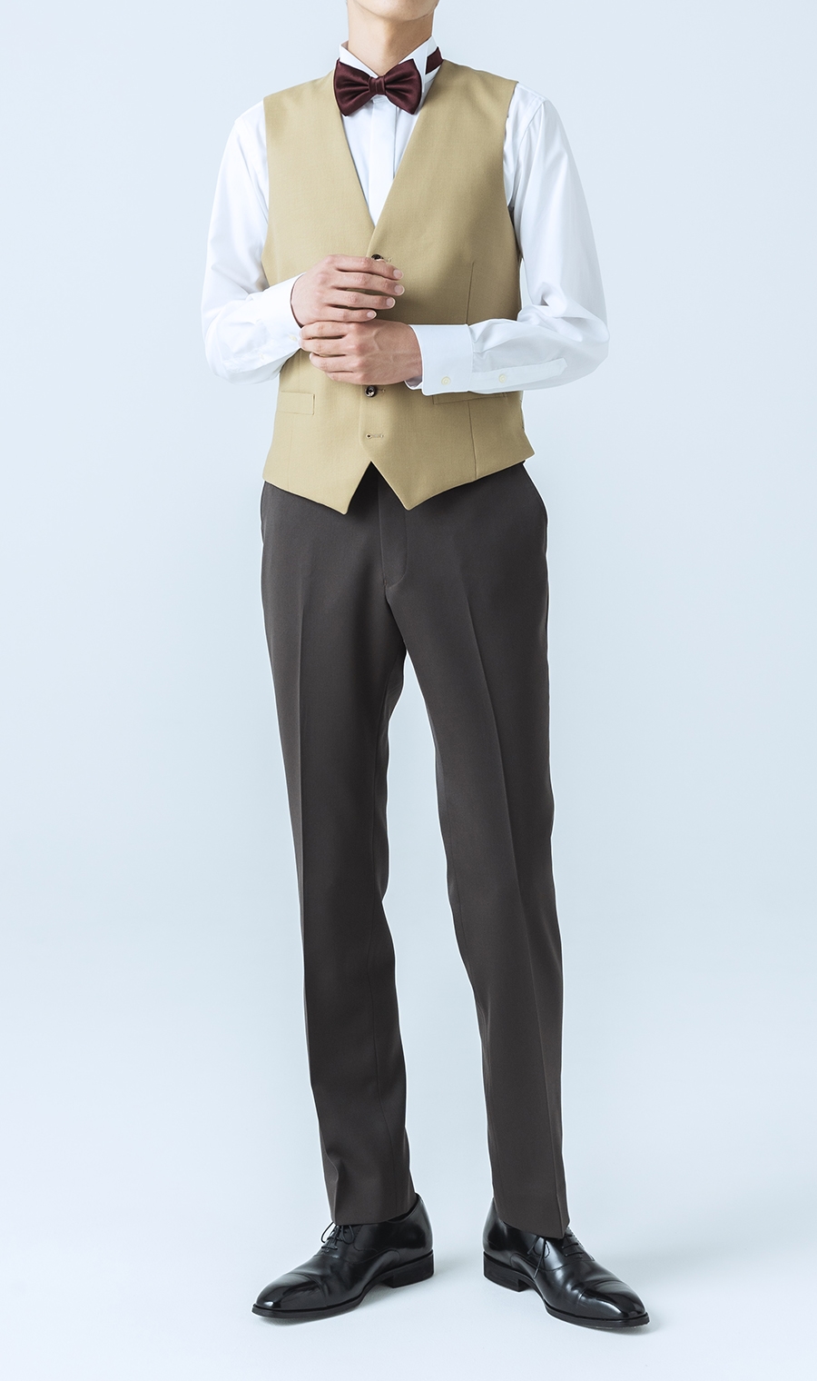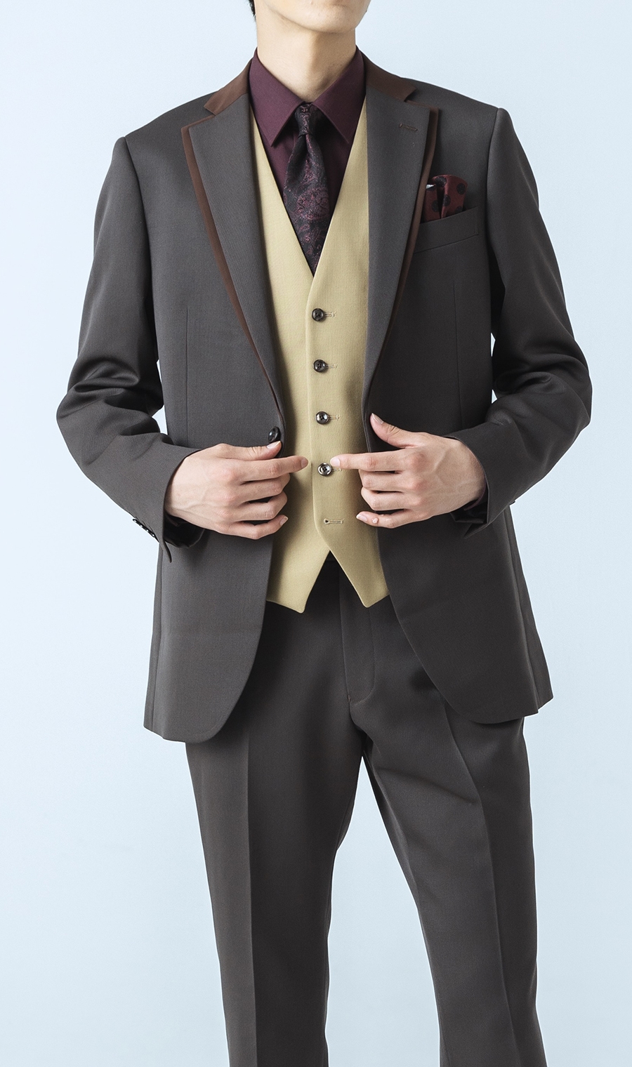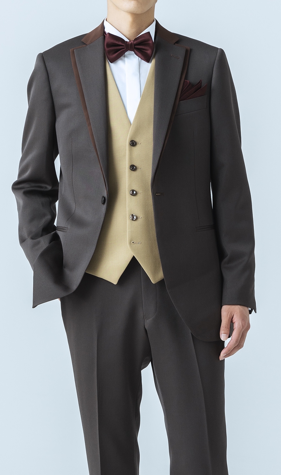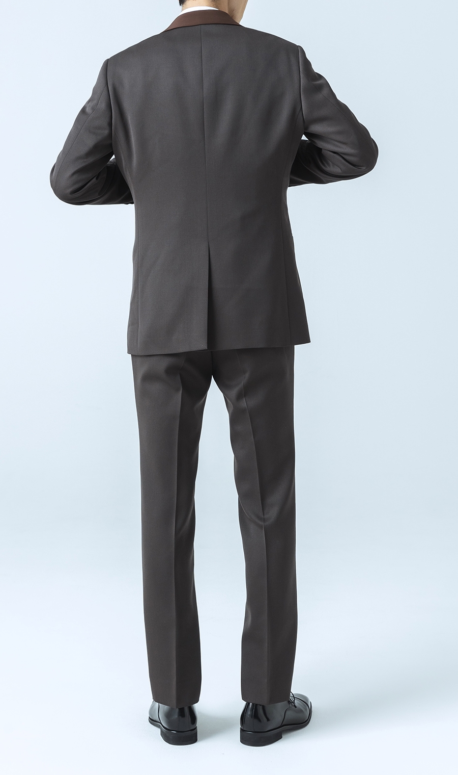 落ち着きのあるブラウン素材にウールの上品さをMIXし、華やかなセレモニーの場を上品に演出するパーティーフォーマル スーツ。