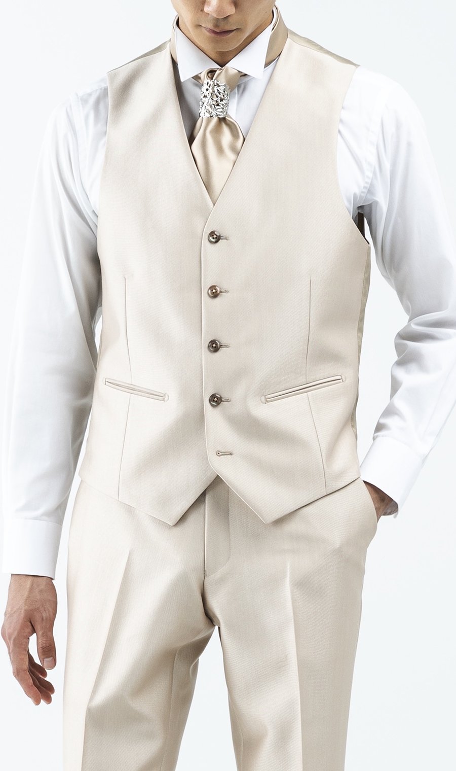 光り輝く表情を活かすため、癖のないツイル組織にて構成されたブライダル専用素材。