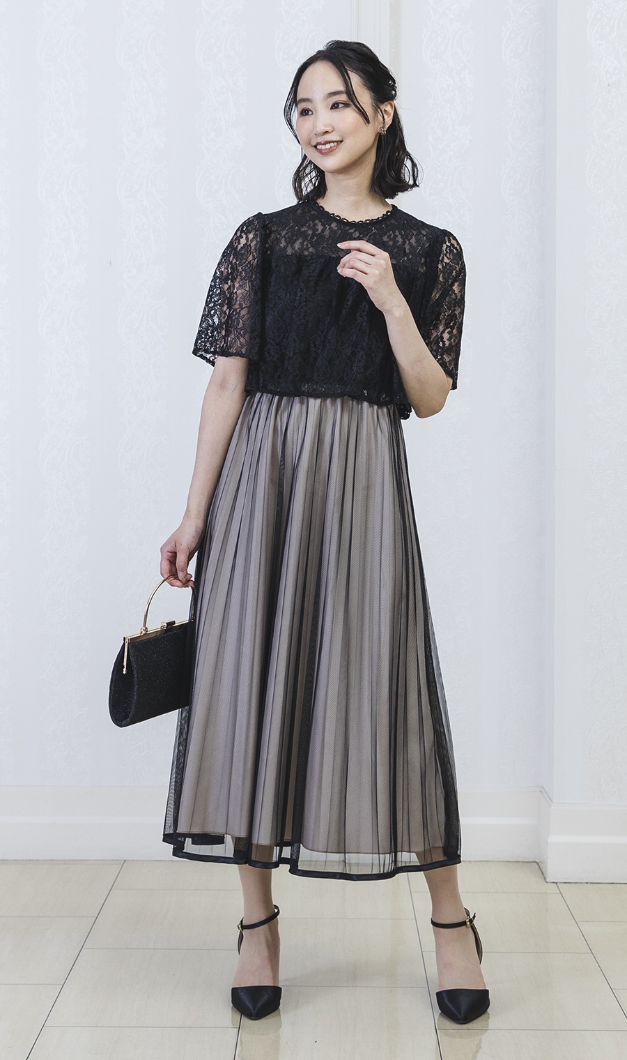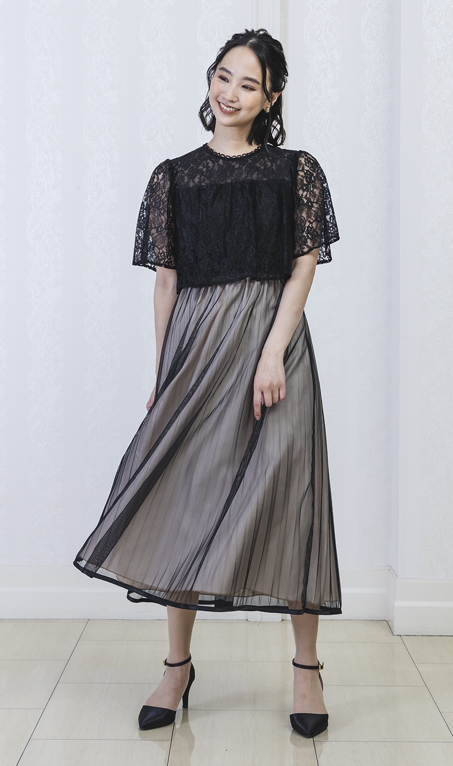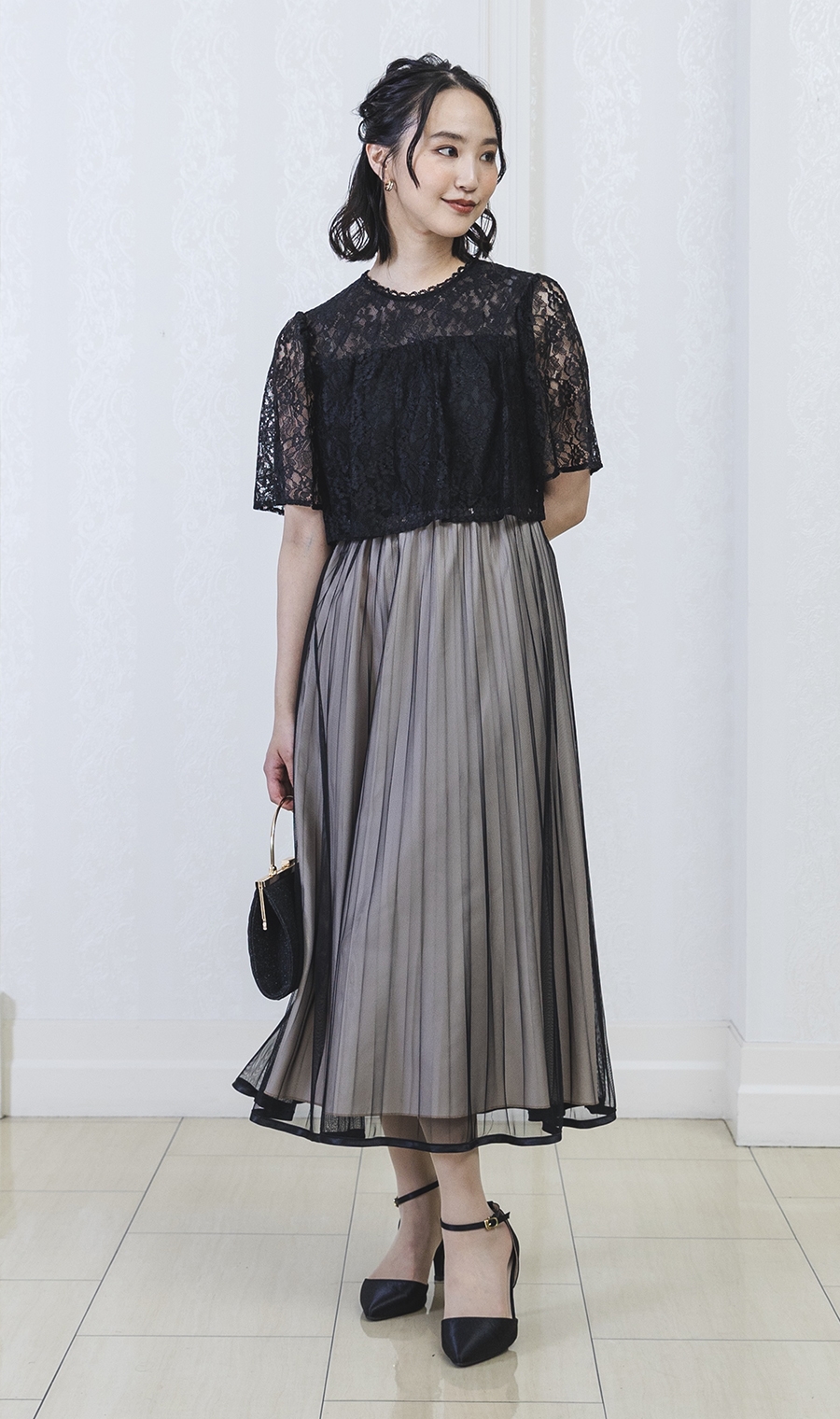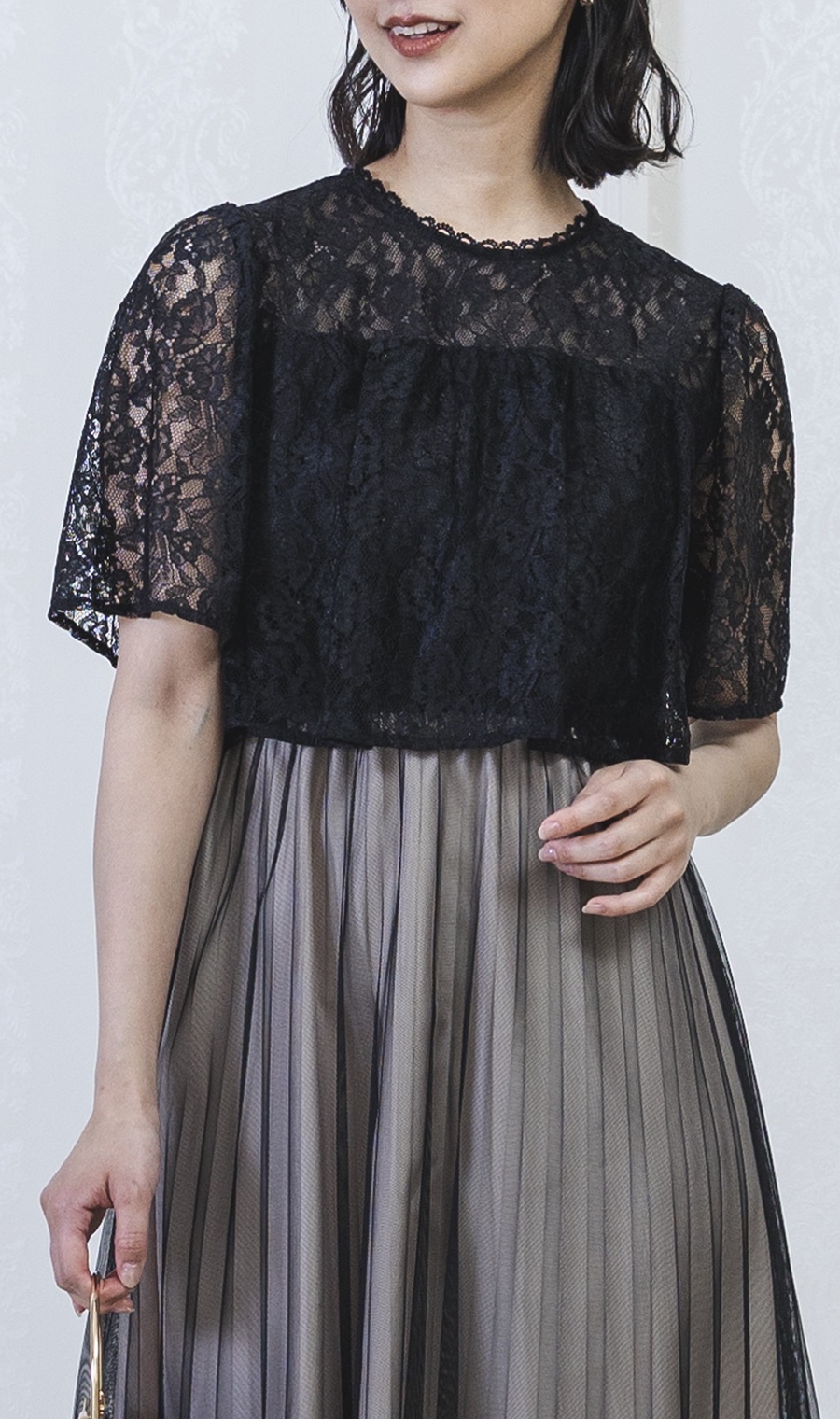 レース×チュールプリーツでエレガントなムードを演出するワンピースドレス。
