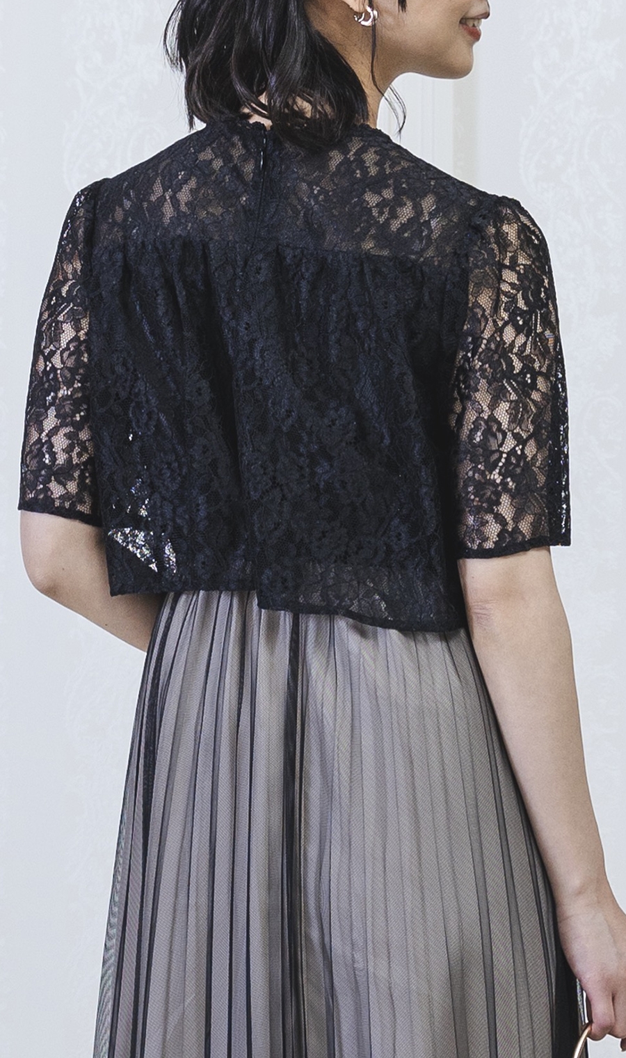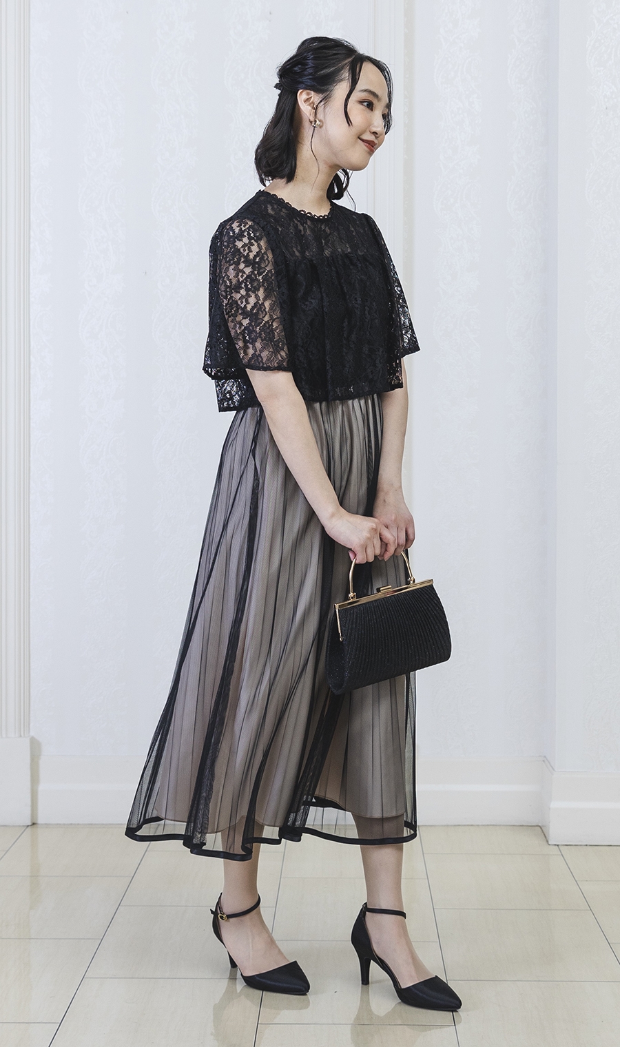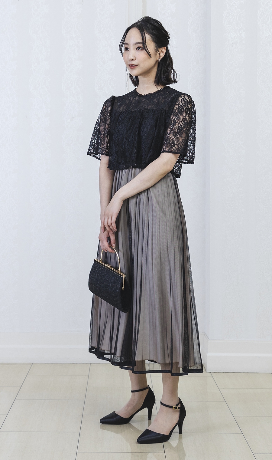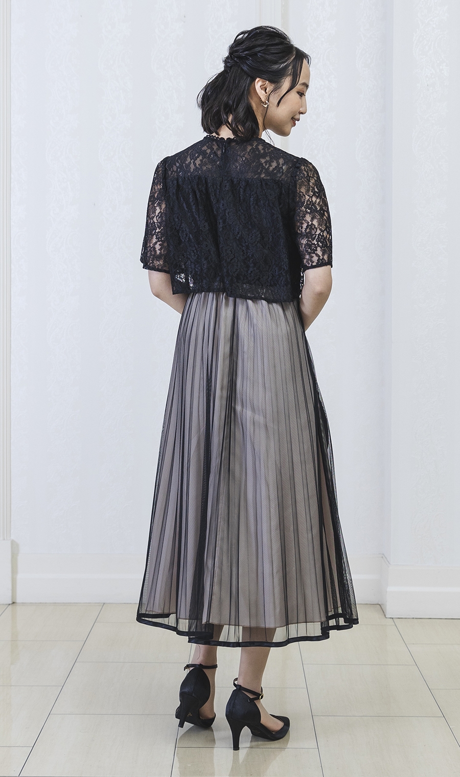 レース×チュールプリーツでエレガントなムードを演出するワンピースドレス。