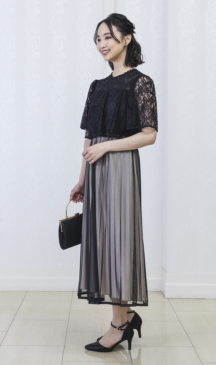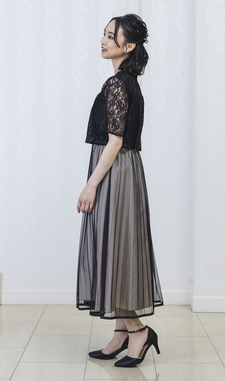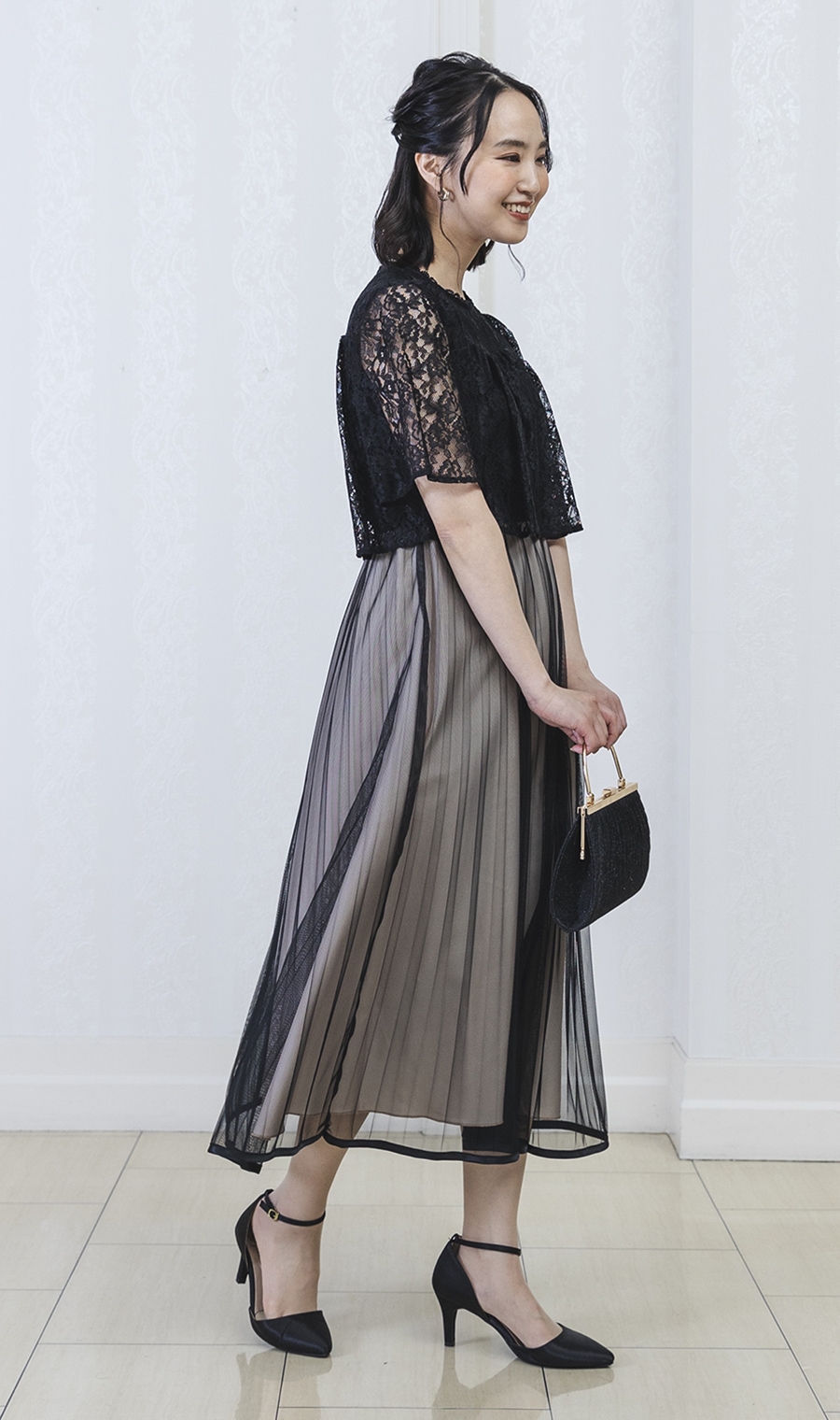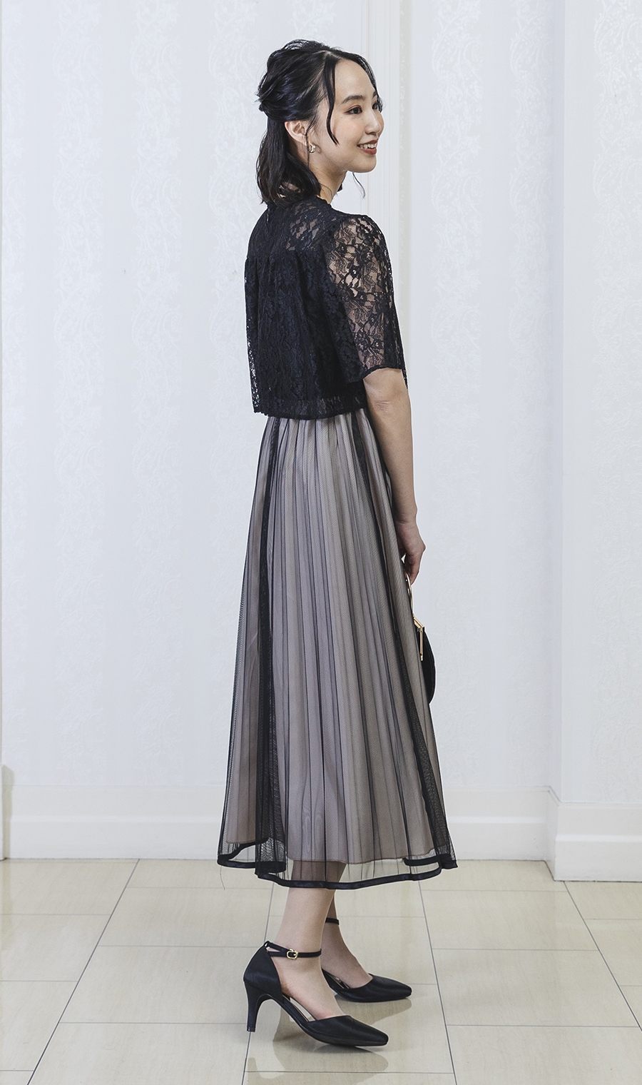 レース×チュールプリーツでエレガントなムードを演出するワンピースドレス。
