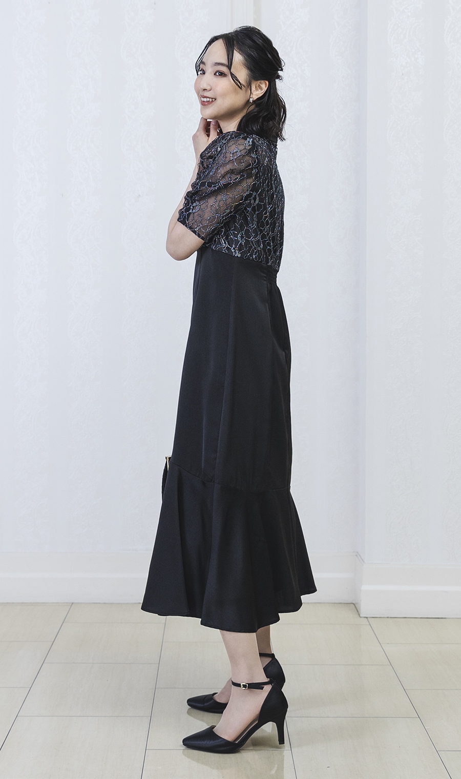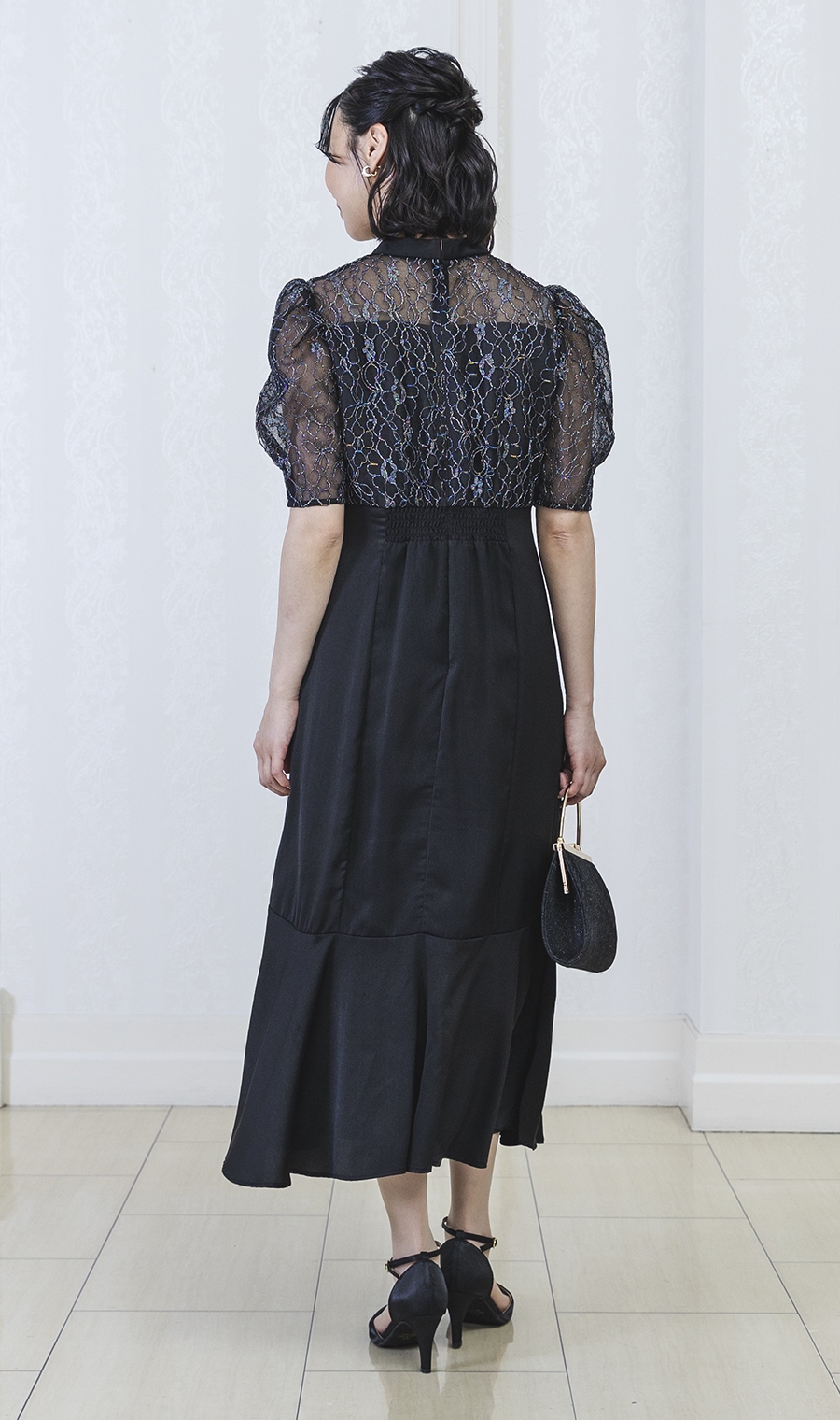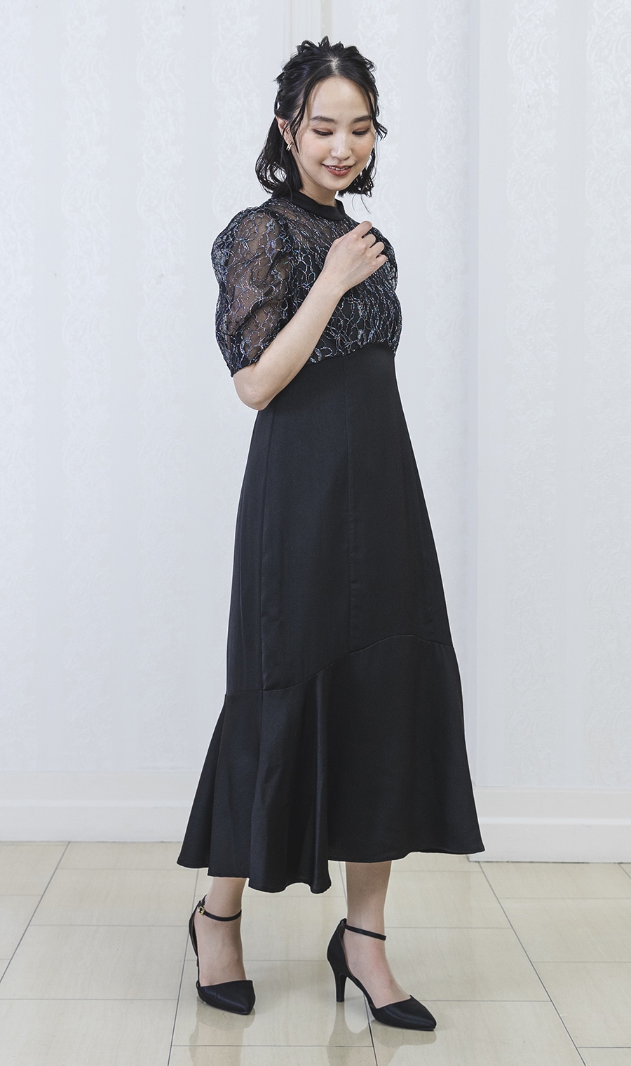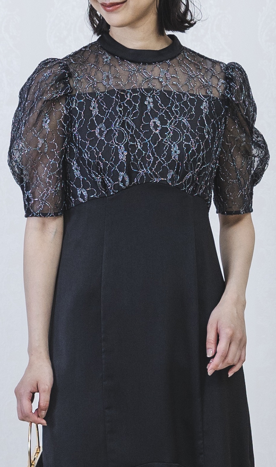 上半身に華やかな日本製のラメレース、スカート部分には光沢のあるマットサテンを使用したワンピースドレス。