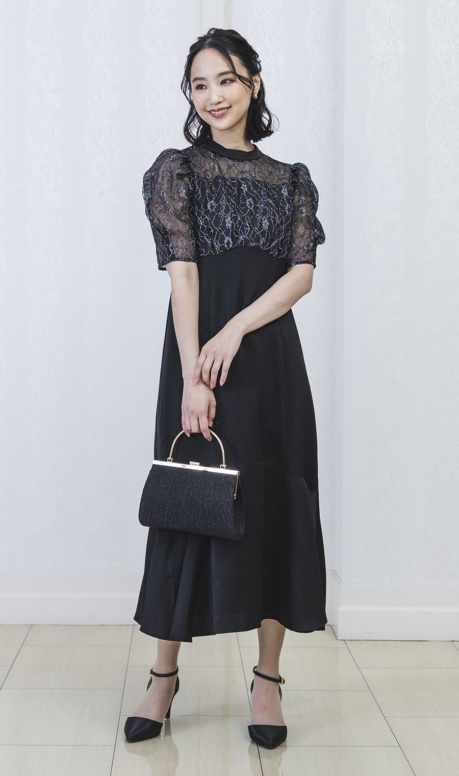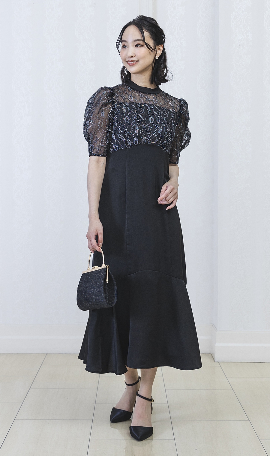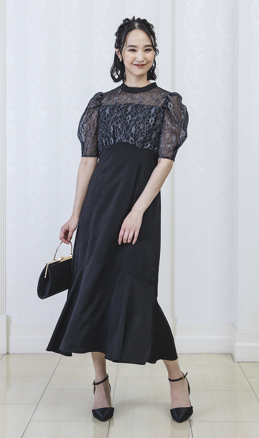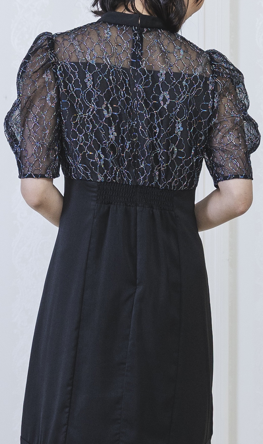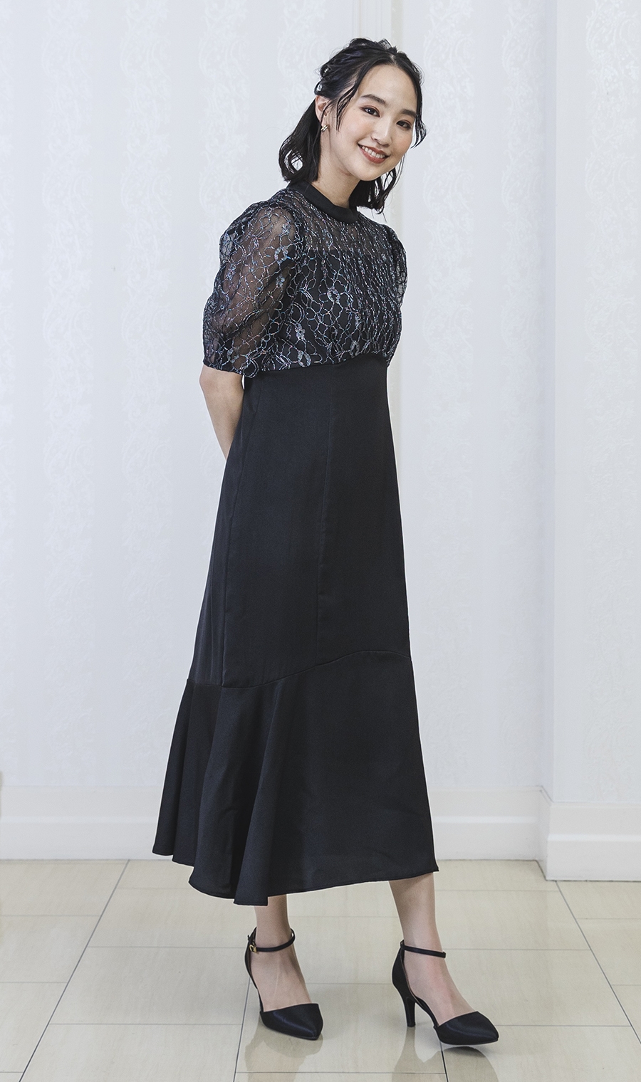 上半身に華やかな日本製のラメレース、スカート部分には光沢のあるマットサテンを使用したワンピースドレス。