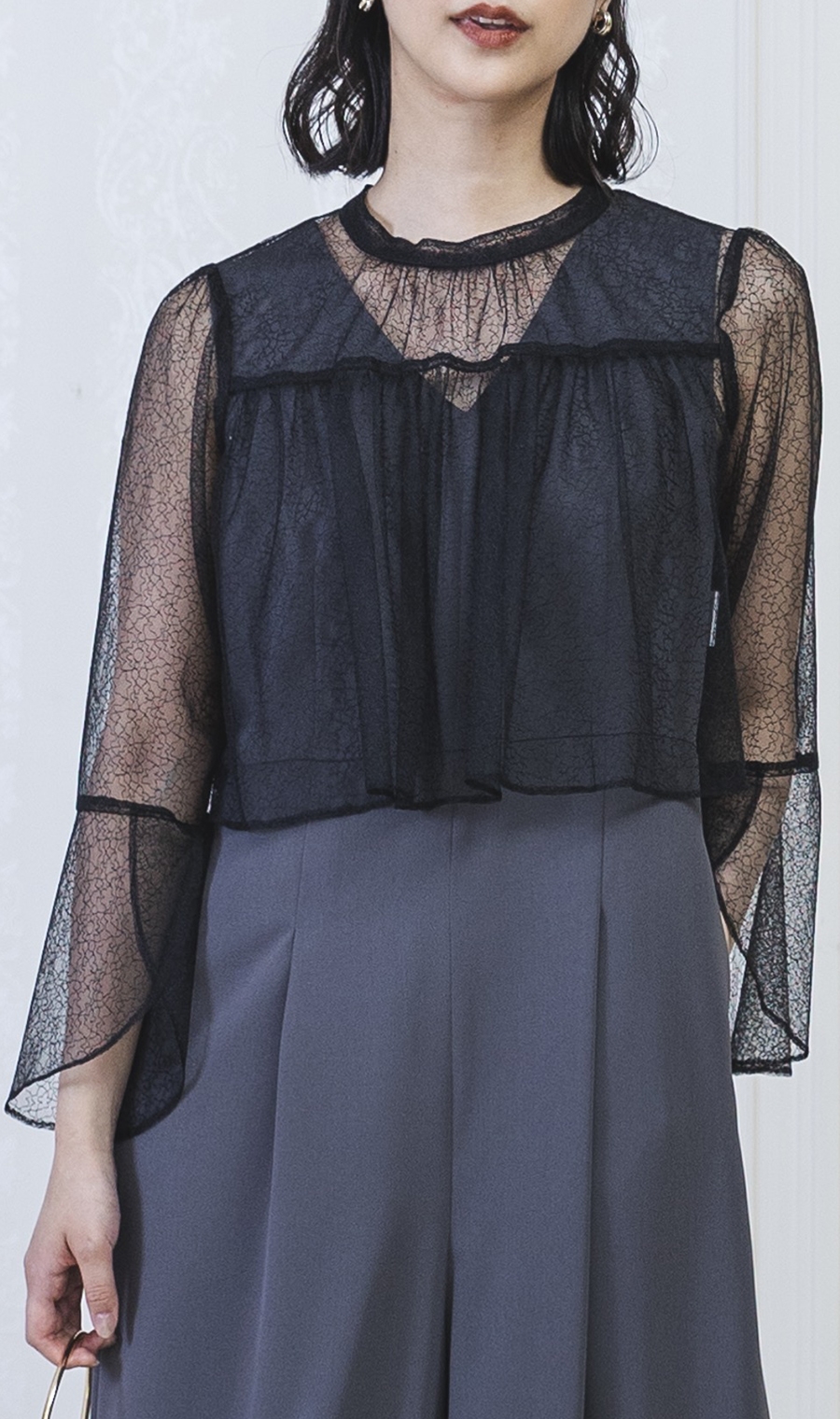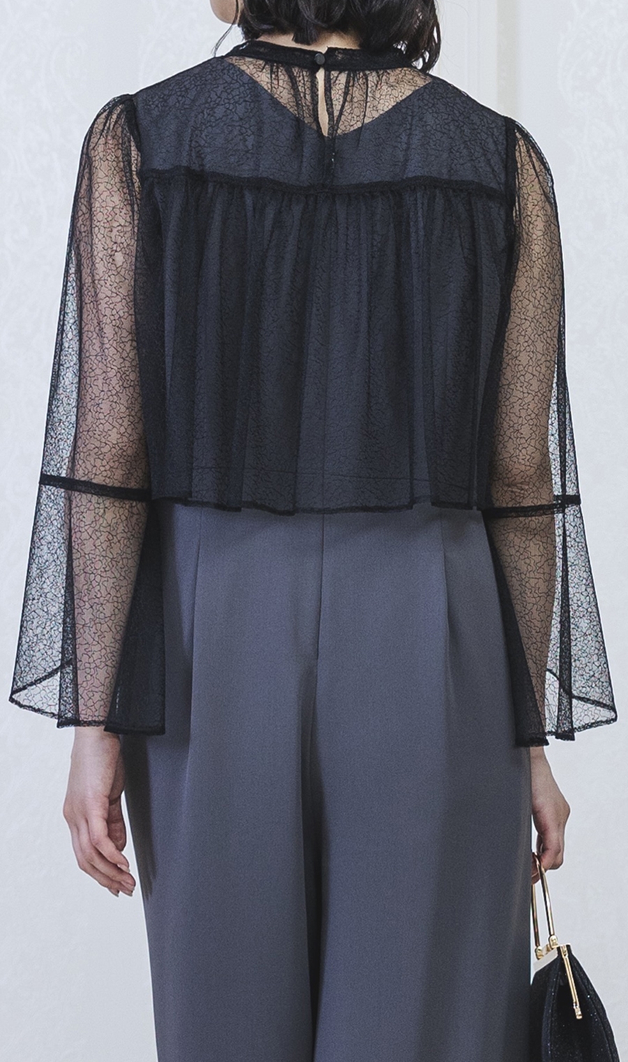 ブラウスは前後どちらを表にしても着られ、レイヤード次第で印象を変えられる一着です。