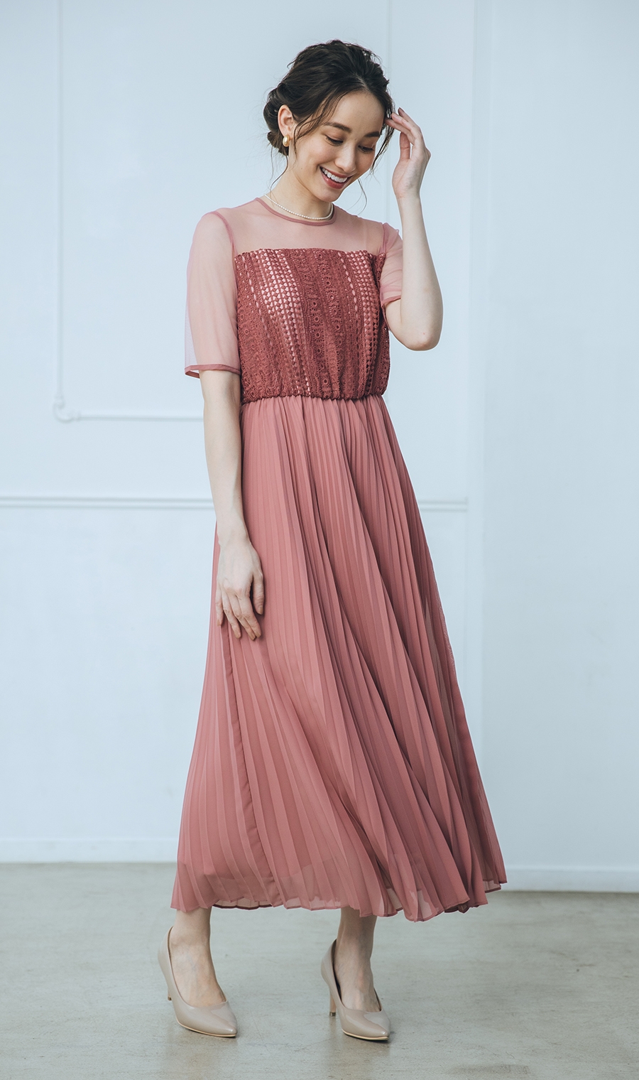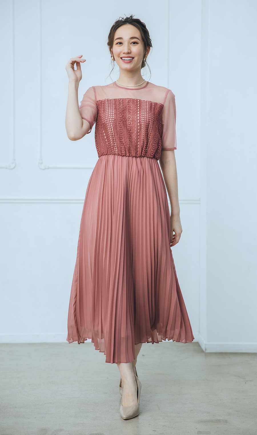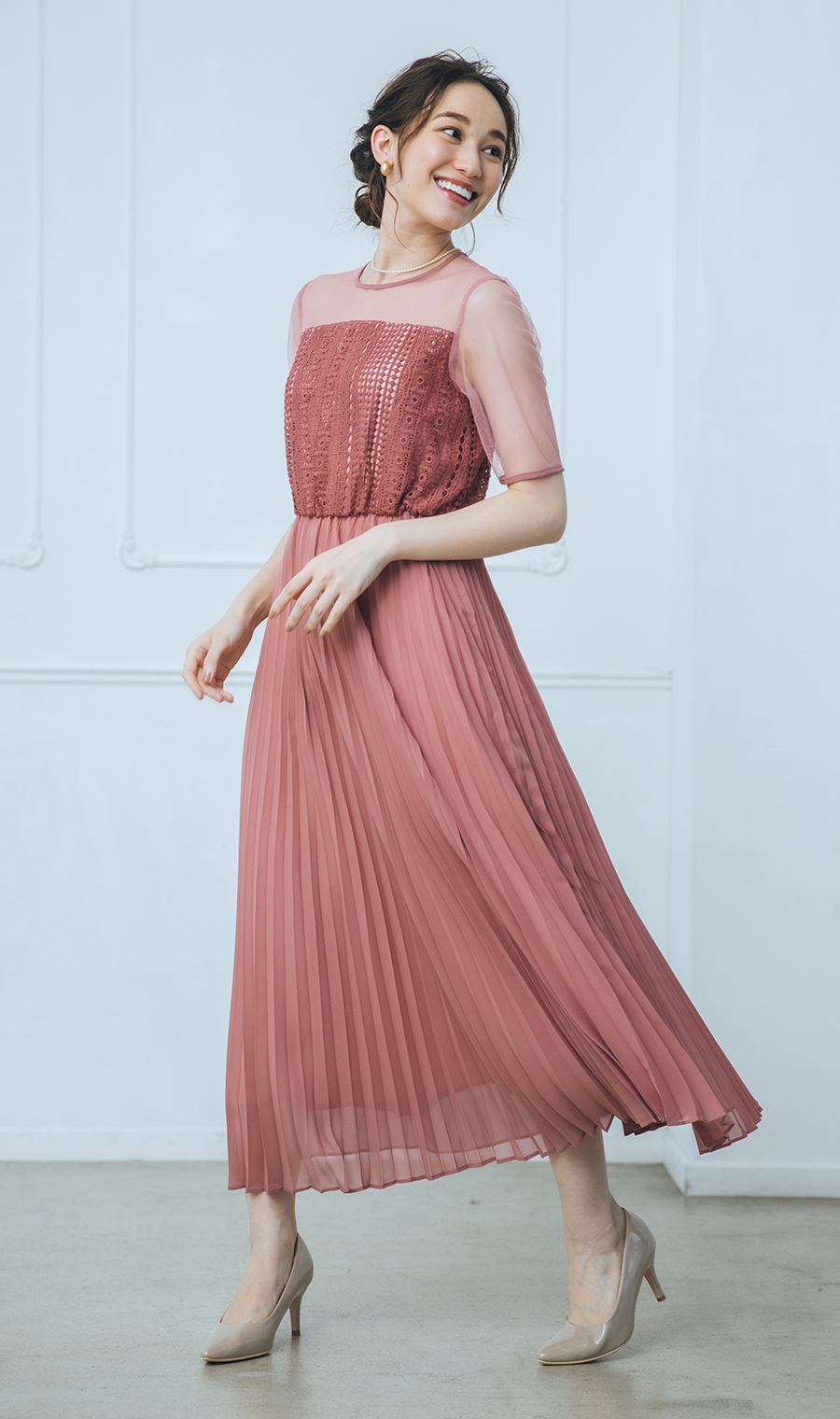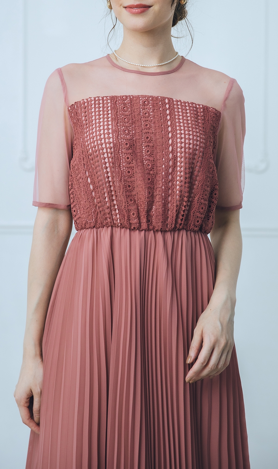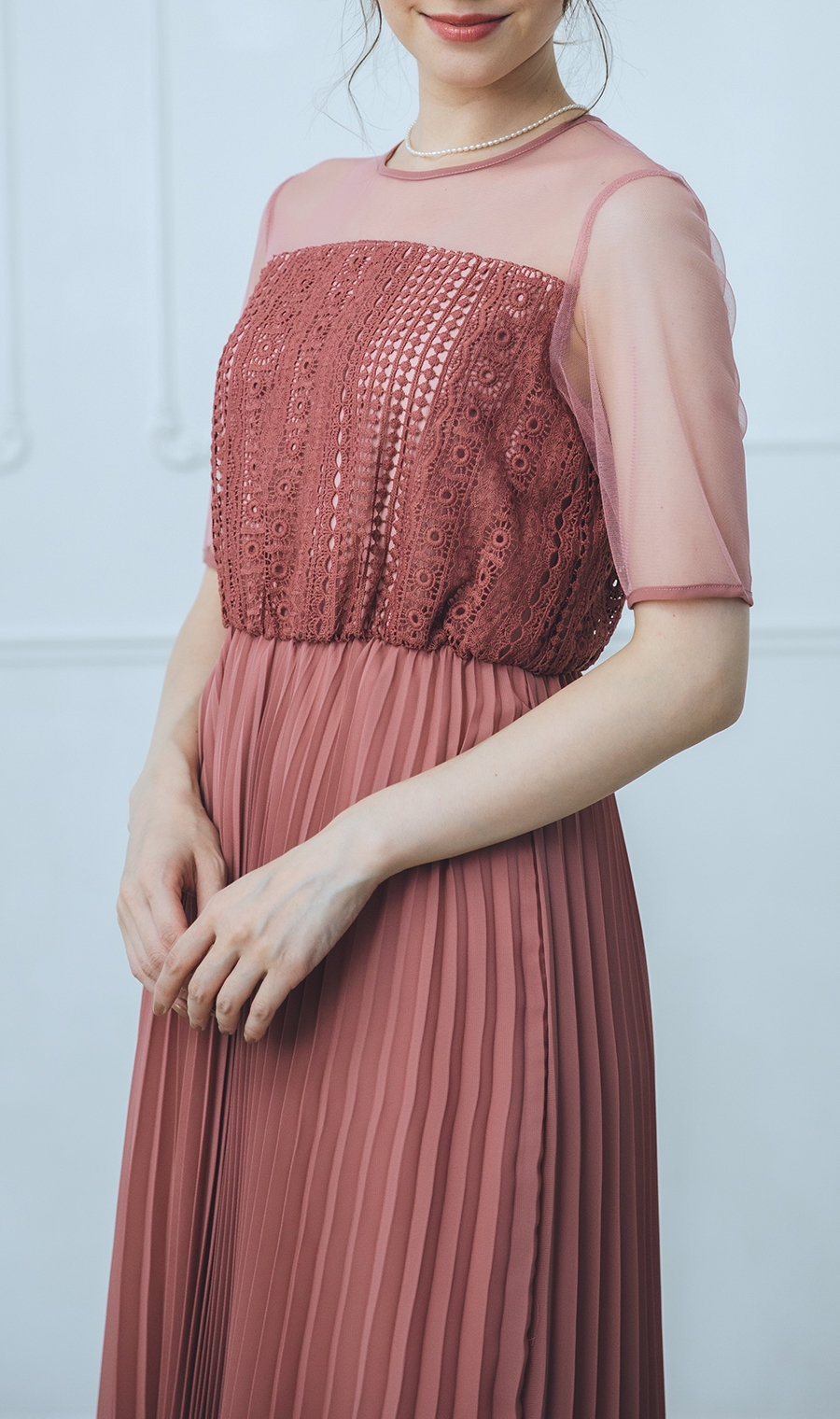 レースとシフォンの組み合わせが華やかなプリーツスカートドレス。