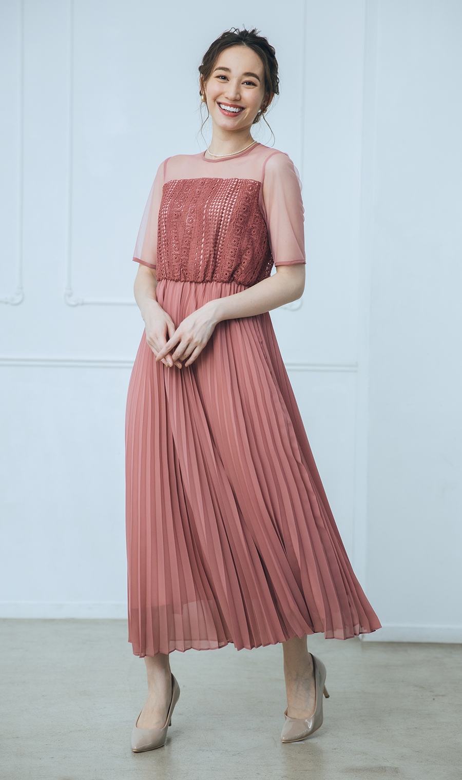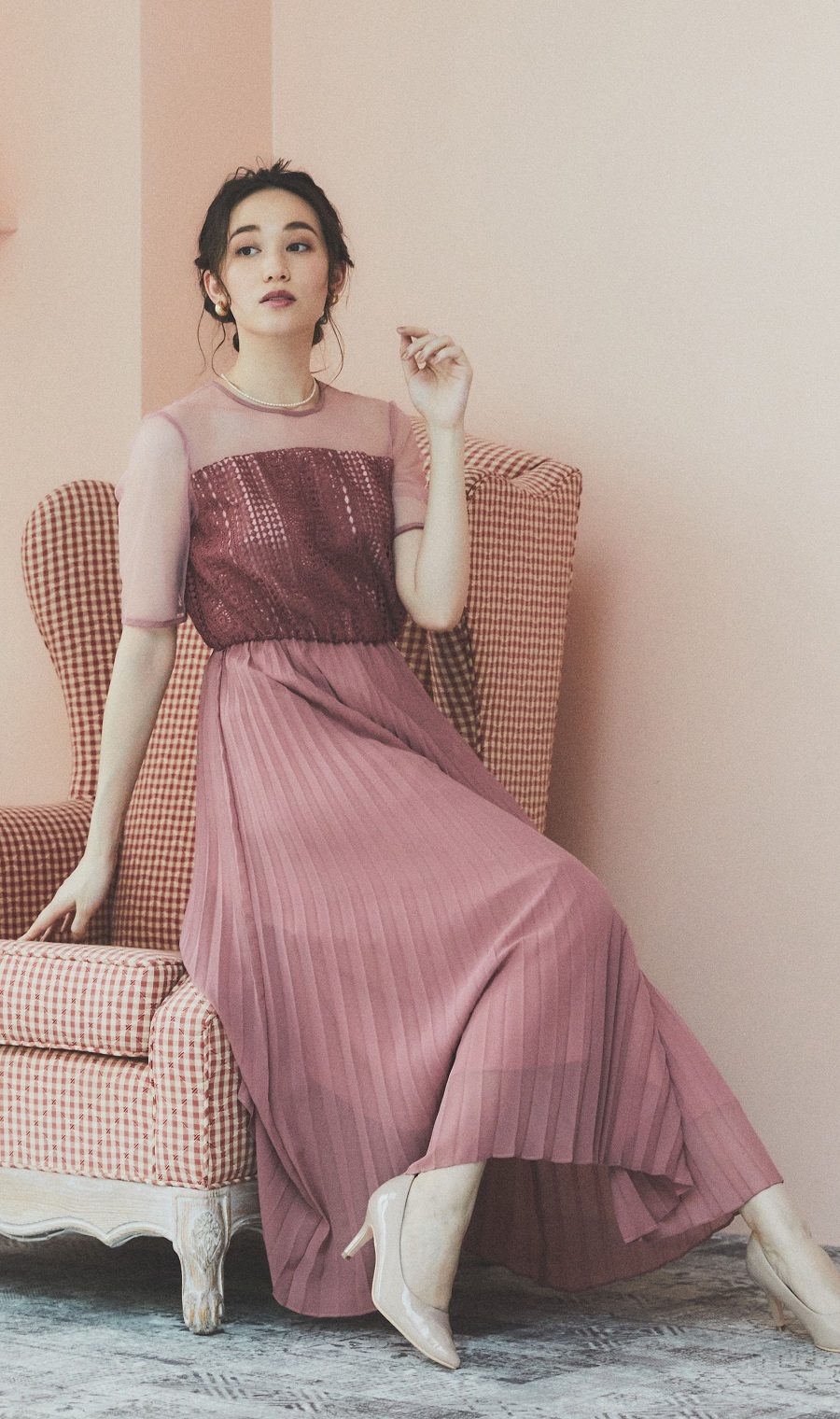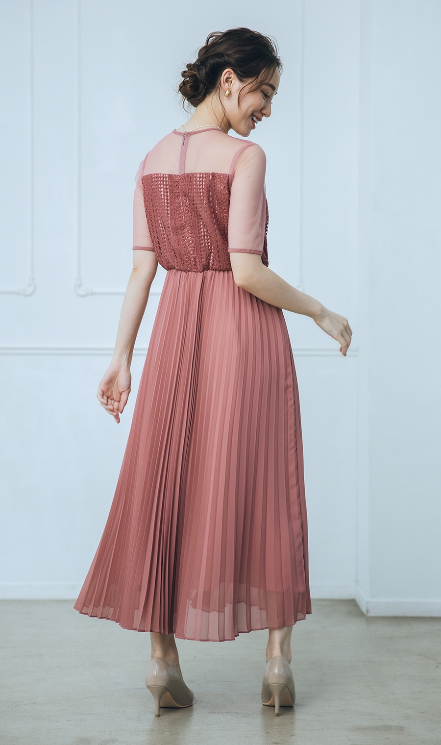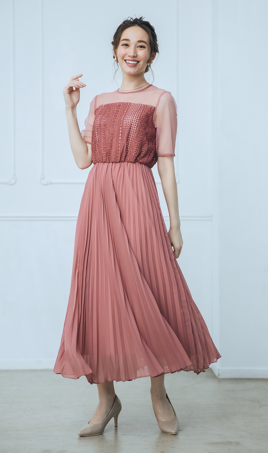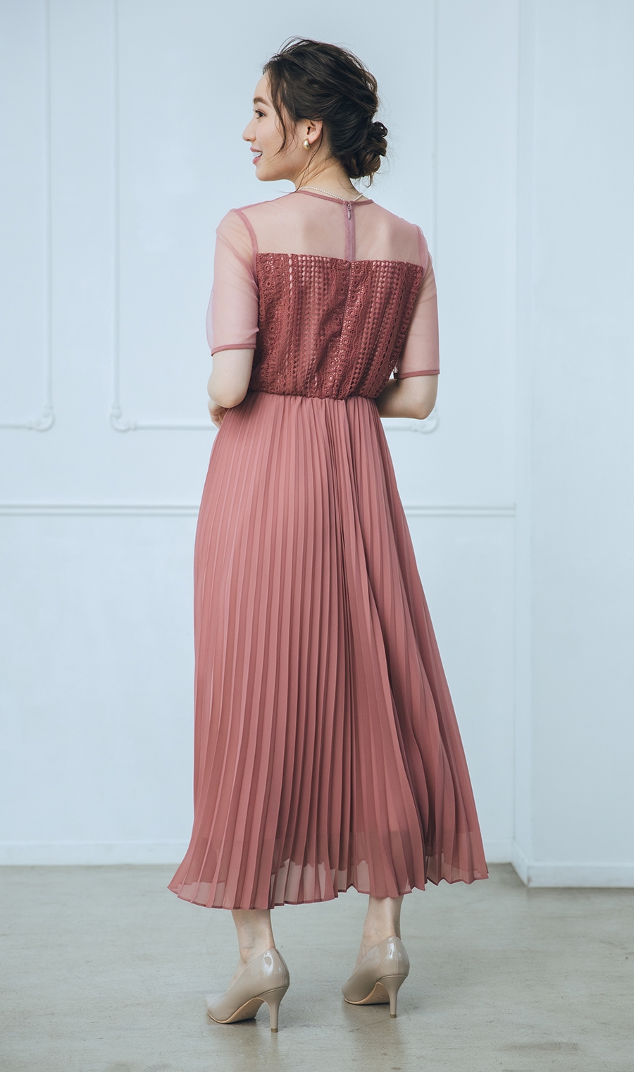 レースとシフォンの組み合わせが華やかなプリーツスカートドレス。