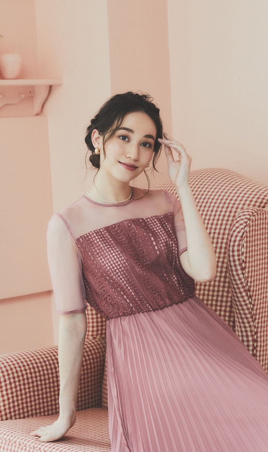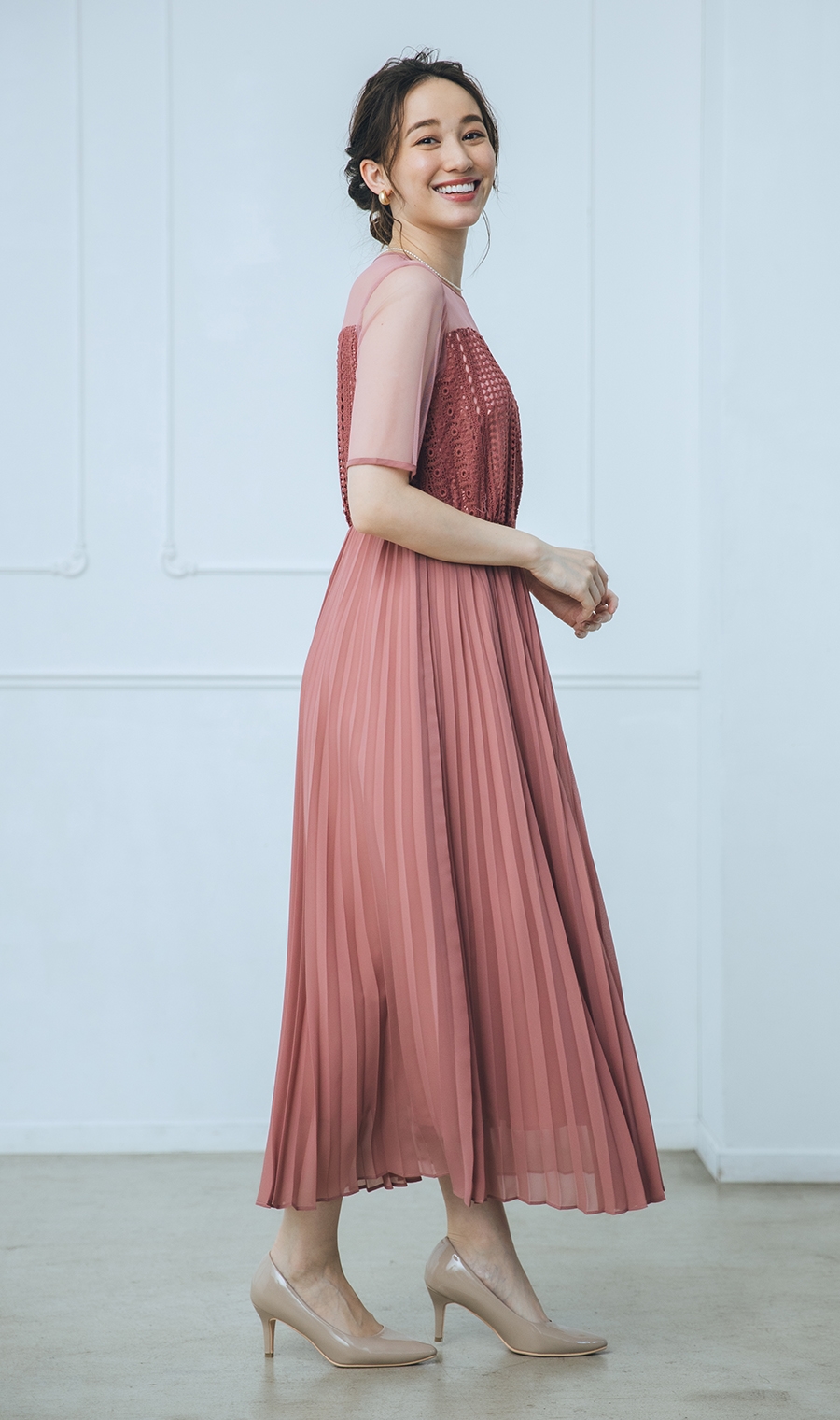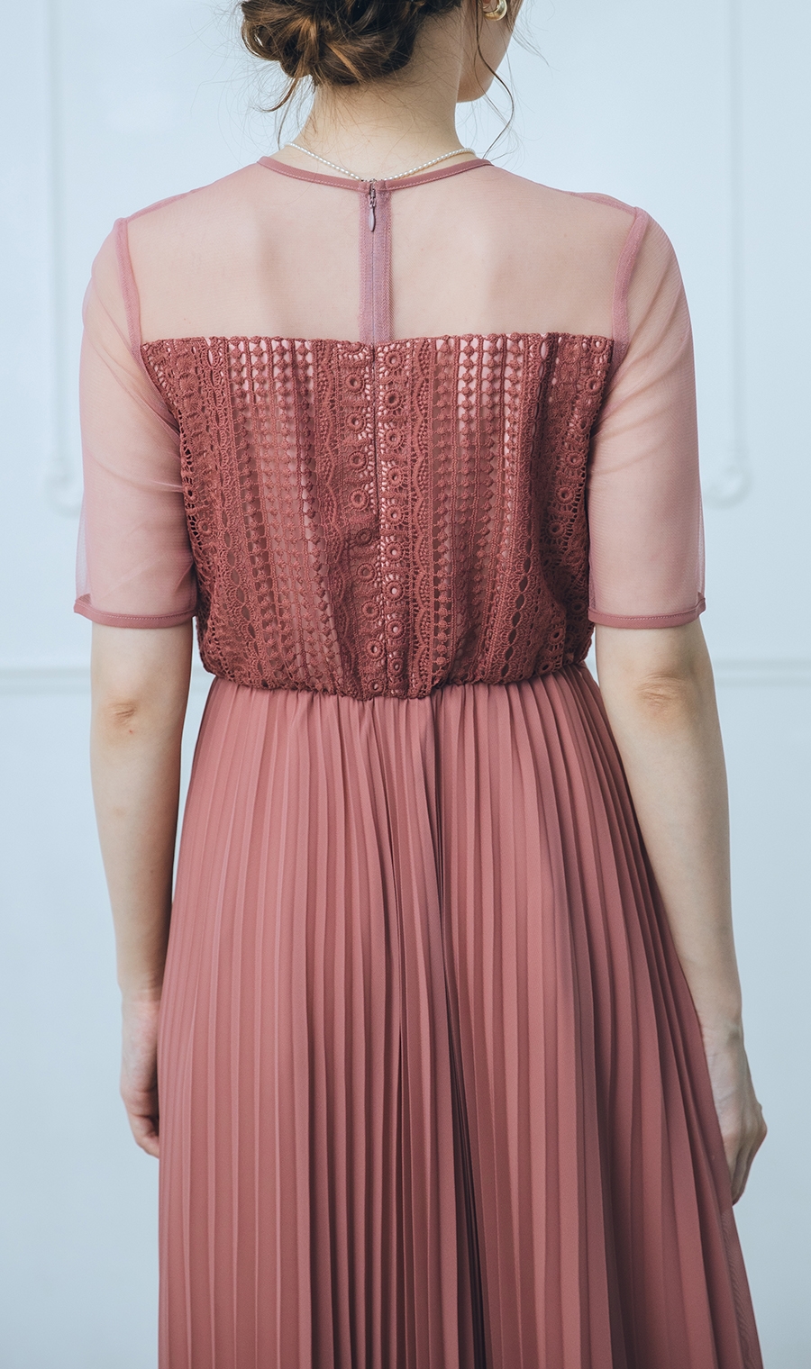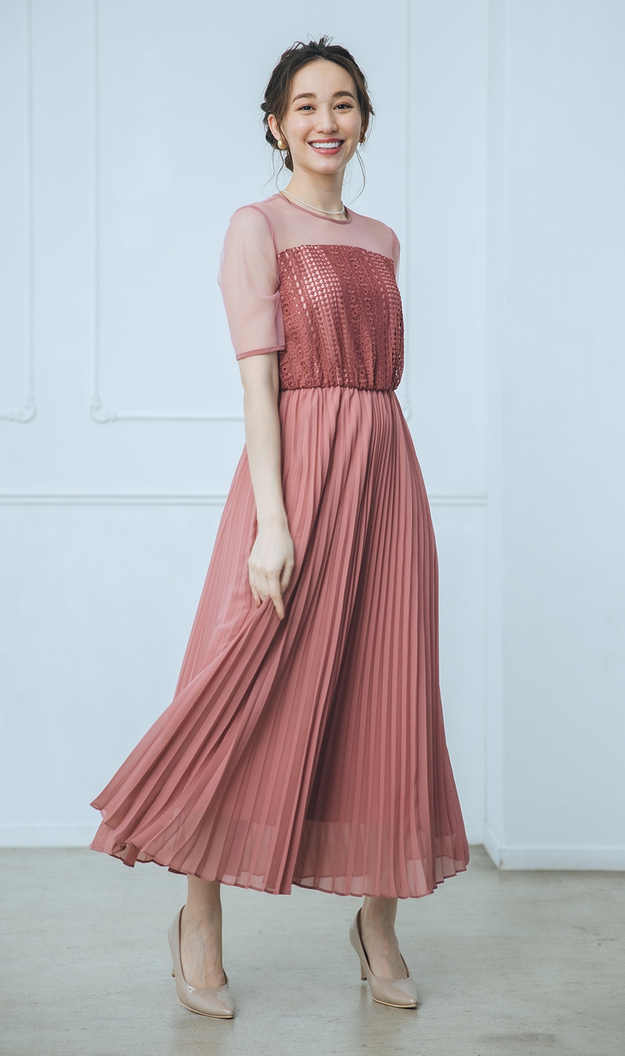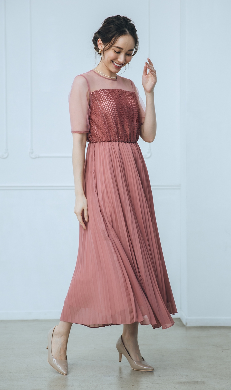 レースとシフォンの組み合わせが華やかなプリーツスカートドレス。