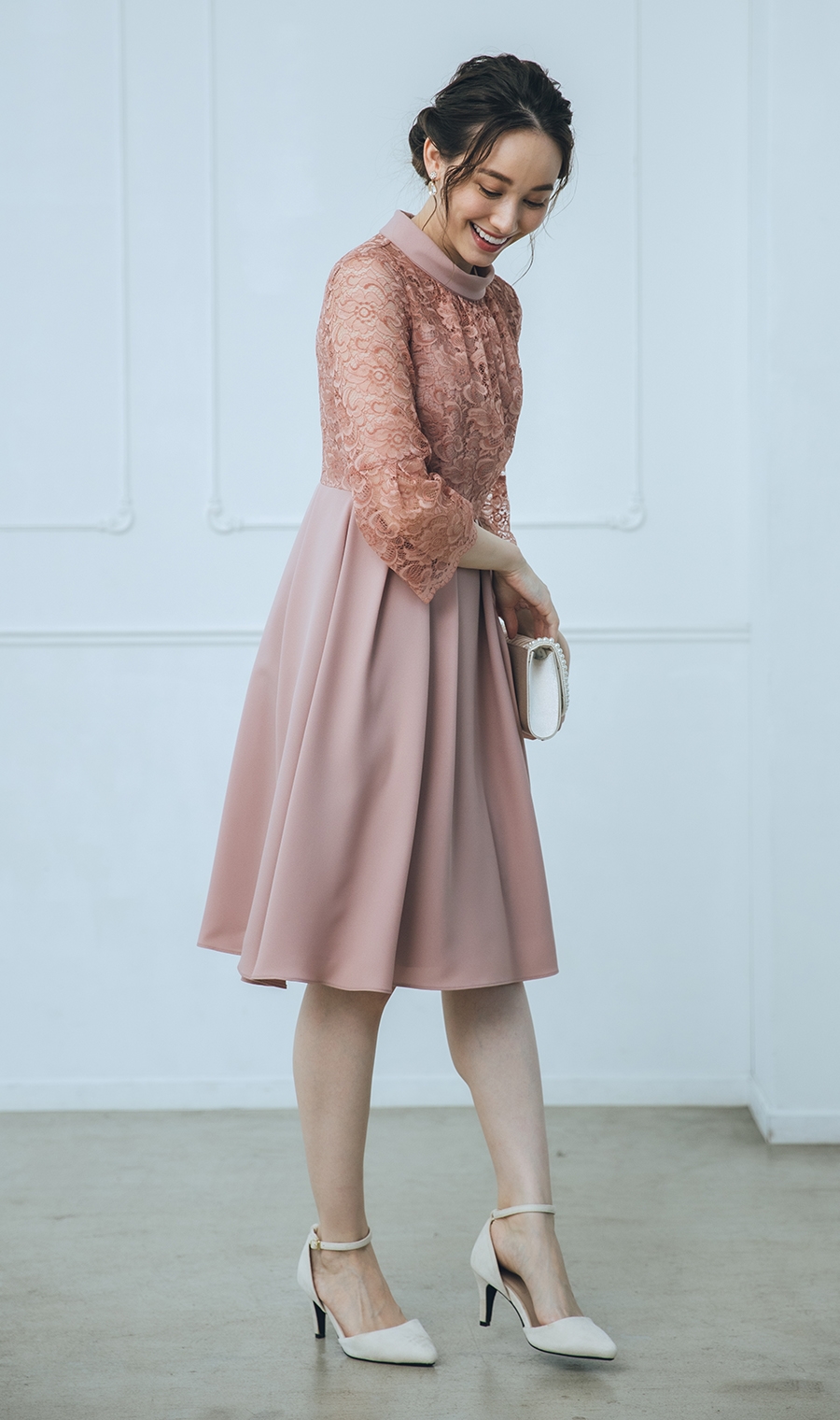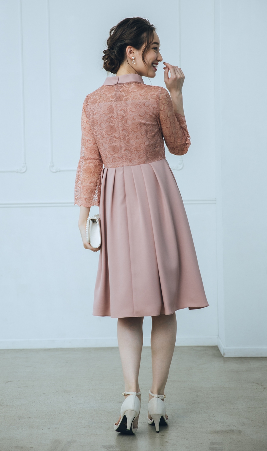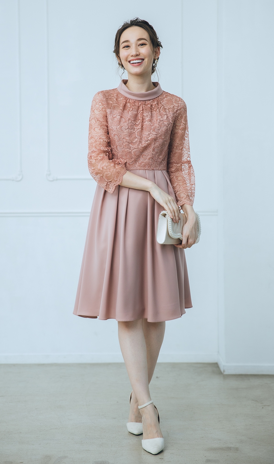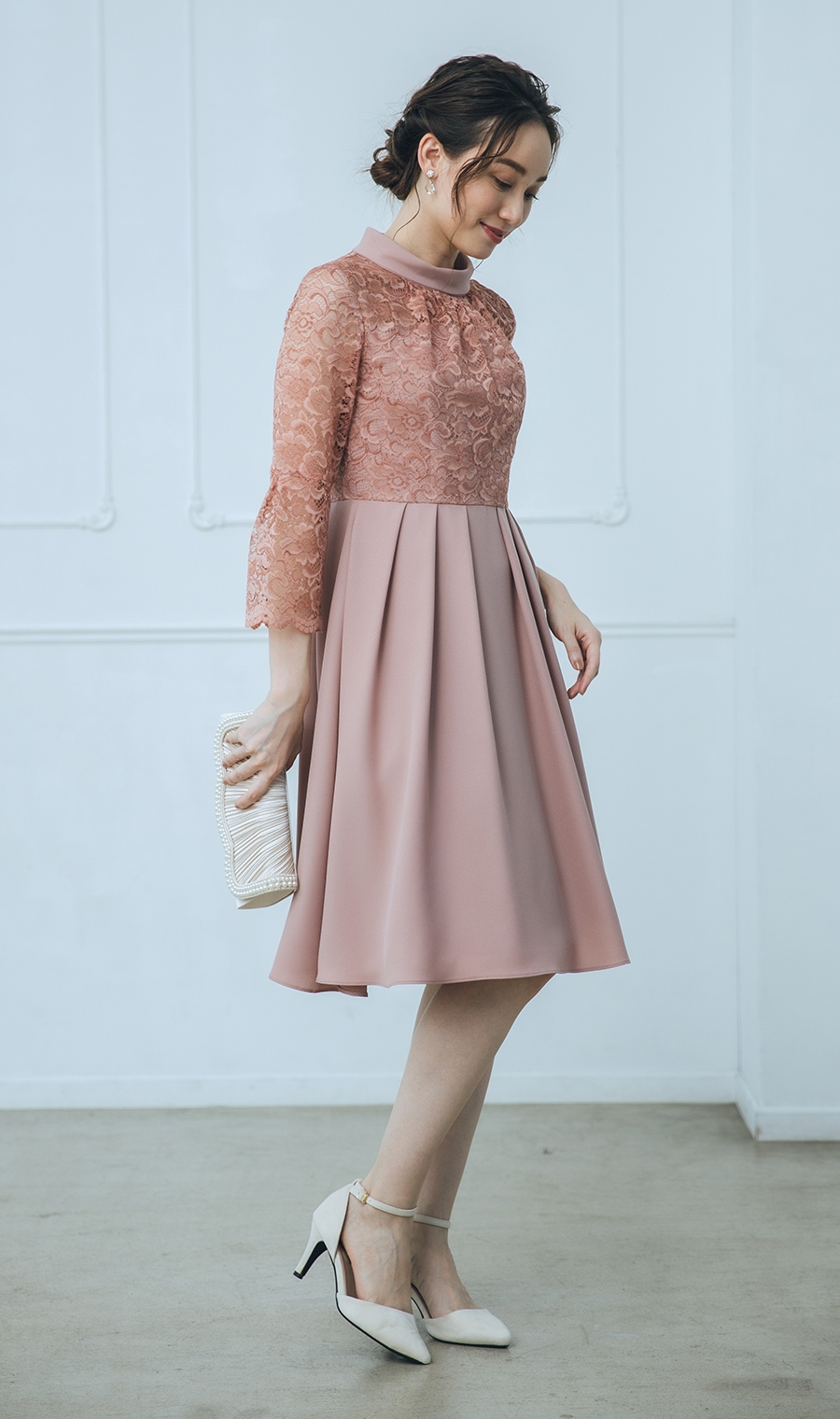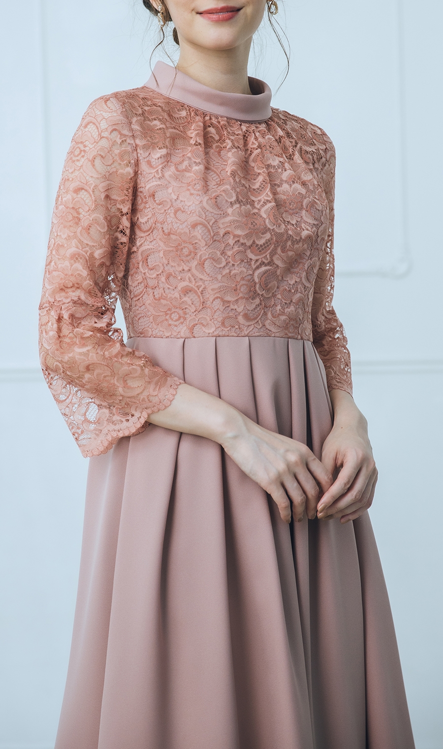 クラシカルなロールネックと透明感のあるレースが上品に調和したドレス。