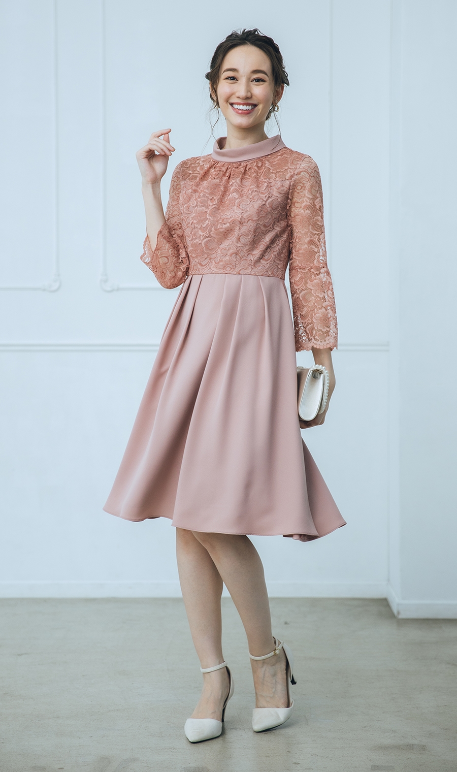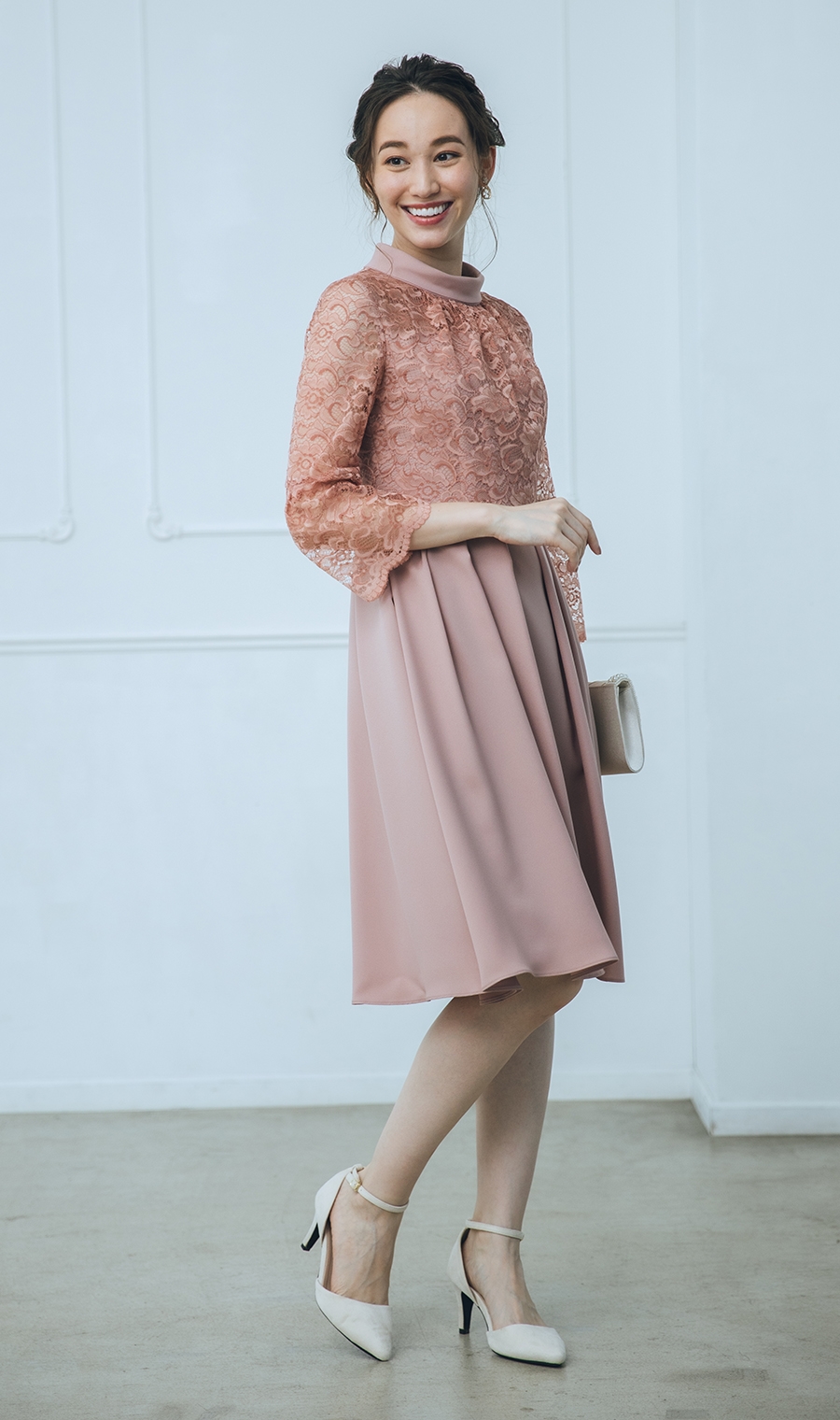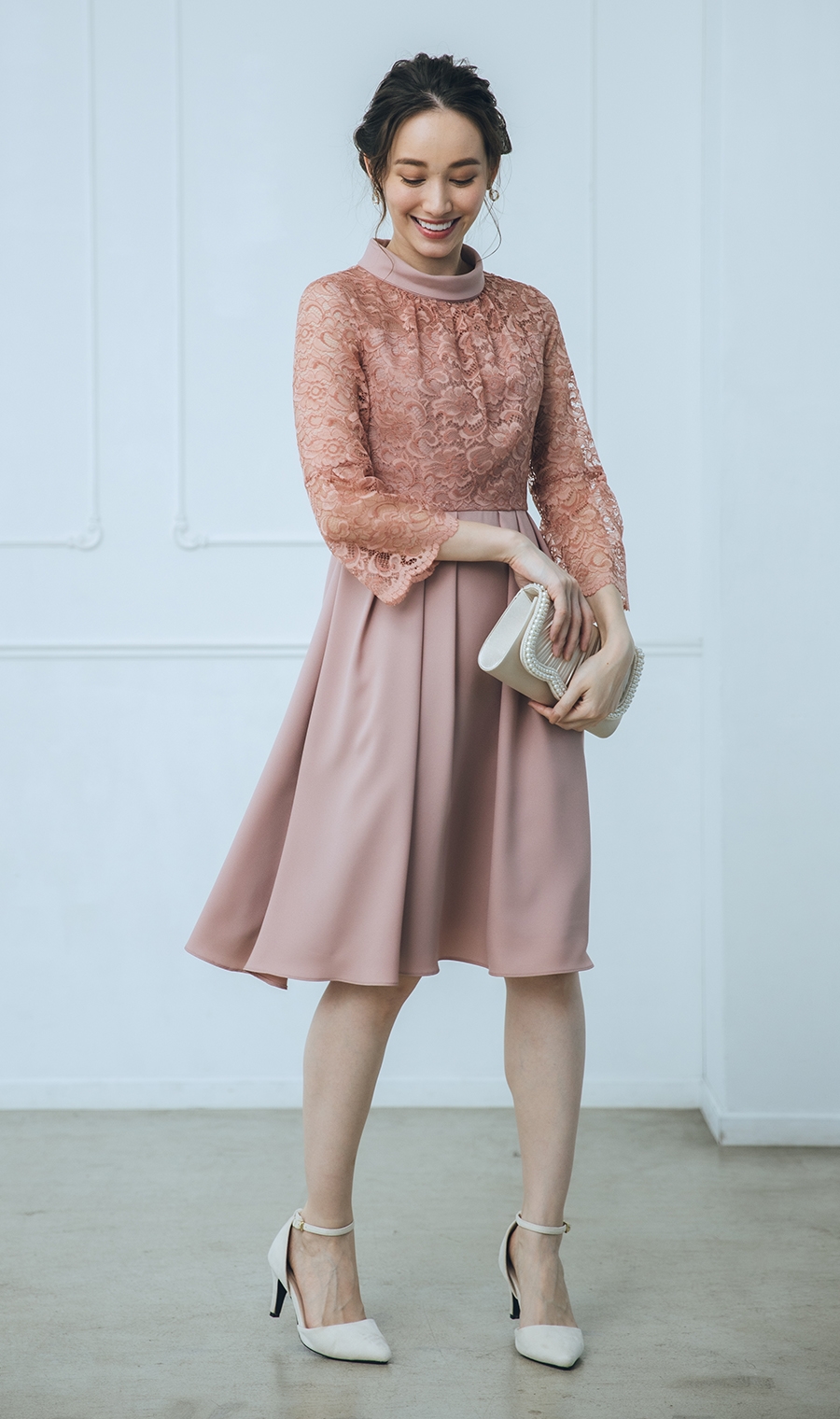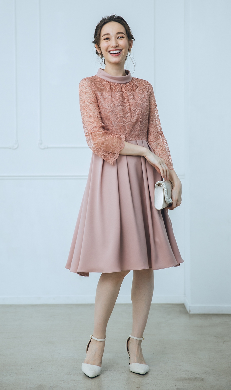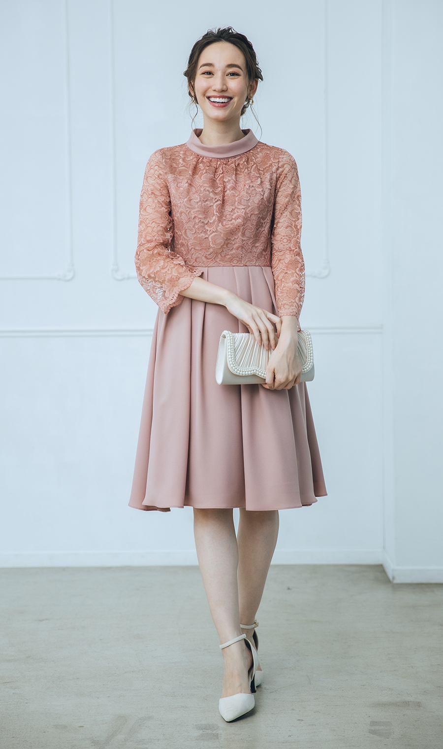 クラシカルなロールネックと透明感のあるレースが上品に調和したドレス。