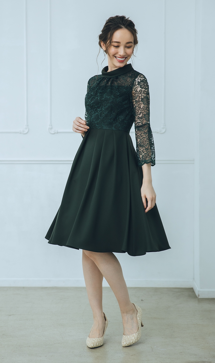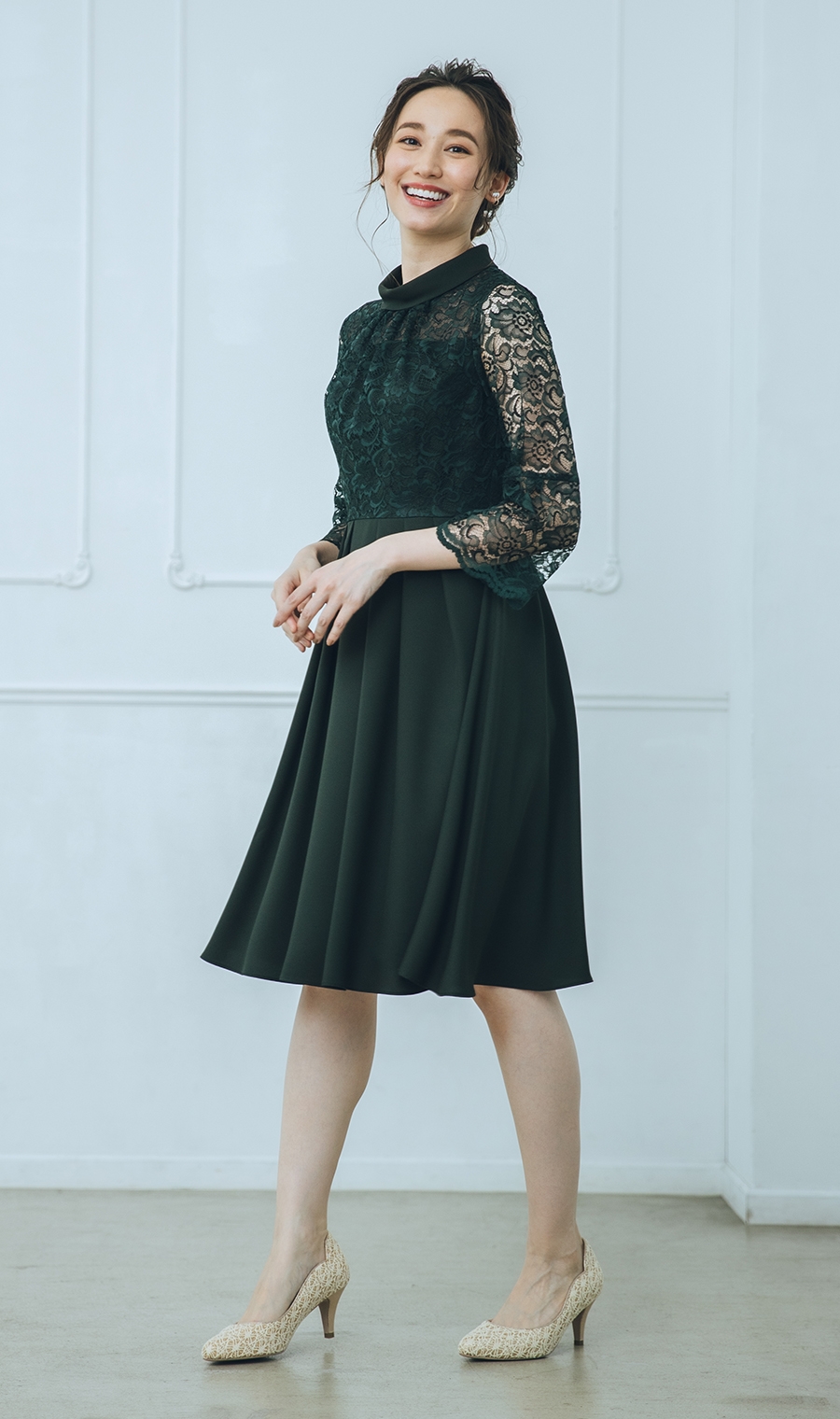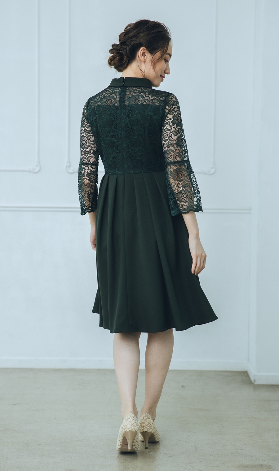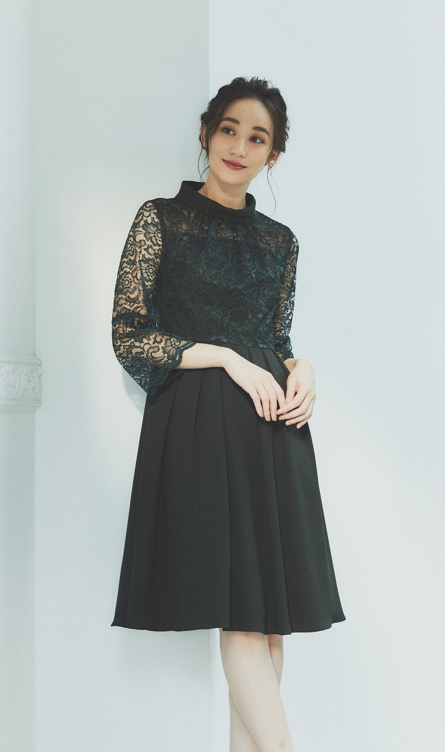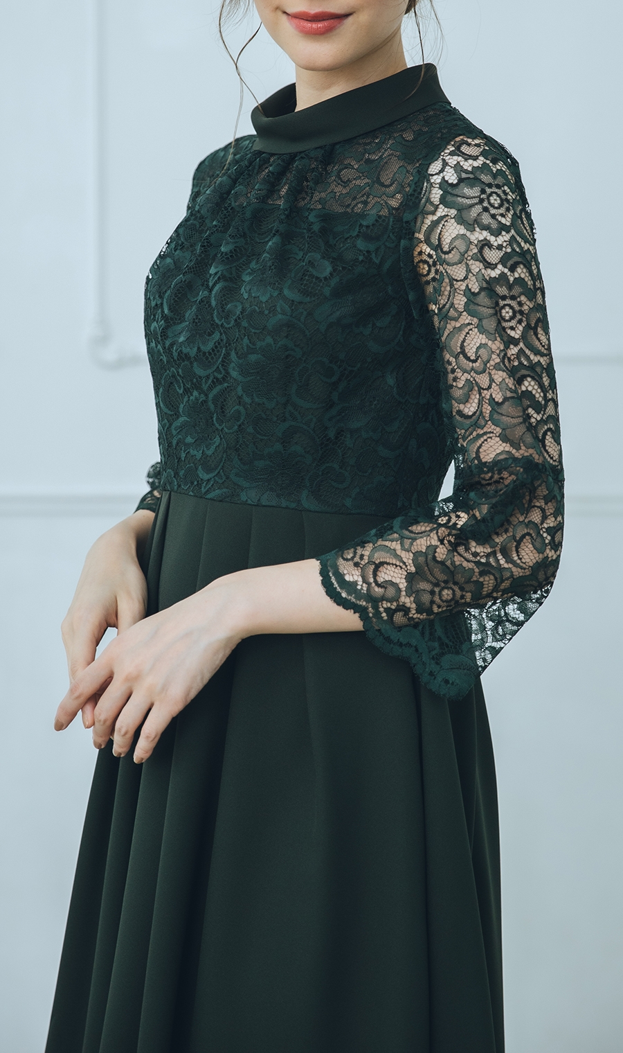 クラシカルなロールネックと透明感のあるレースが上品に調和したドレス。