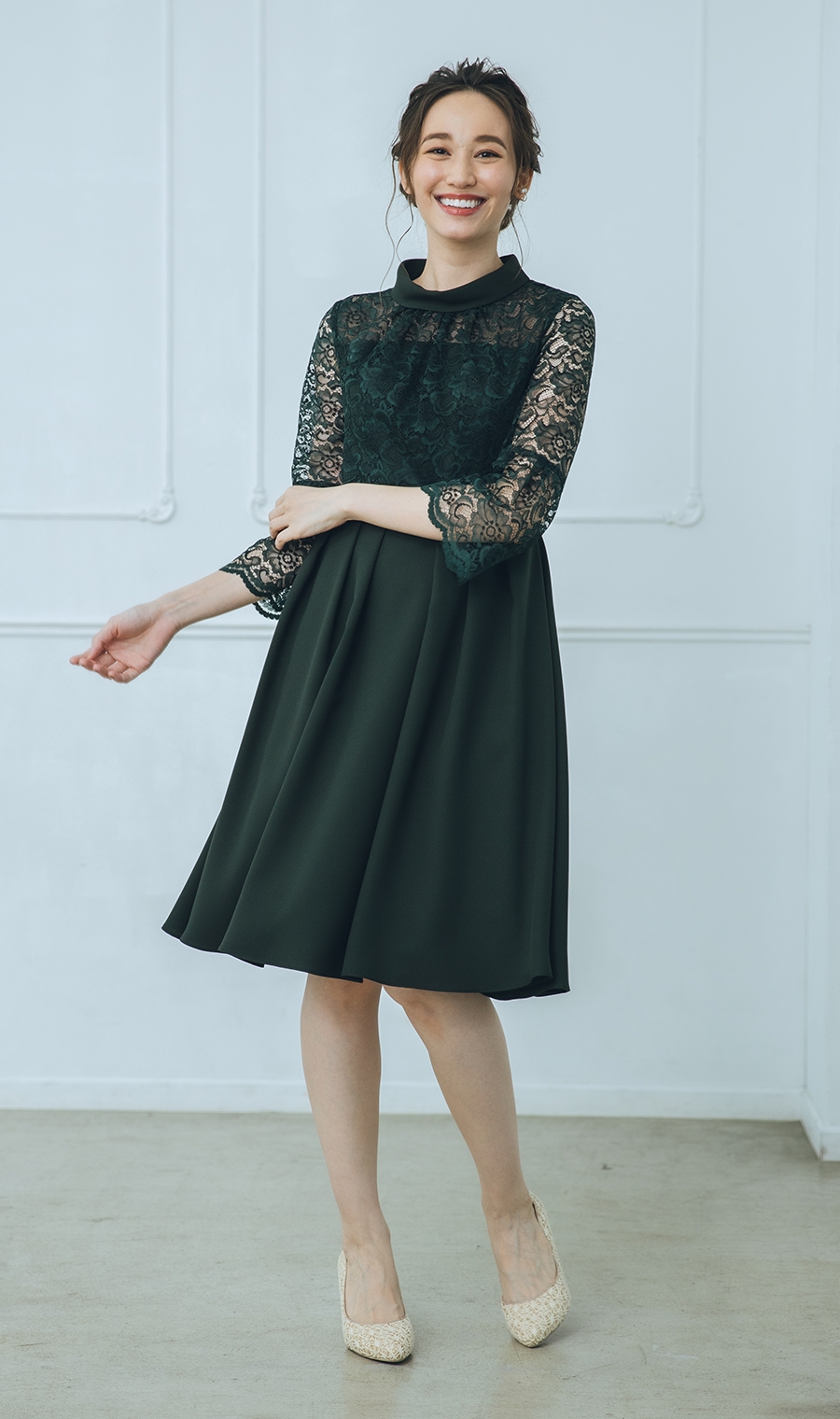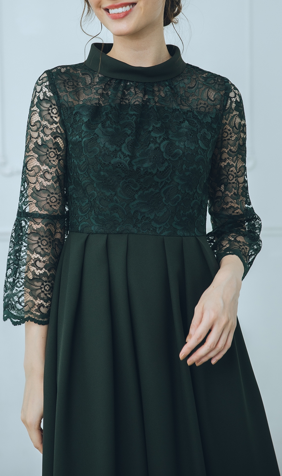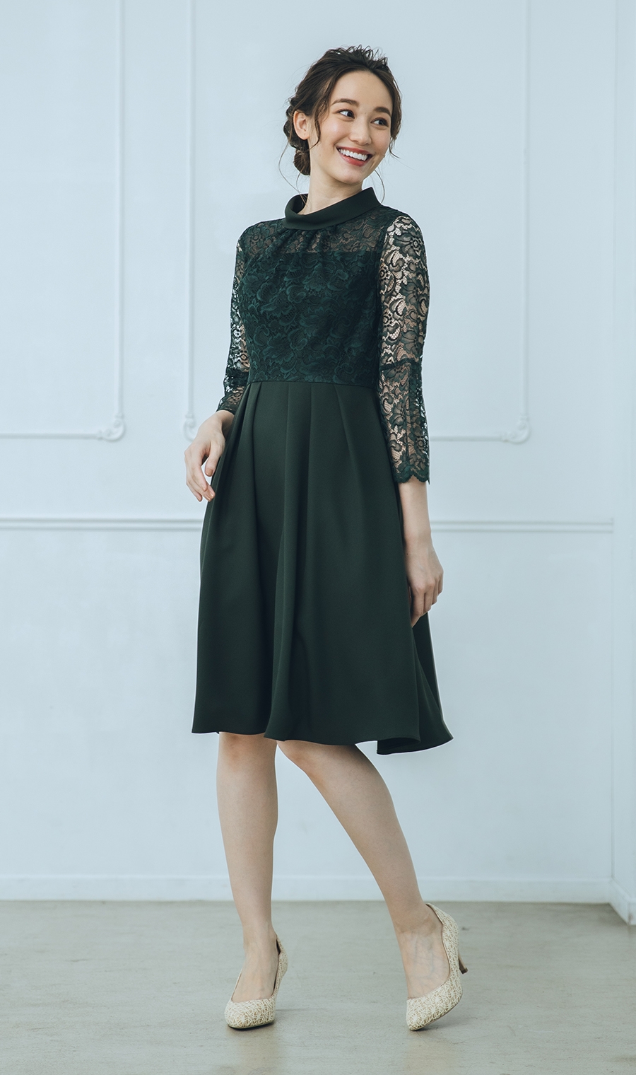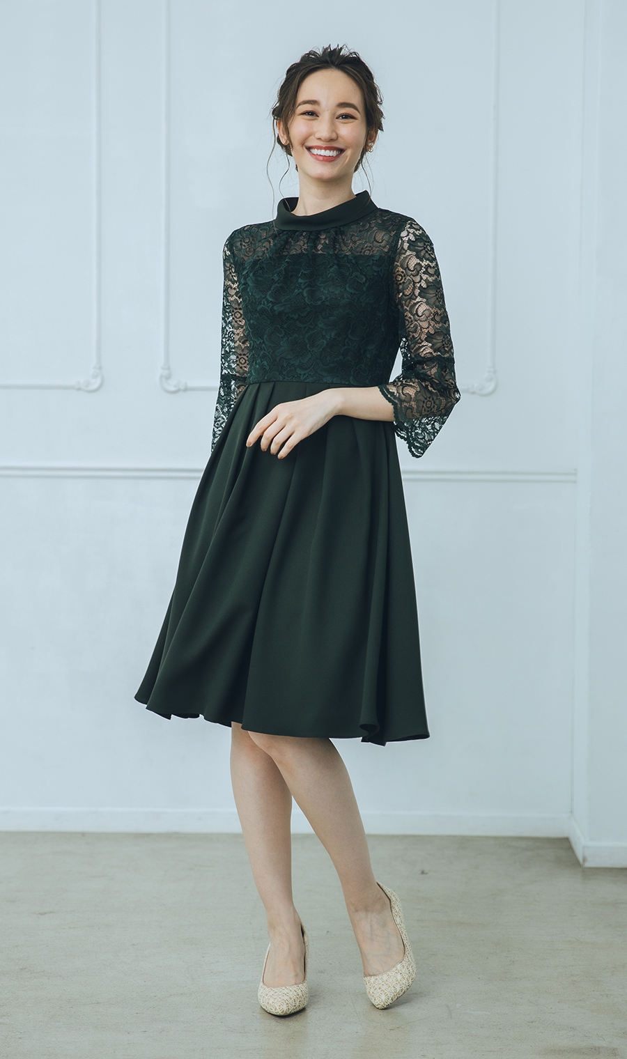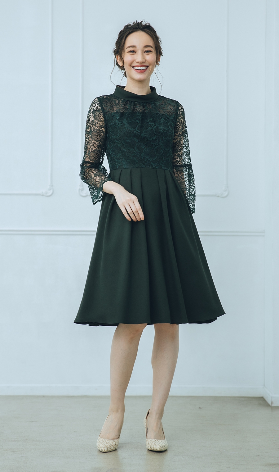 クラシカルなロールネックと透明感のあるレースが上品に調和したドレス。