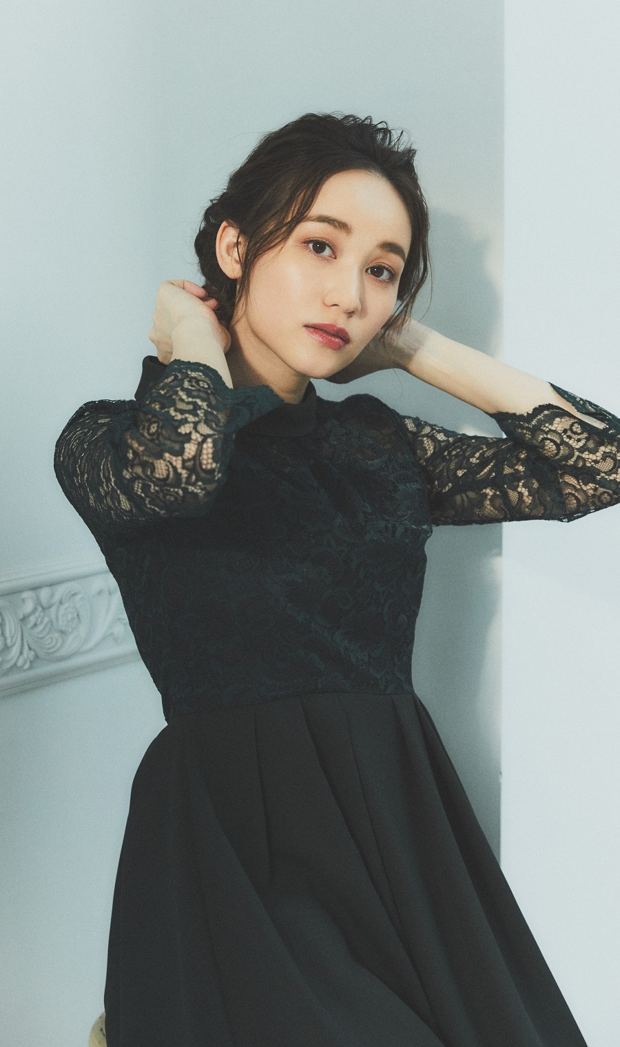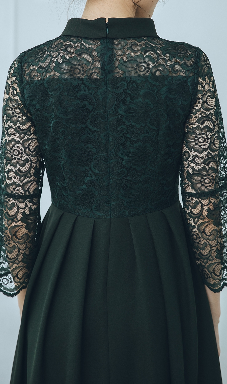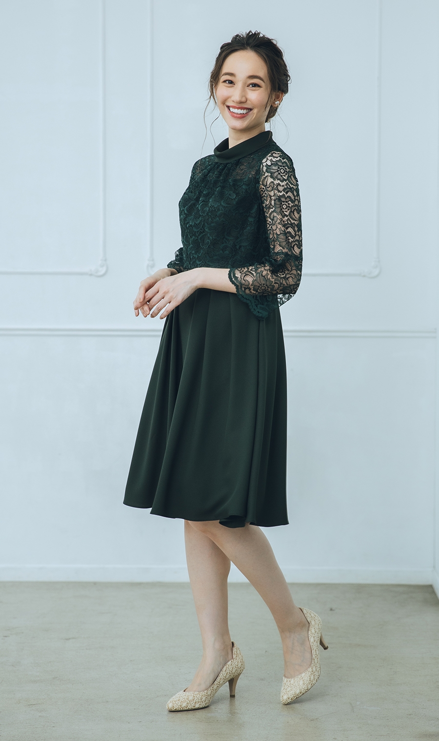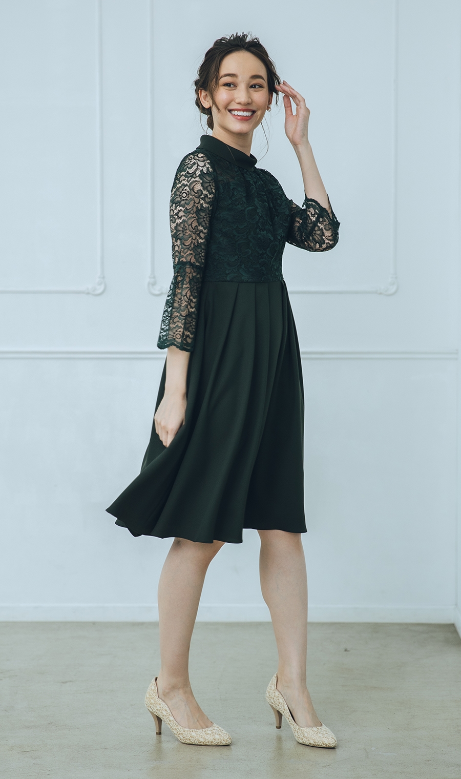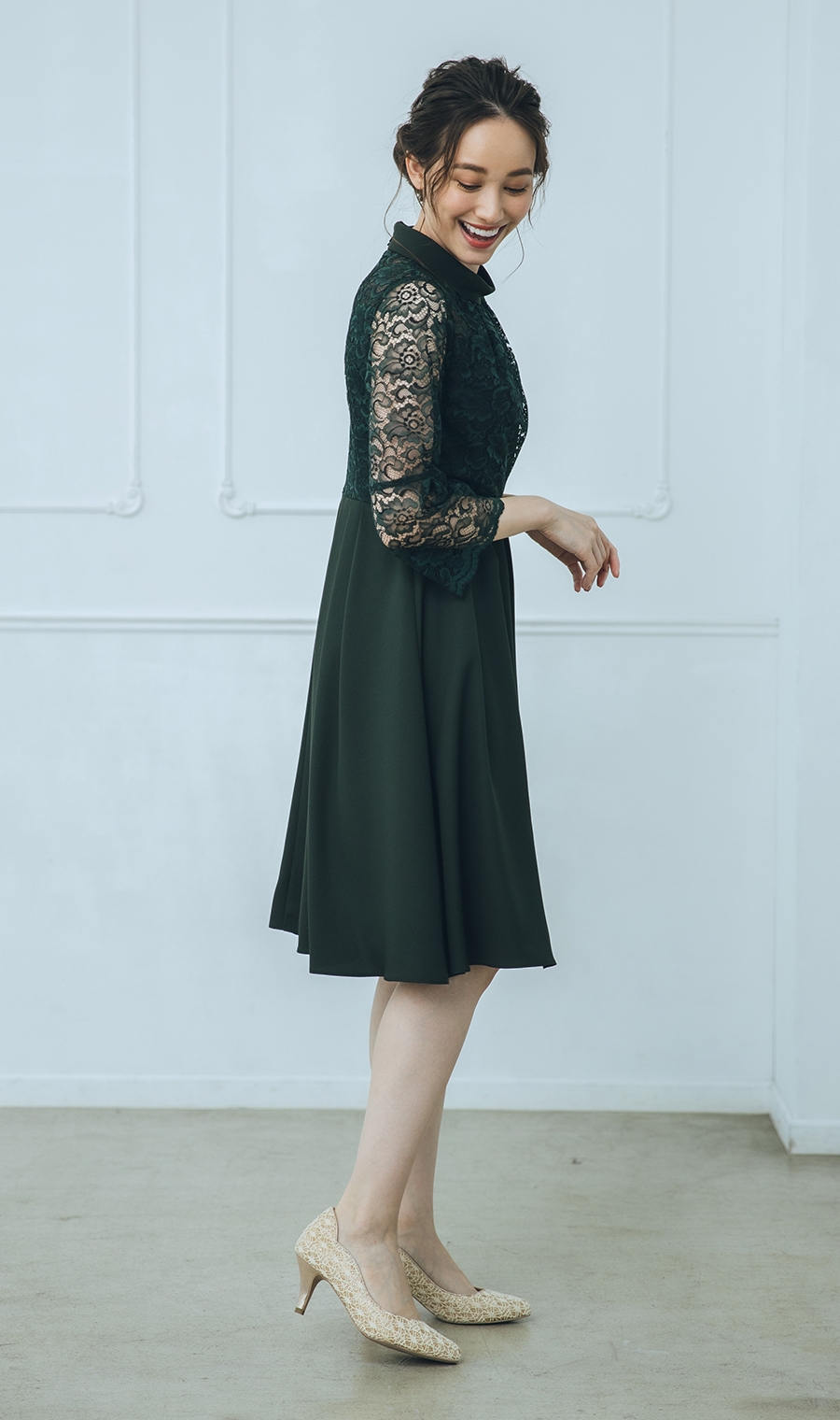 クラシカルなロールネックと透明感のあるレースが上品に調和したドレス。