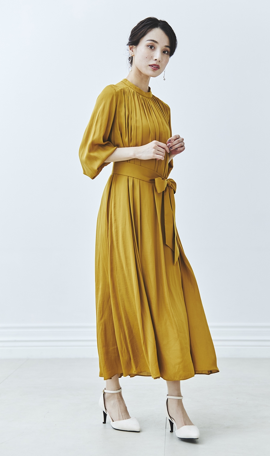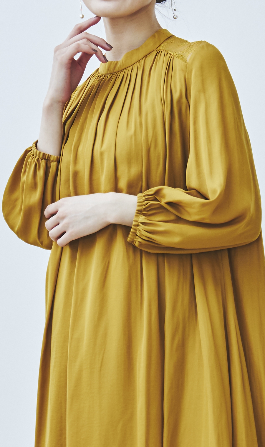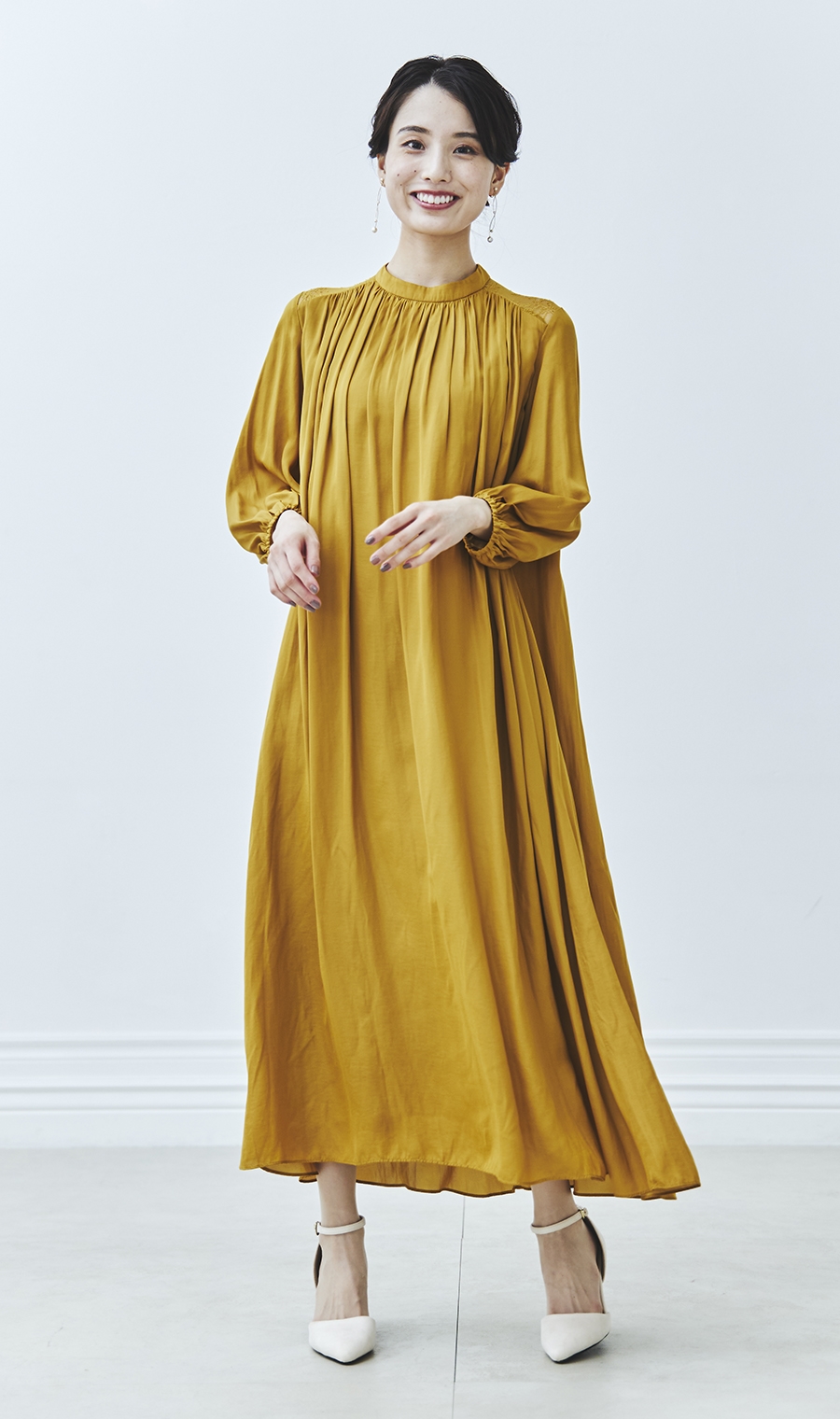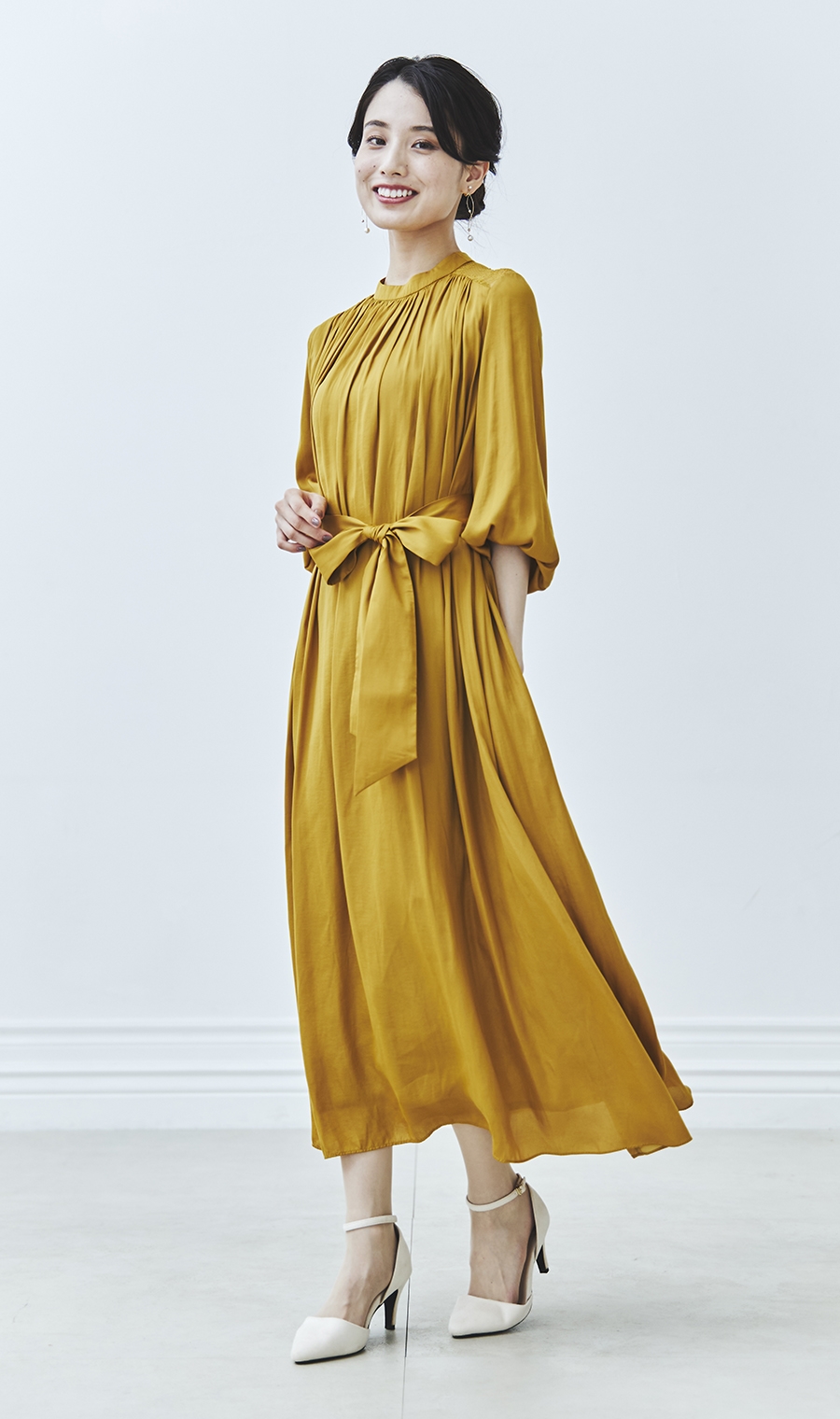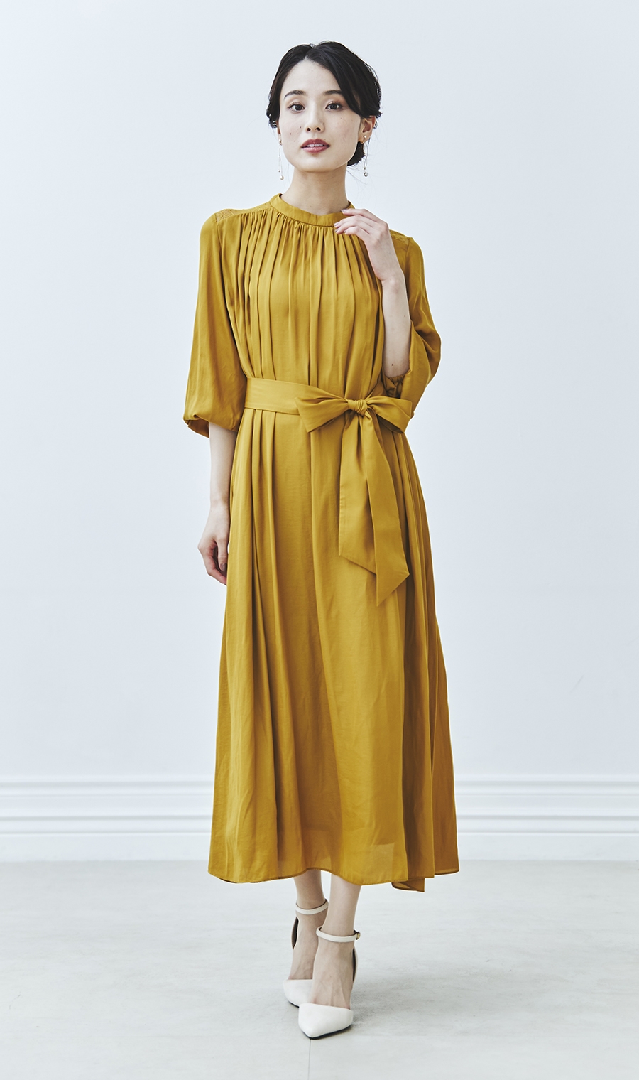 ギャザーを効かせた女性らしいシルエットで、華やかさと上品さを両立。