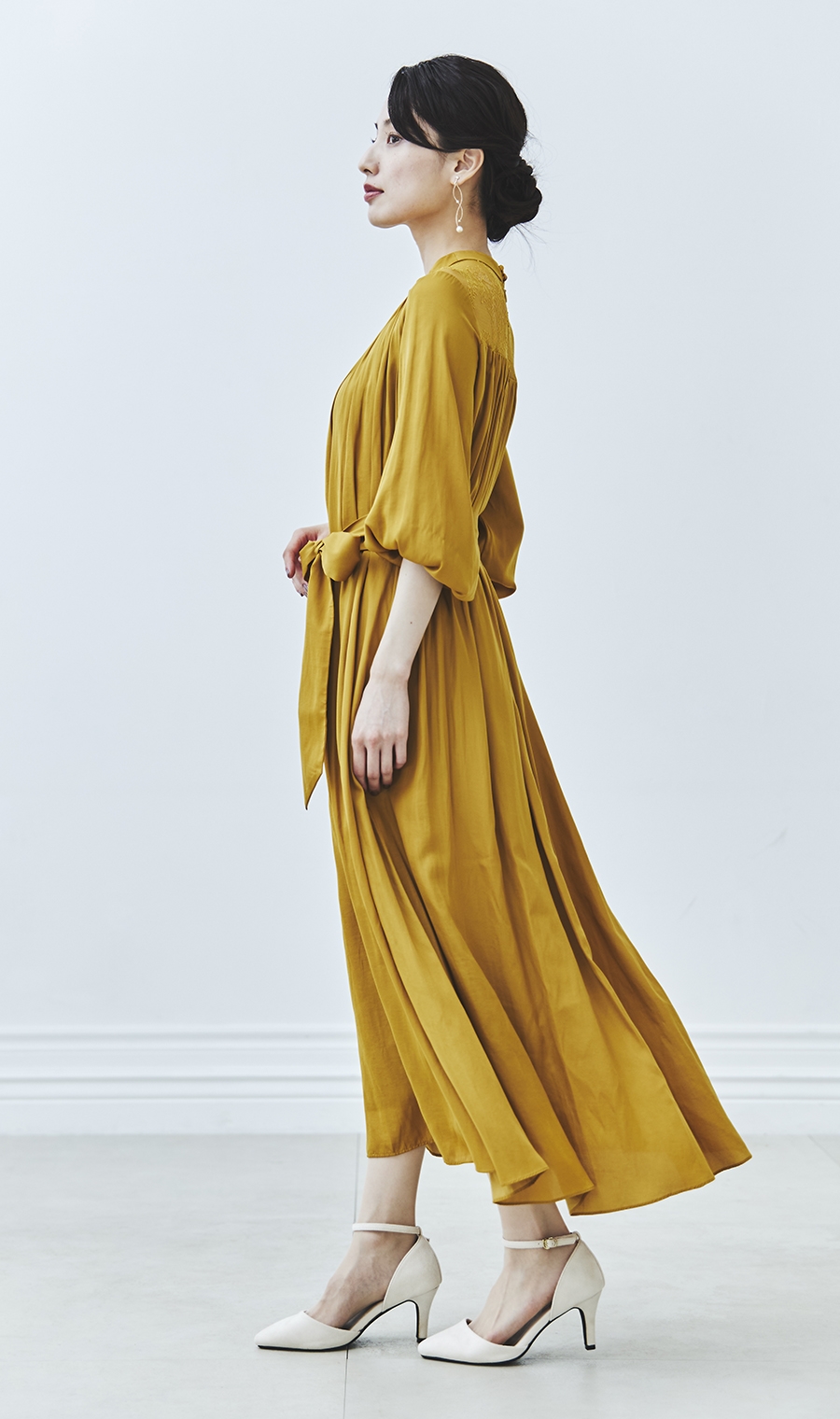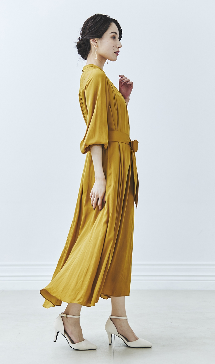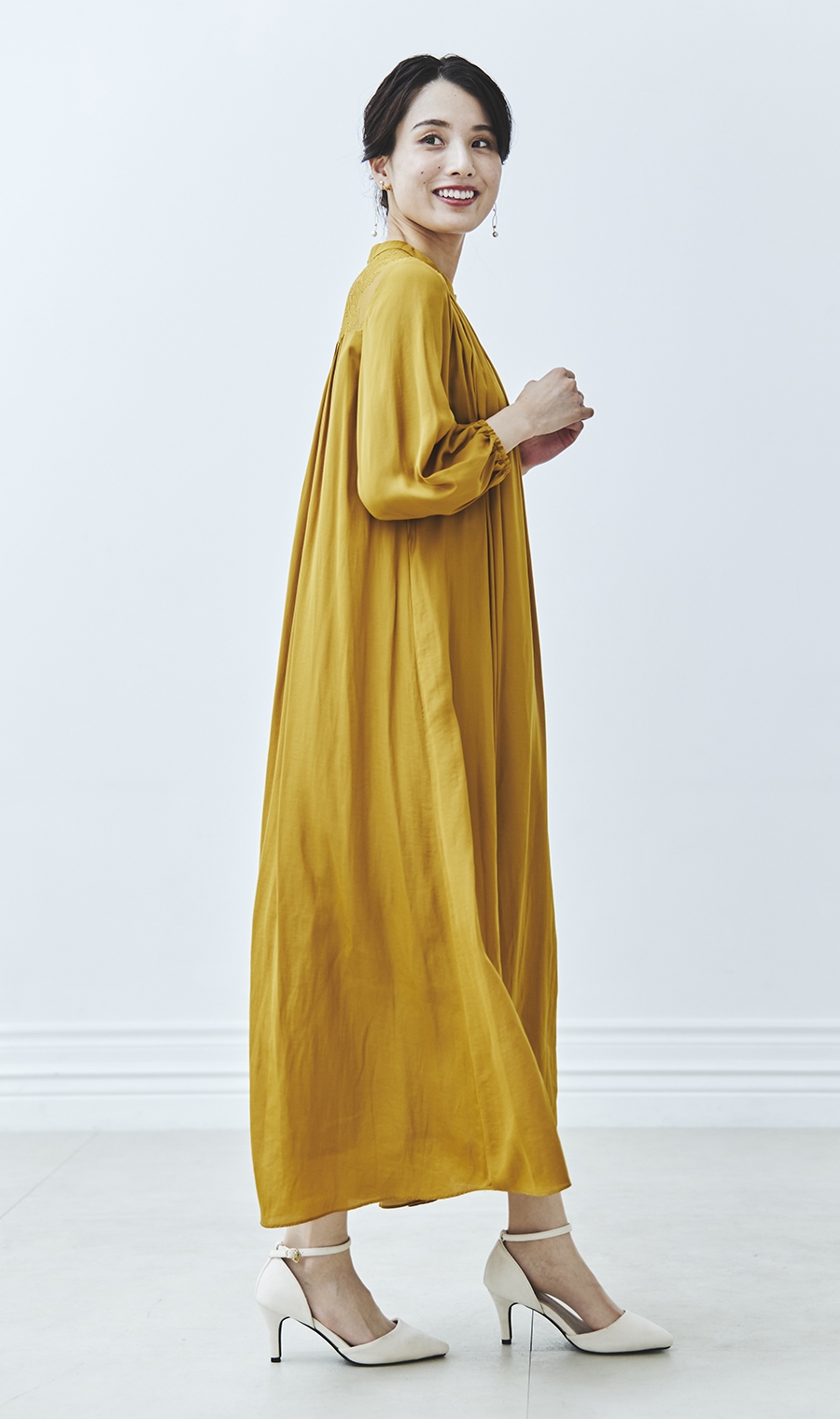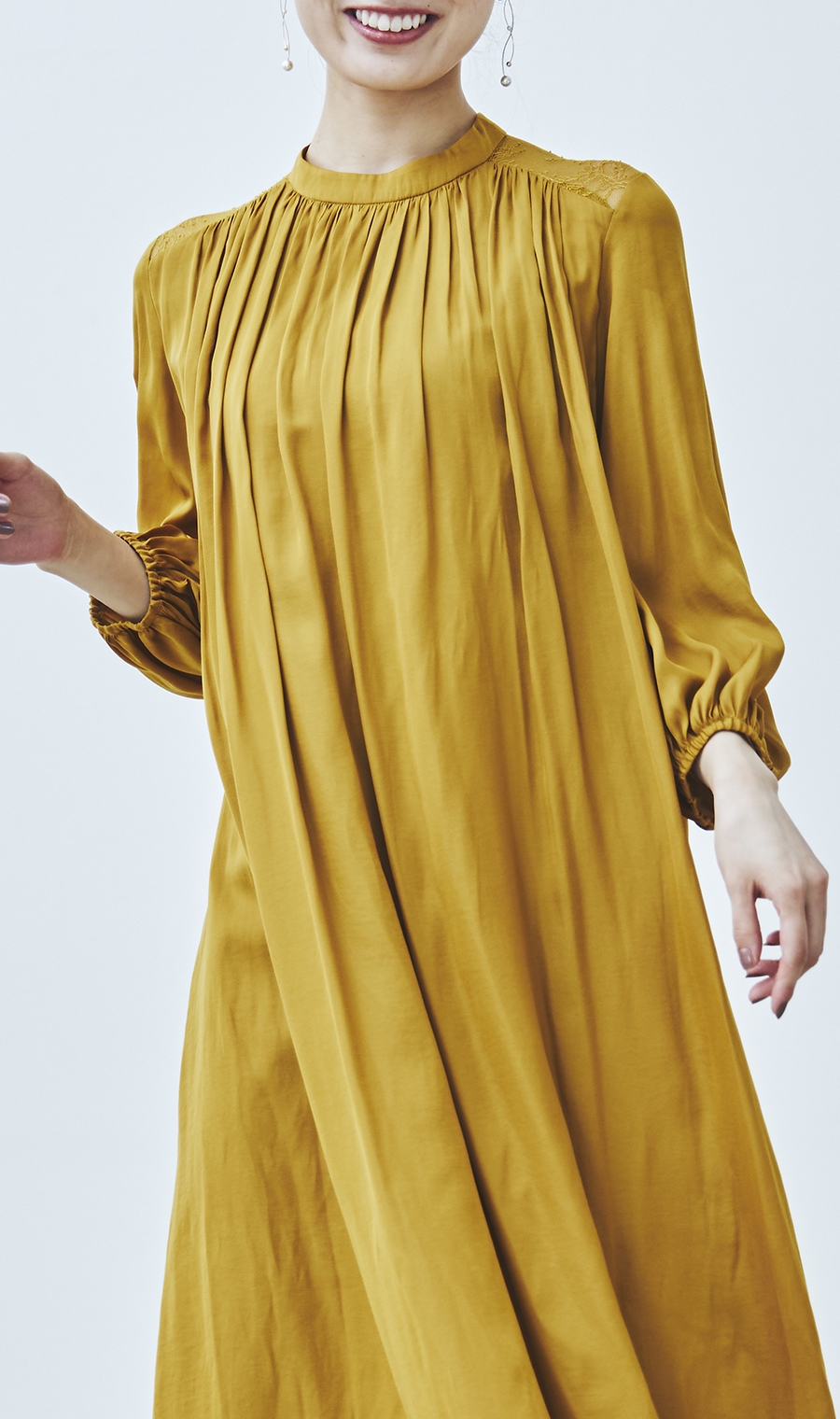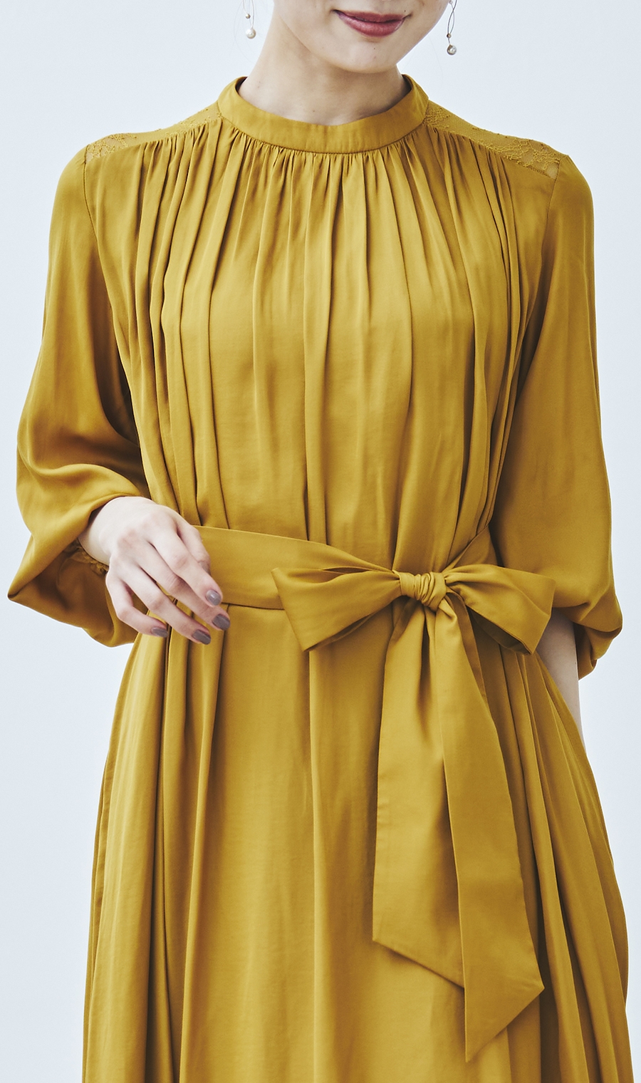ギャザーを効かせた女性らしいシルエットで、華やかさと上品さを両立。
