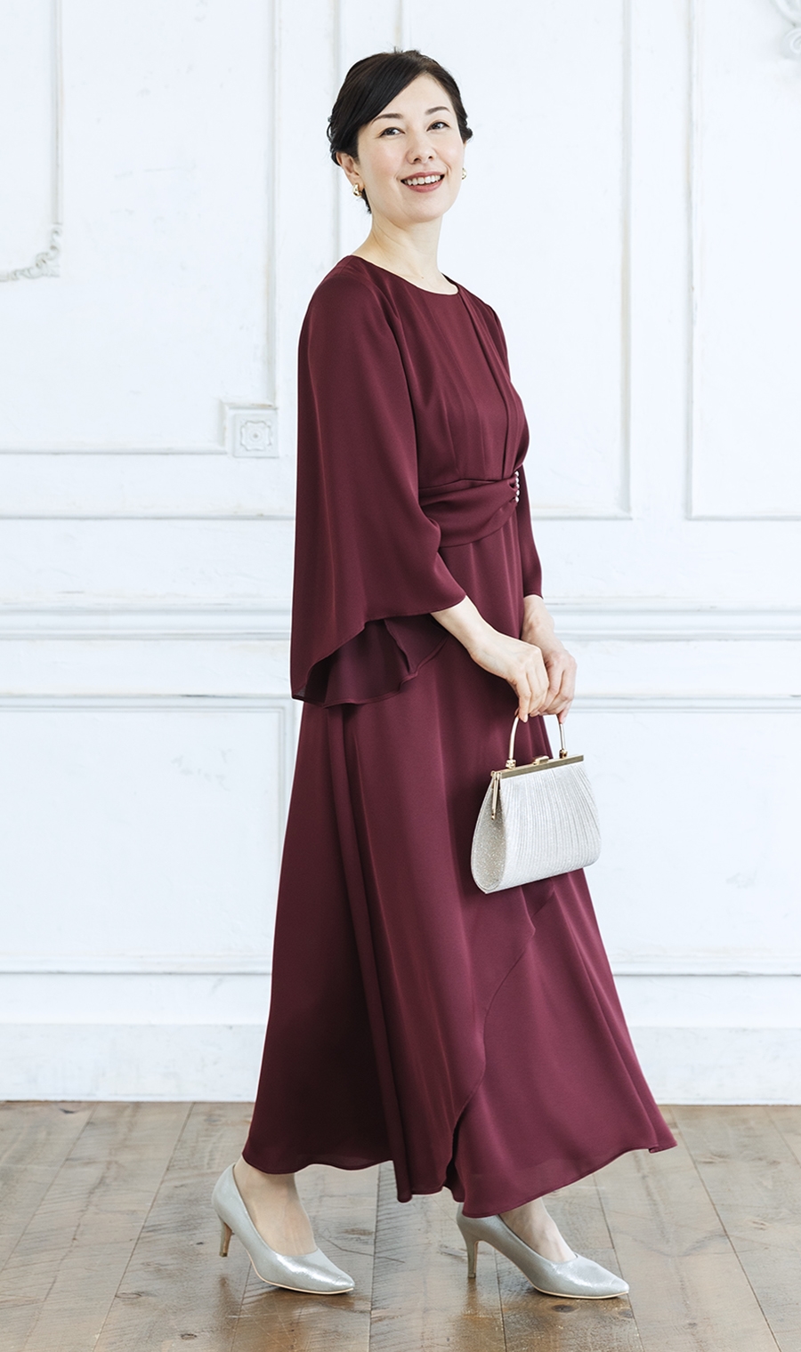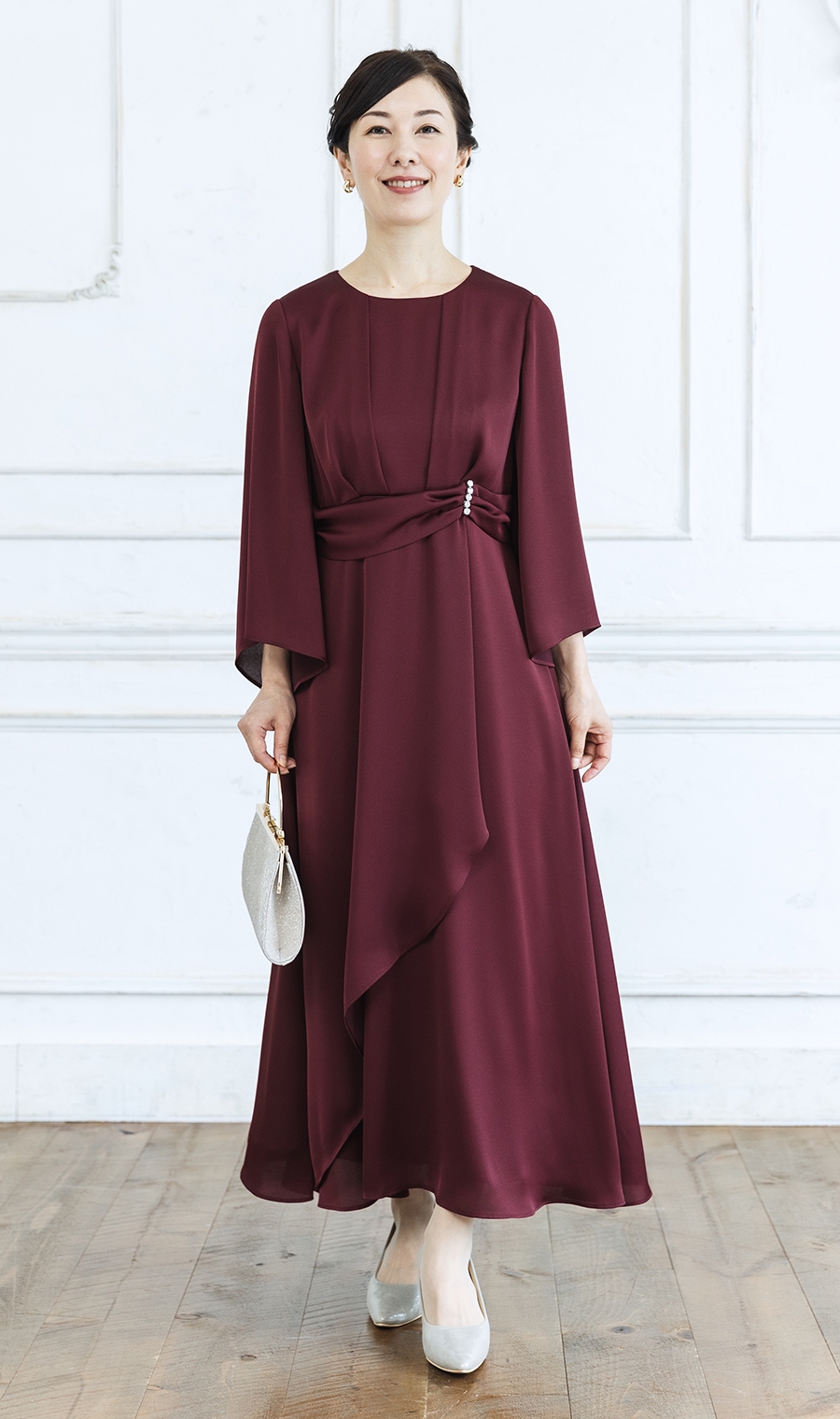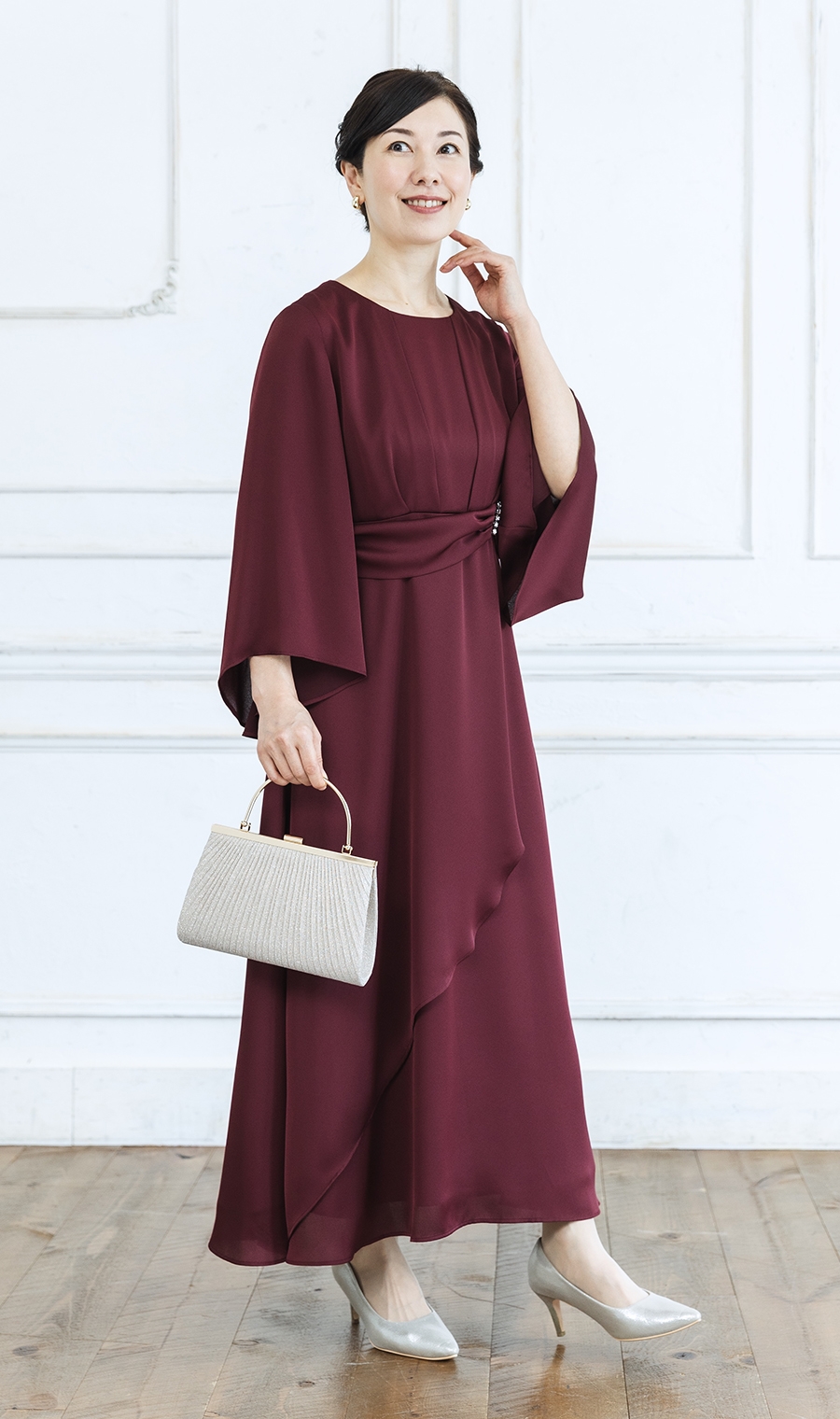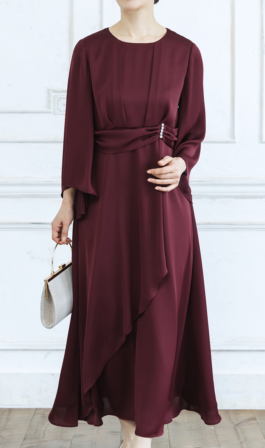 落ち感があるサテンジョーゼットが描く美しいドレープが目を惹くラップデザインのドレスです。